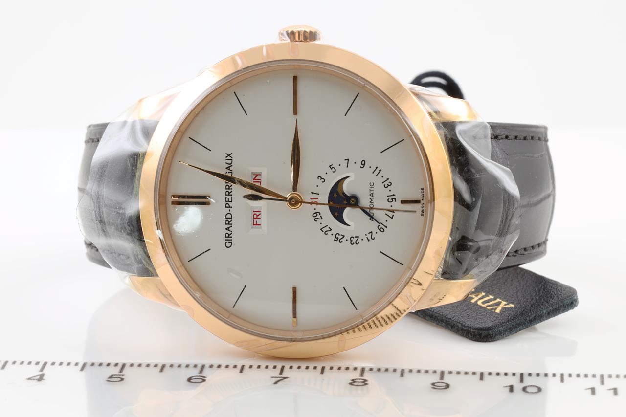 Girard Perregaux 1966 Moon Phase 18ct rose gold automatic mens watch. Silver dial, month, day & date, case diameter: 41mm, Swiss made. Ref# 49535-52-151-BK6A. With Girard Perregaux black leather strap and 18ct gold clasp. With Girard Perregaux international warranty card and instruction manual inside box. 2 year manufacturer warranty from 24/11/20. (New, in original wrapping)