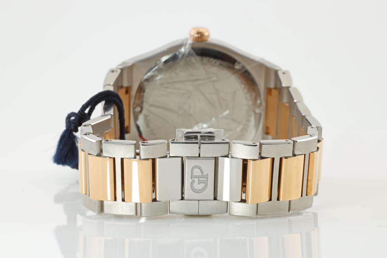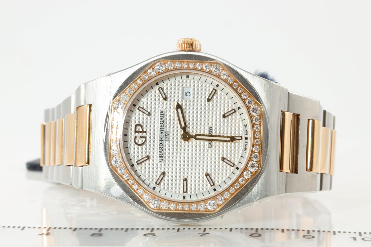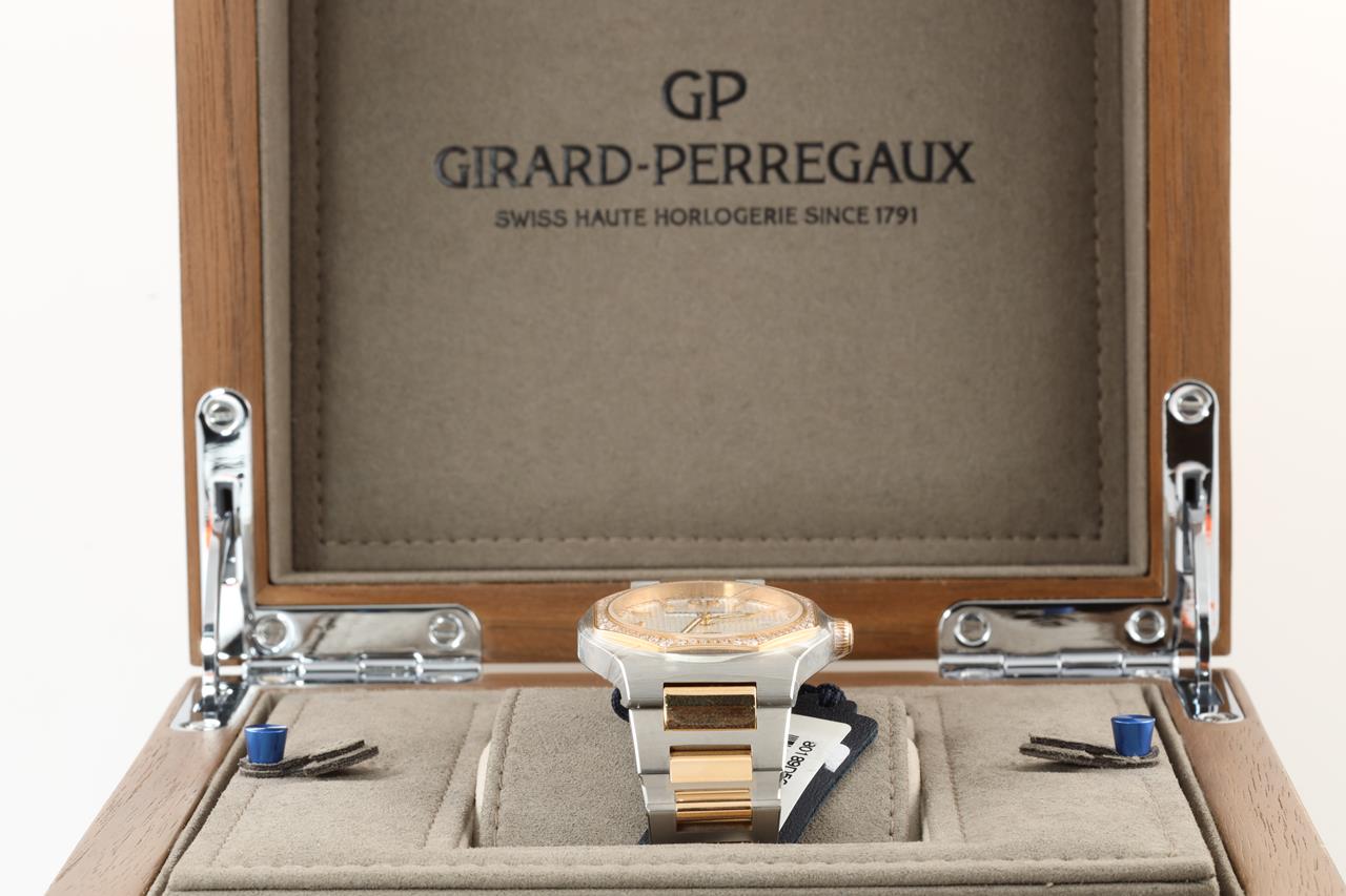 Girard Perregaux Laureato 18ct rose gold and stainless steel quartz watch. Silver with a Clou de Paris pattern dial, date, Diamond set bezel, case diameter: 34mm, Swiss made. Ref# 80189D56A132-56A. With Girard Perregaux two-tone bracelet and clasp. With Girard Perregaux international warranty card, Jewellery certificate and instruction manual inside box. 2 year manufacturer warranty from 24/11/20. (New, in original wrapping)
