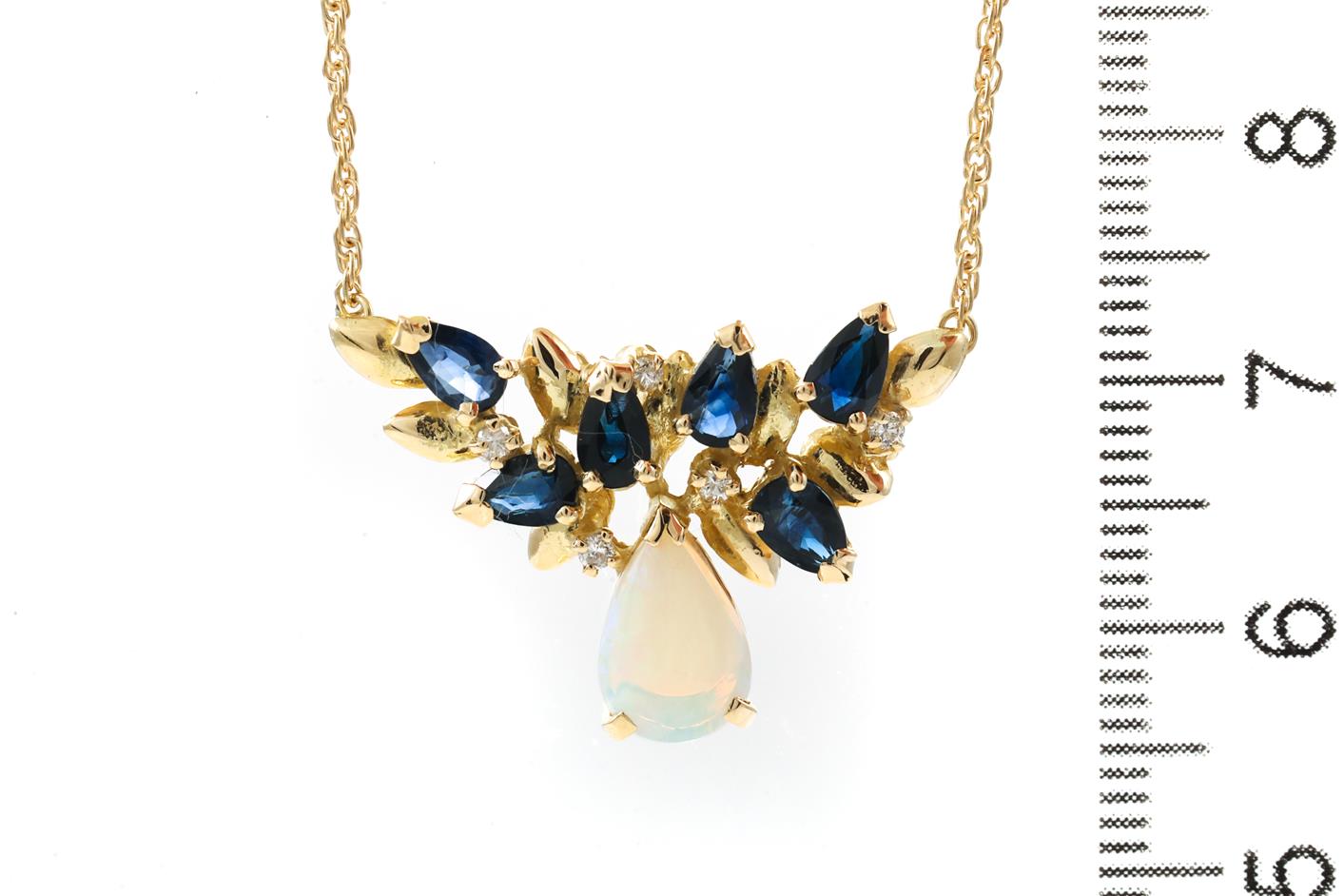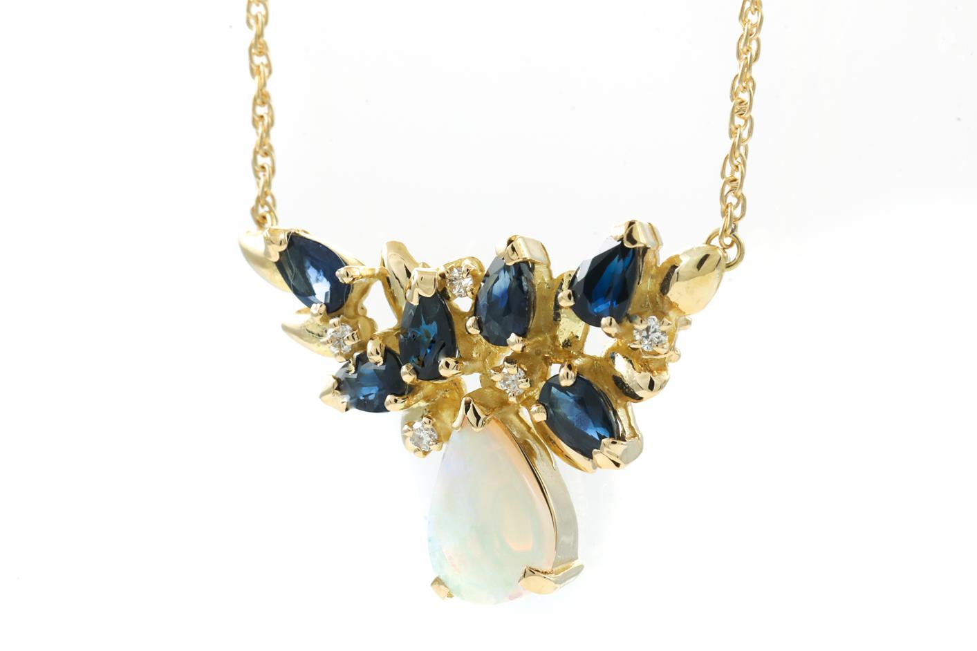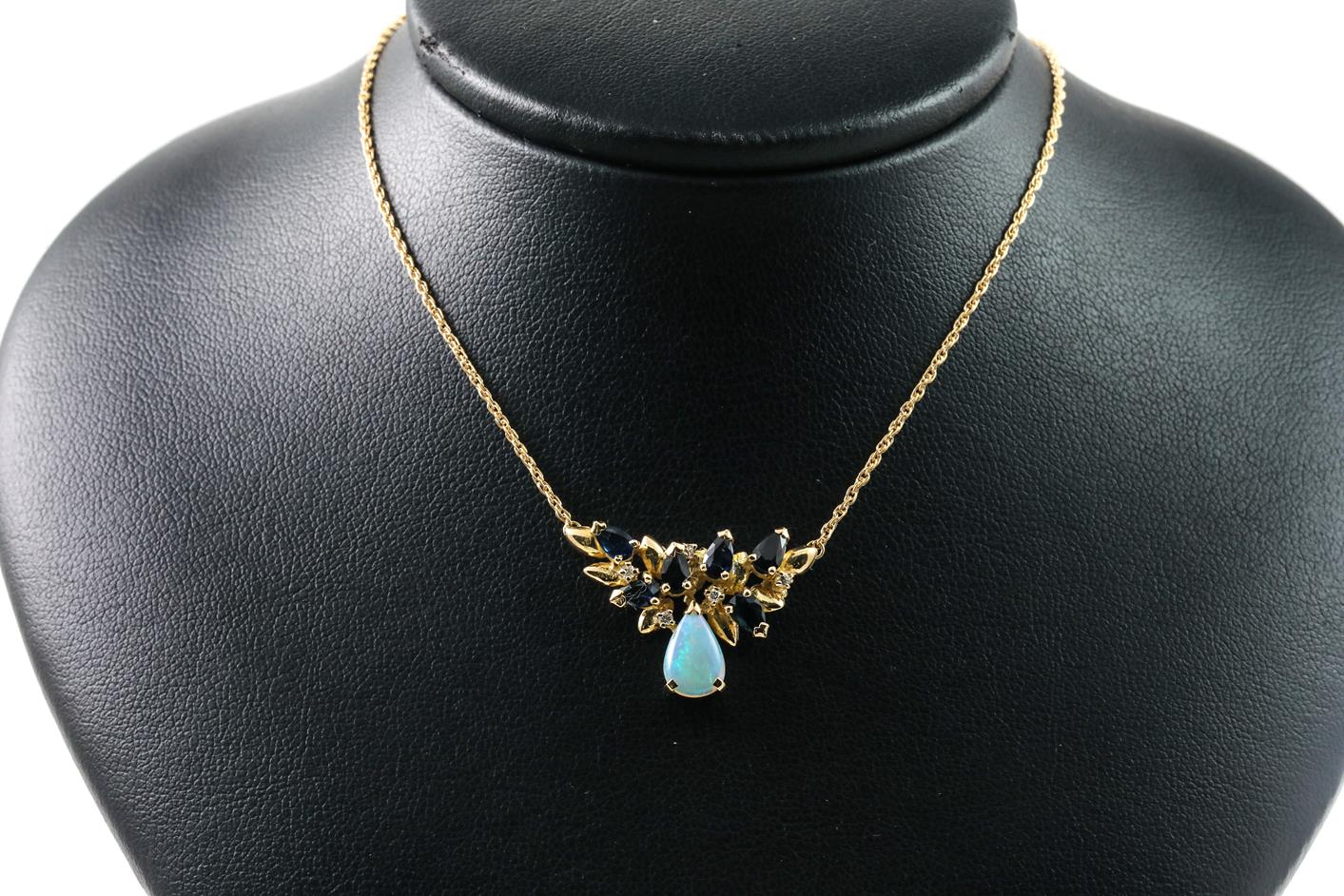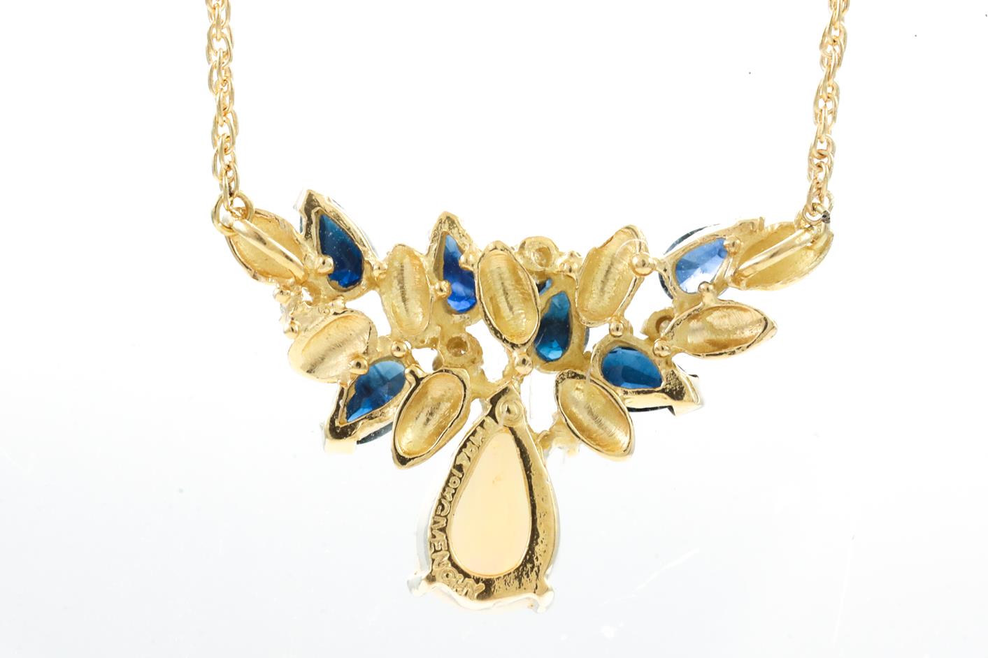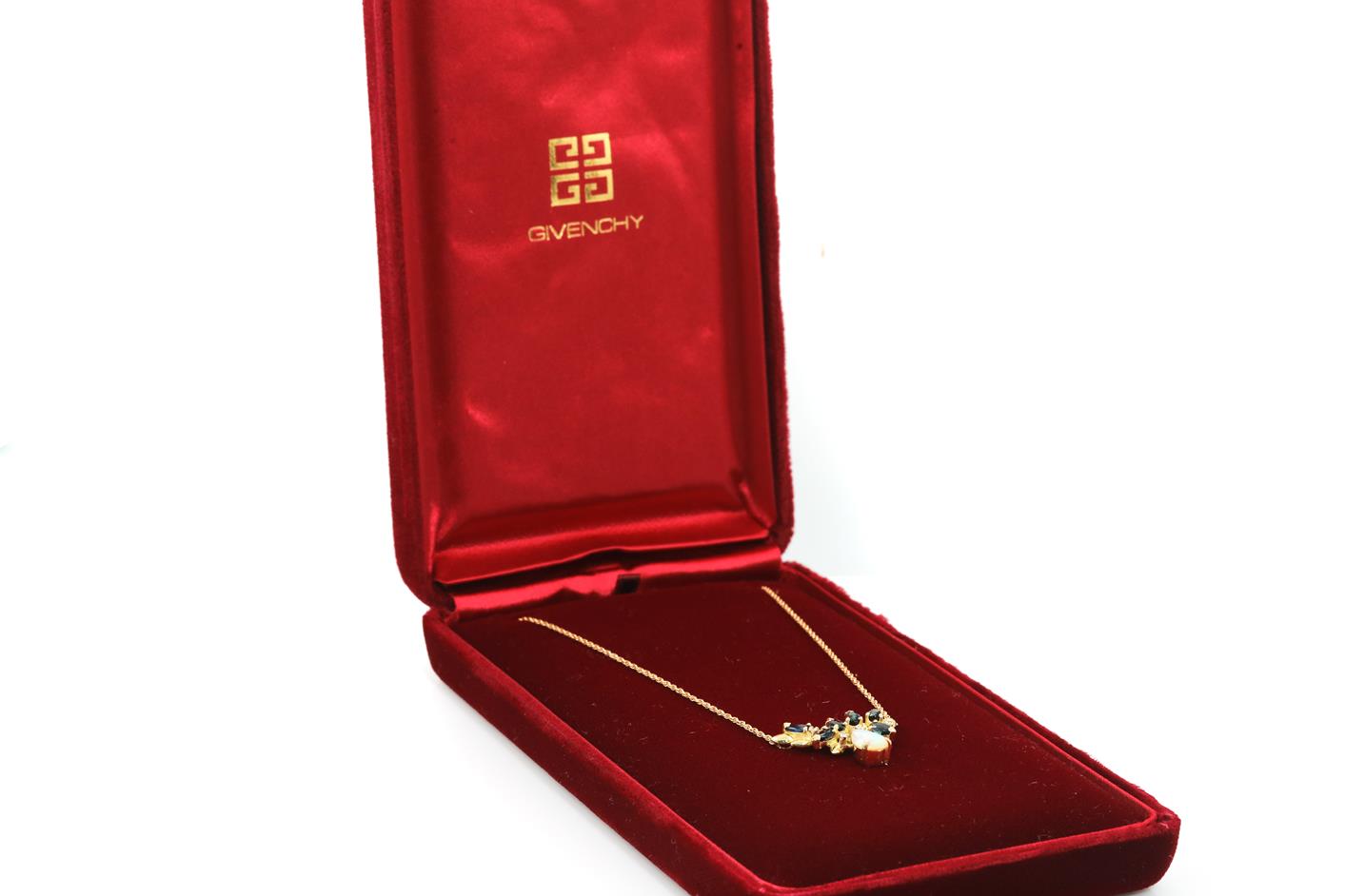 Givenchy necklace with pear shape Chrystal Opal of 9.1mm x 6.2mm x 2.2mm, pear shape blue Sapphires totalling approximately 1.30cts and round Diamonds totalling approximately 0.07cts. 18ct yellow gold with attached 18ct yellow gold chain. Adjustable max length: 42cm. With Givenchy box. Weight: 5.6g. (Pre-owned)