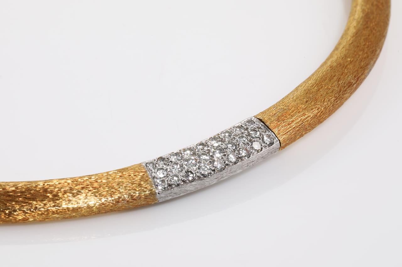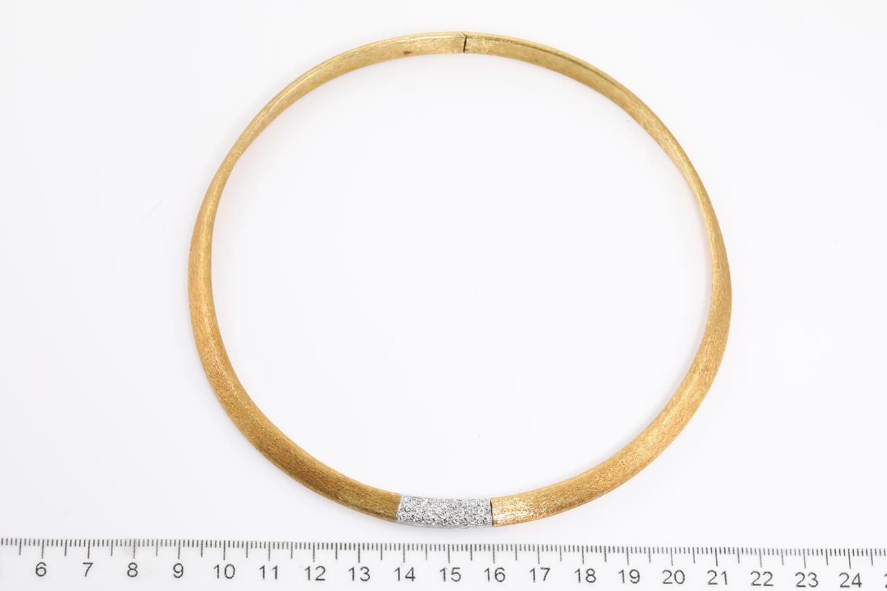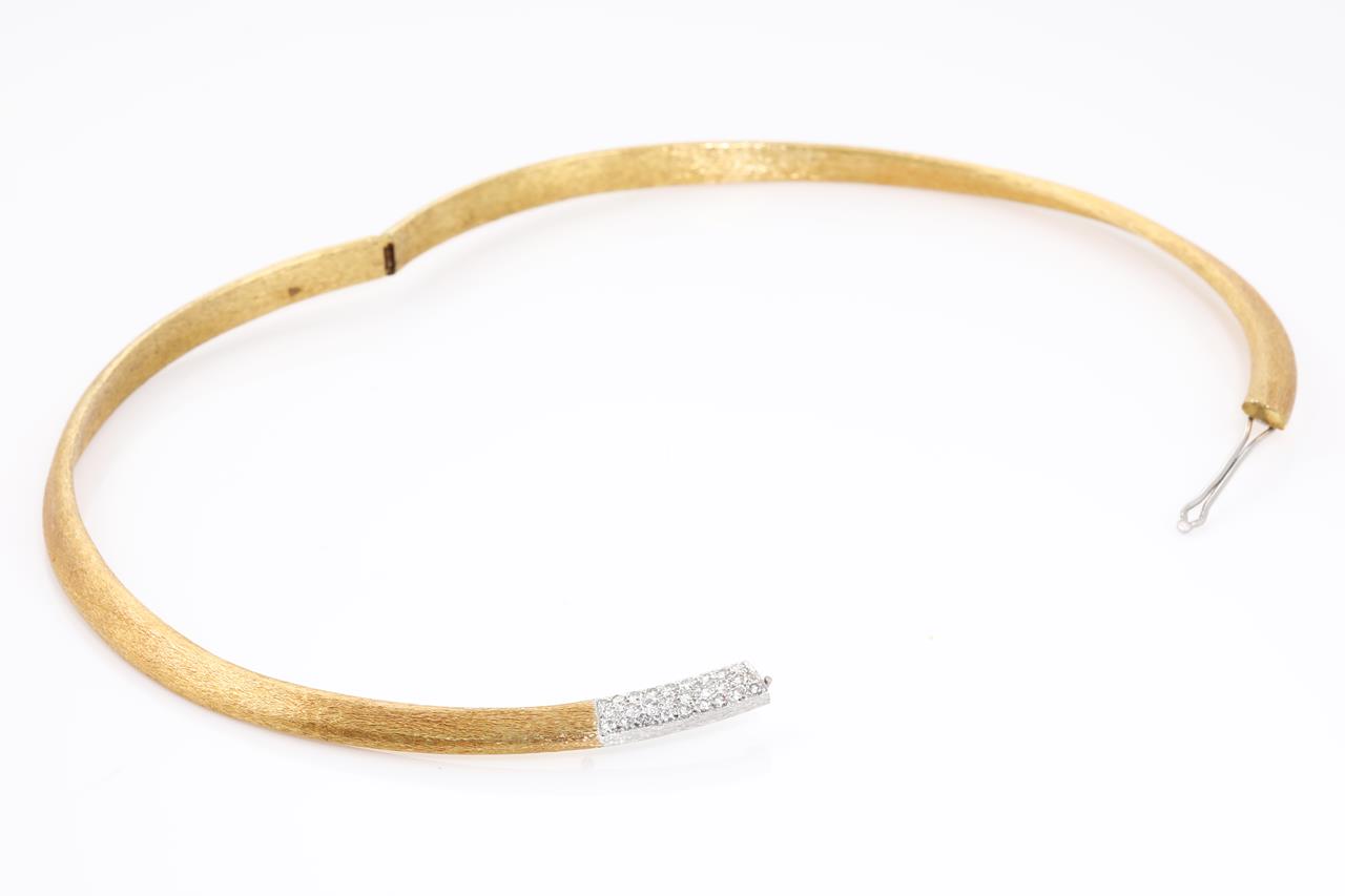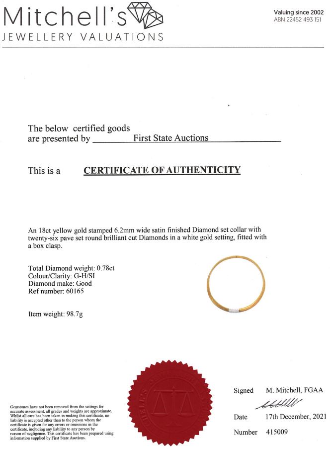 Gold and Diamond Choker with round Diamonds totalling approximately 0.78cts (Estimated grading G-H SI). 18ct yellow and white gold (unstamped - tested). Length 38cm. Weight 98.7g. With certificate #415009. (Pre-owned)