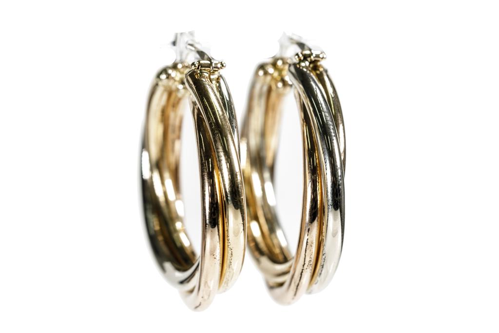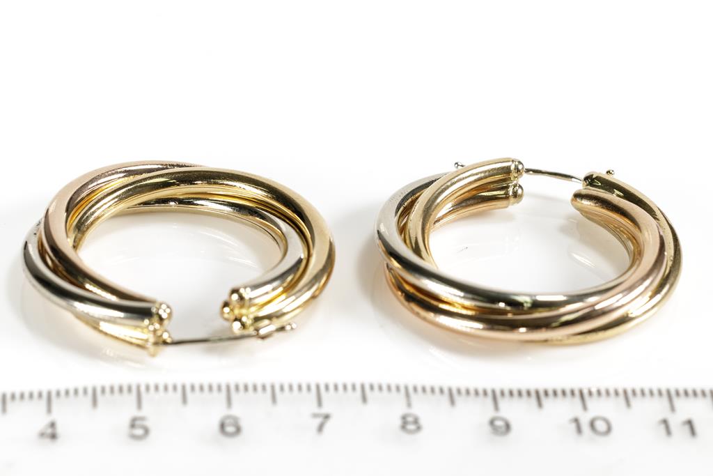 Gold Hoop Earrings, 18ct tri-colour gold. Weight 18.2g. Diameter 3.5cm. (Pre-owned)