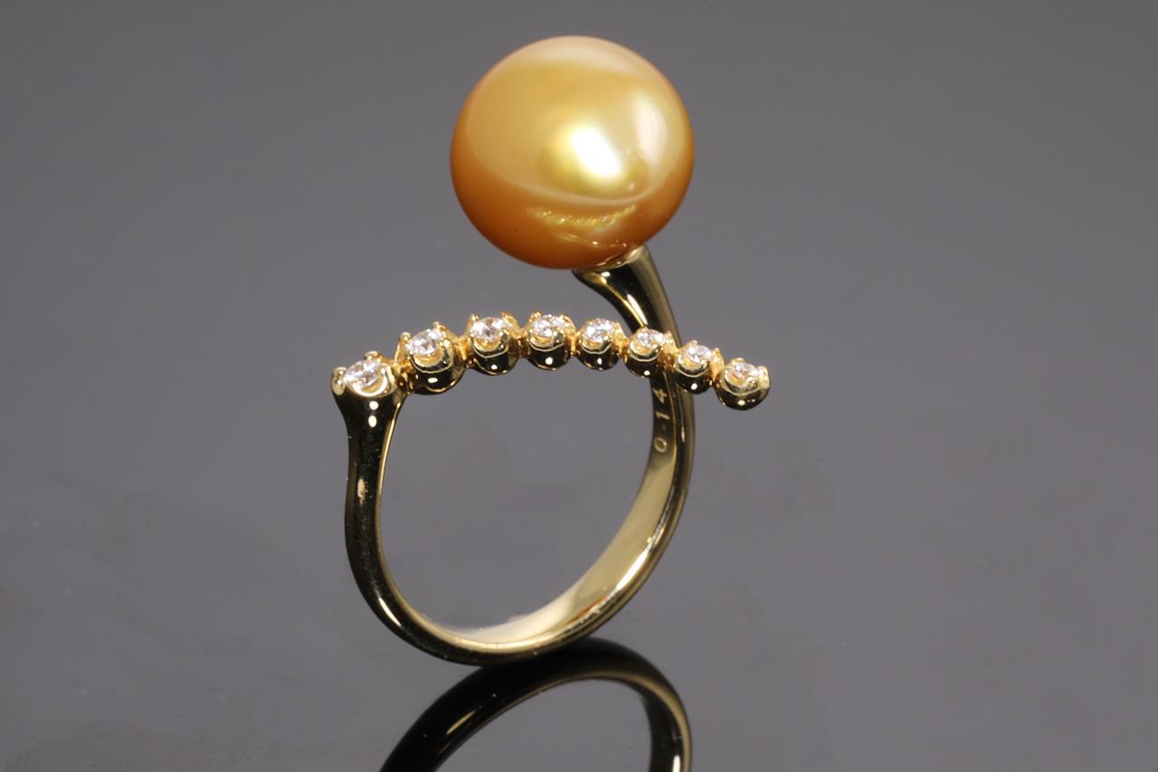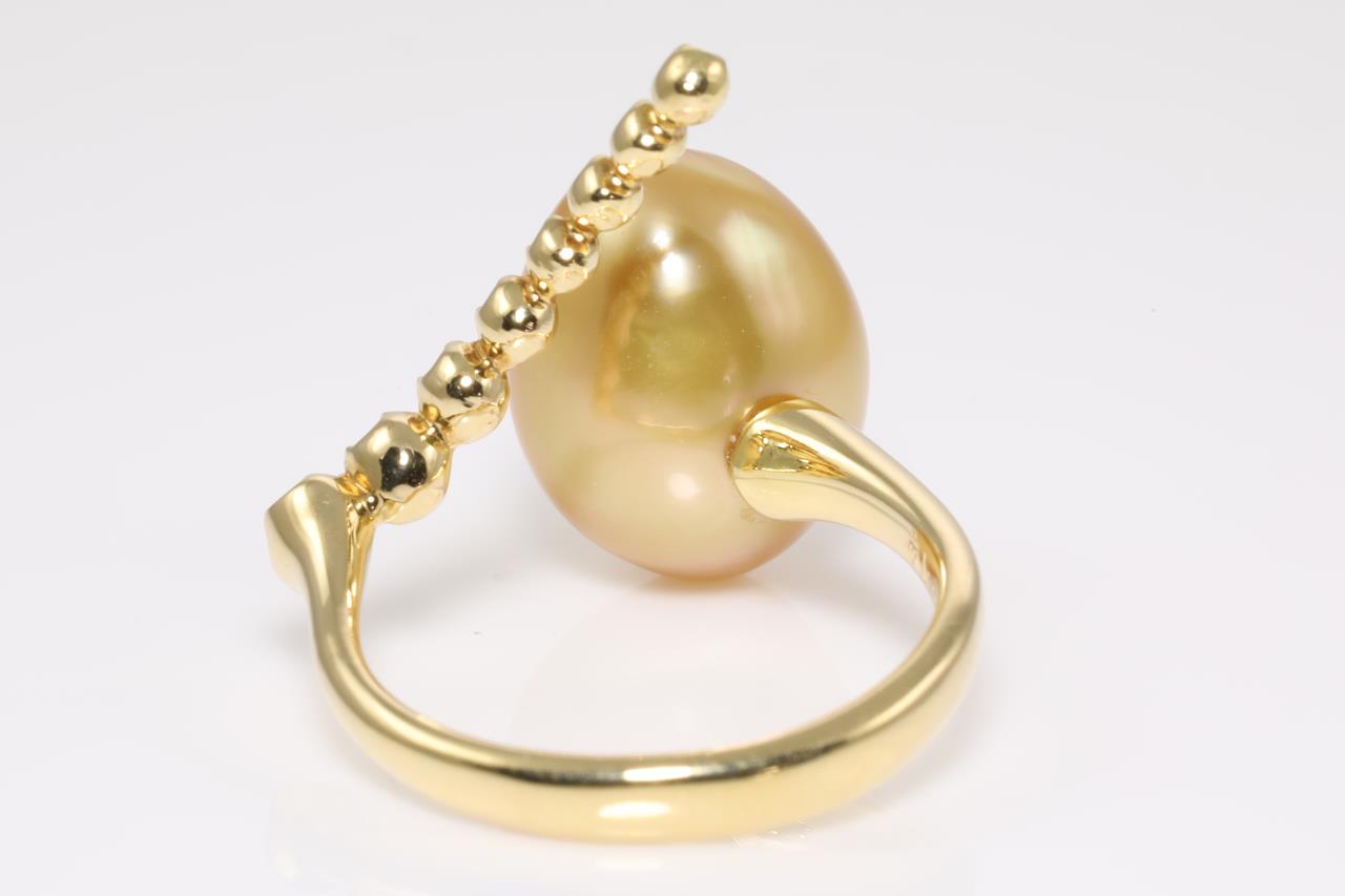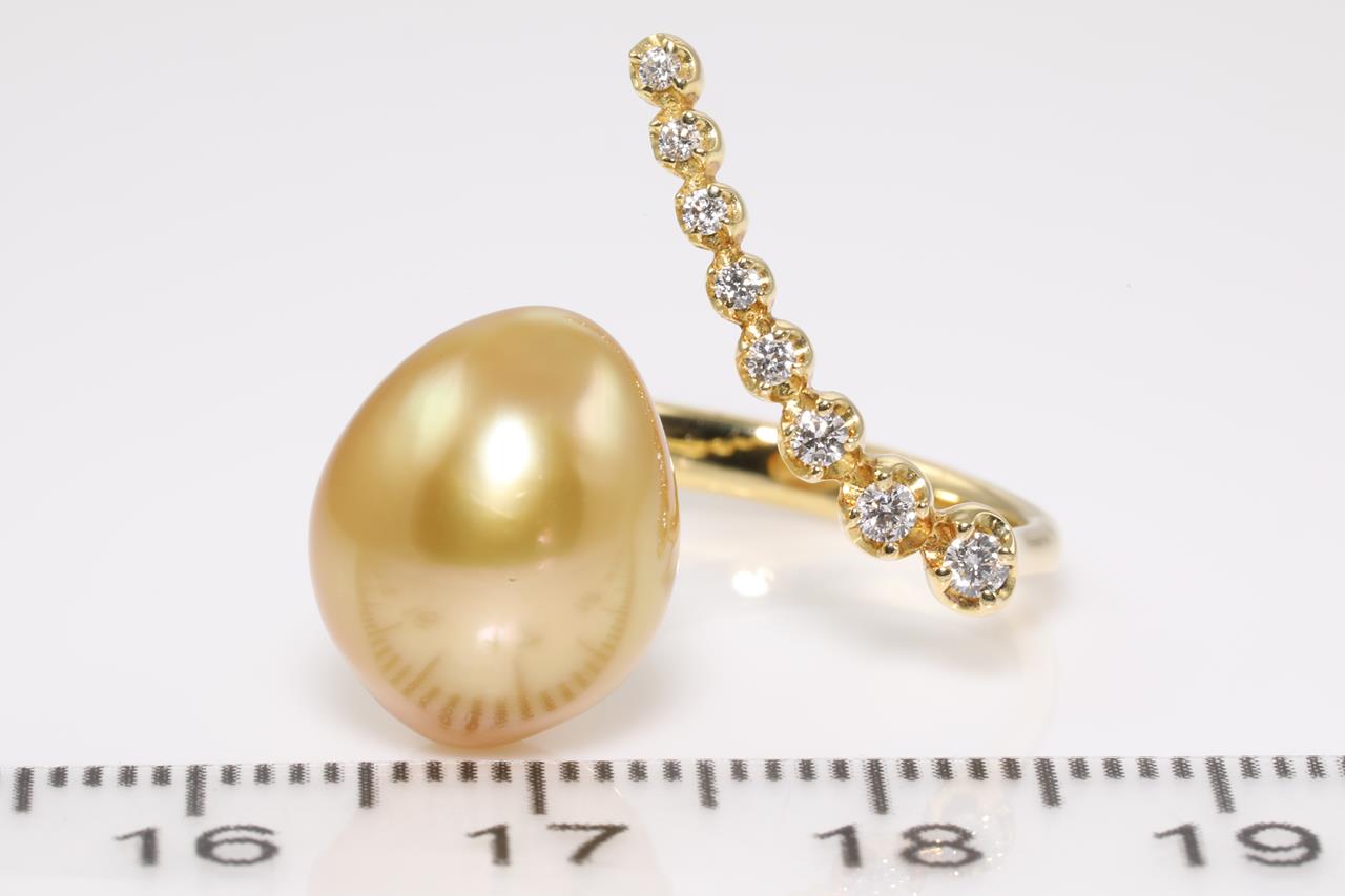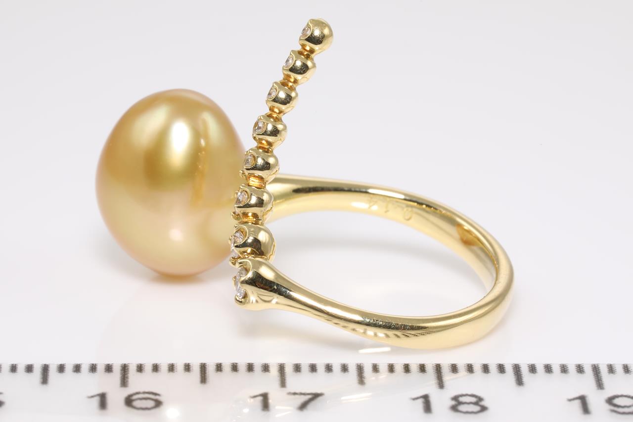 Pearl and Diamond ring with a drop shape Golden South Sea Pearl of 10.8mm and Diamonds totalling 0.14cts. 18ct yellow gold. Ring size K - ring resizing is not recommended. Weight: 5.1g (Pre-owned)