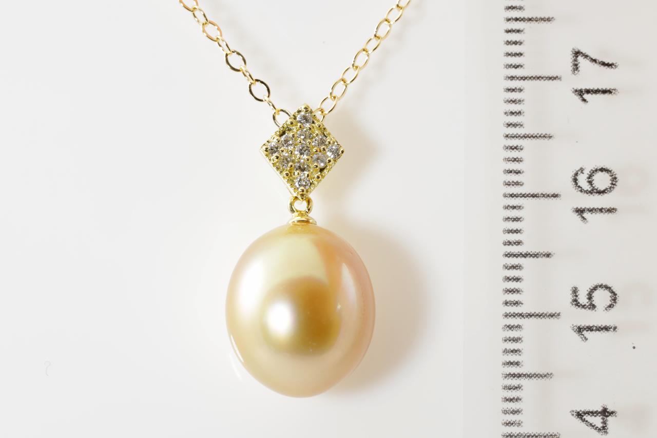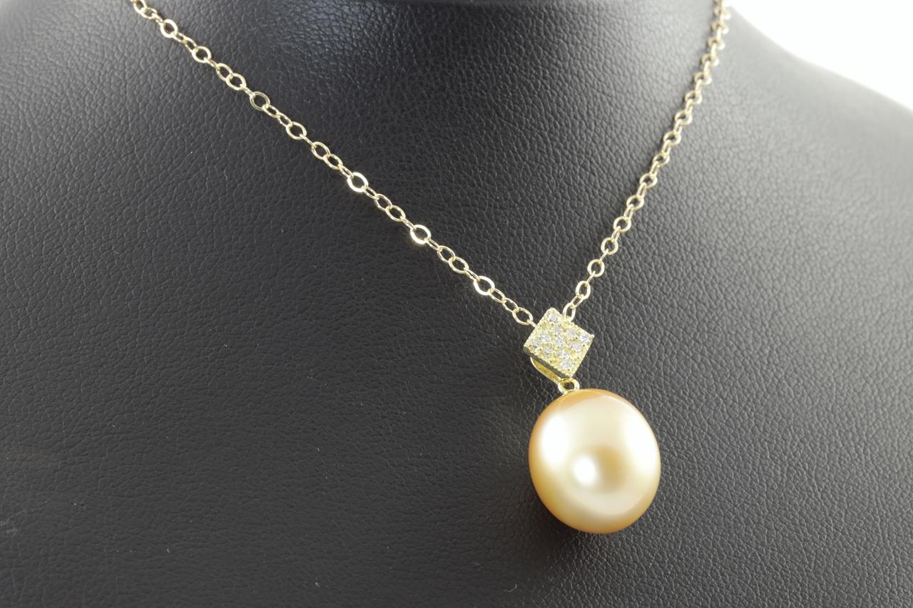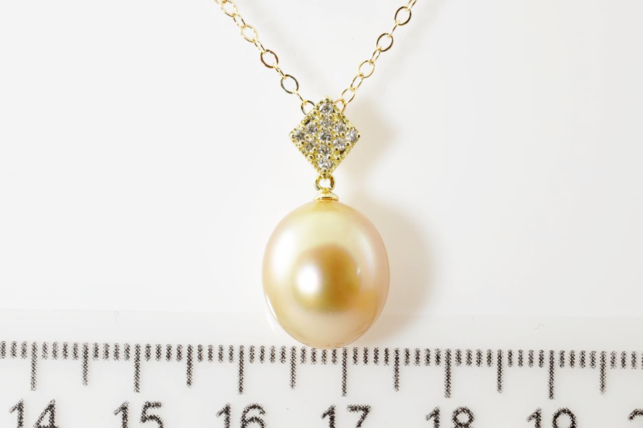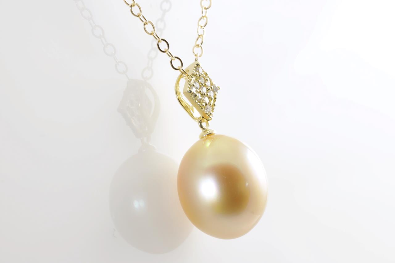 Pearl and Diamond pendant with an oval shape Golden South Sea Pearl of 12.1mm and Diamonds totalling 0.10cts. 18ct yellow gold with 18ct gold 44cm chain. Weight: 4.9g. (Pre-owned)