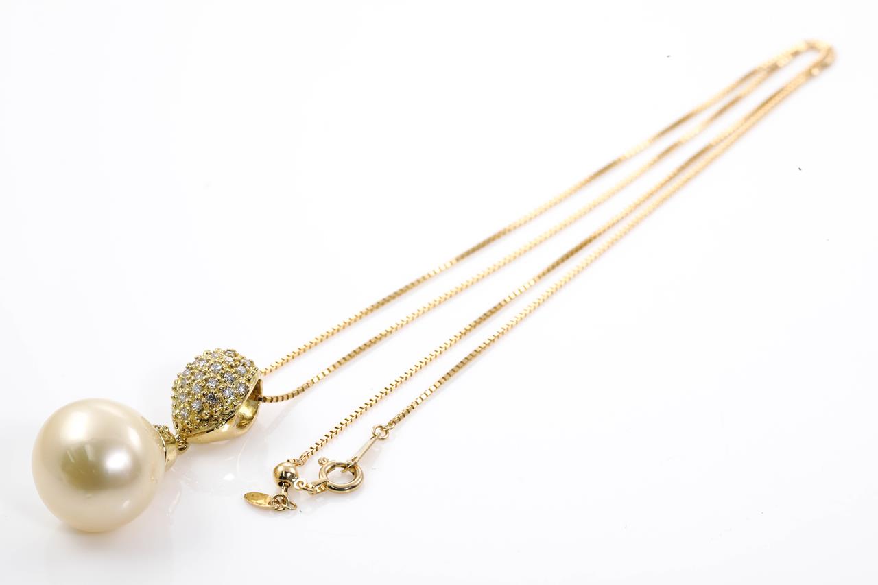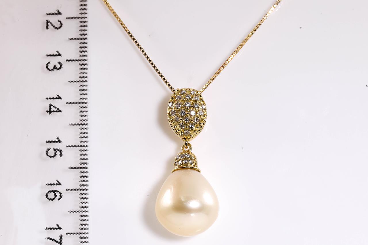 Pearl and Diamond pendant with a Golden South Sea Pearl of 14.4mm and Diamonds totalling 0.26cts. 18ct yellow gold with 18ct gold 44cm adjustable chain. Weight: 10g. (Pre-owned)