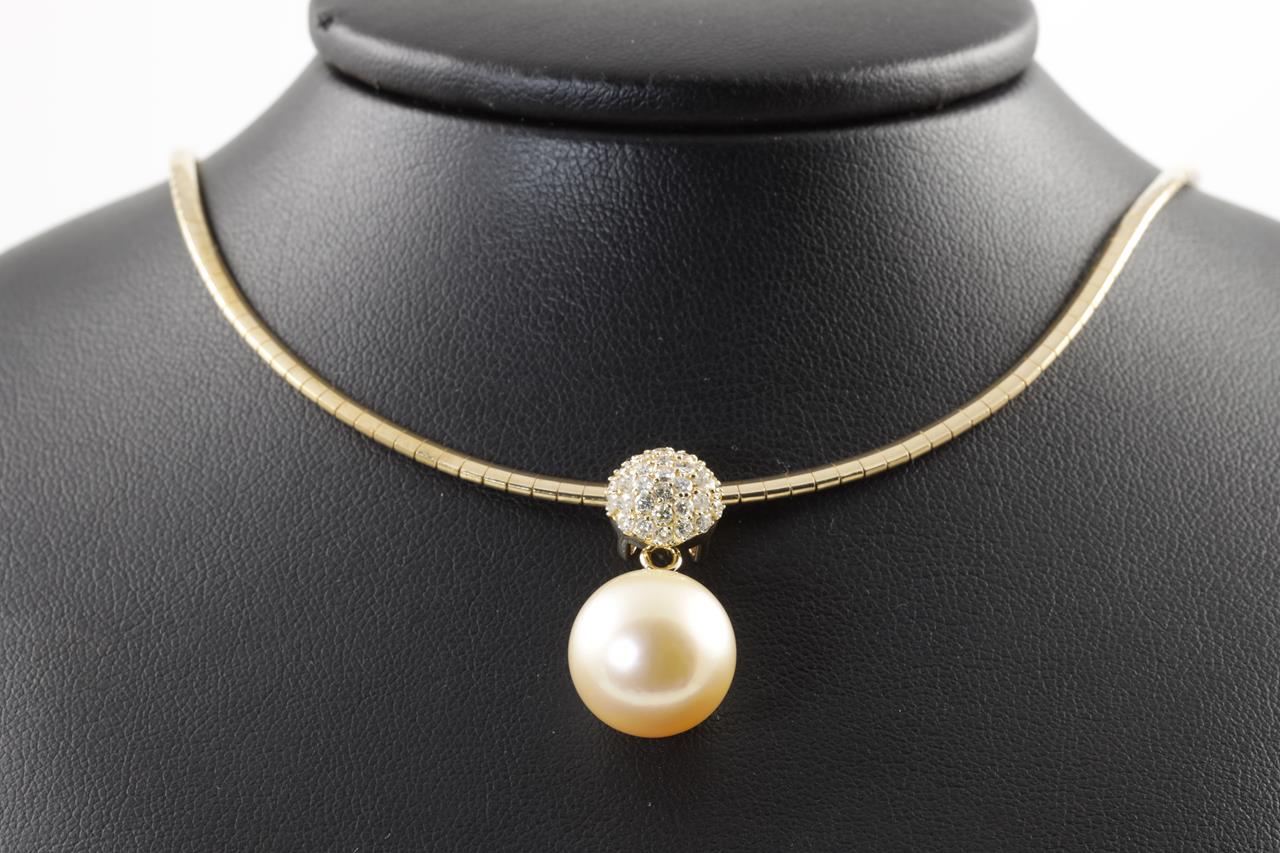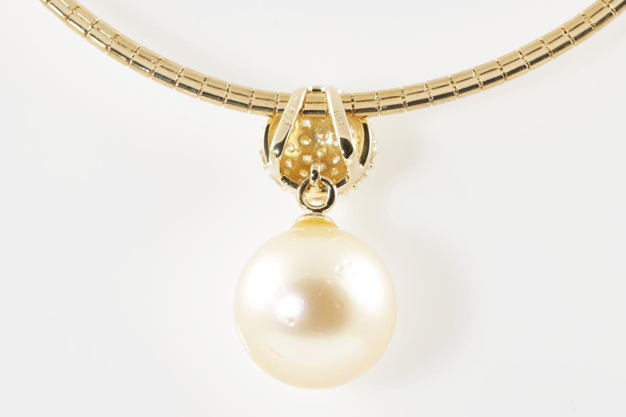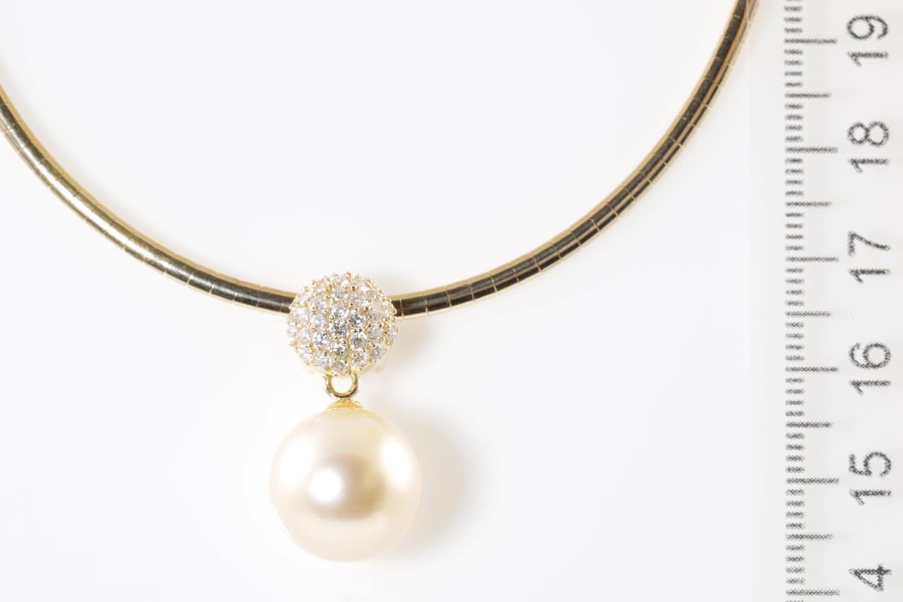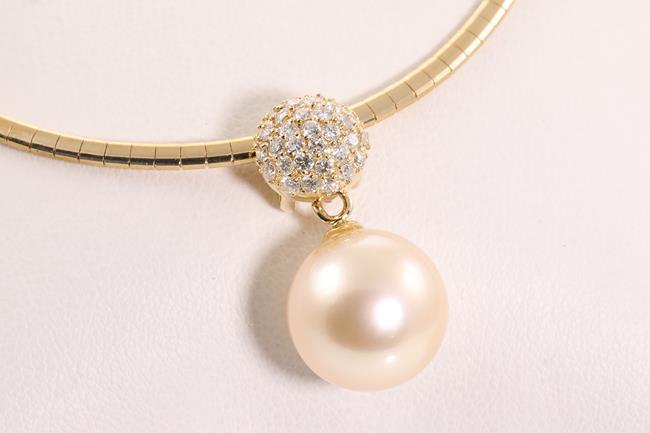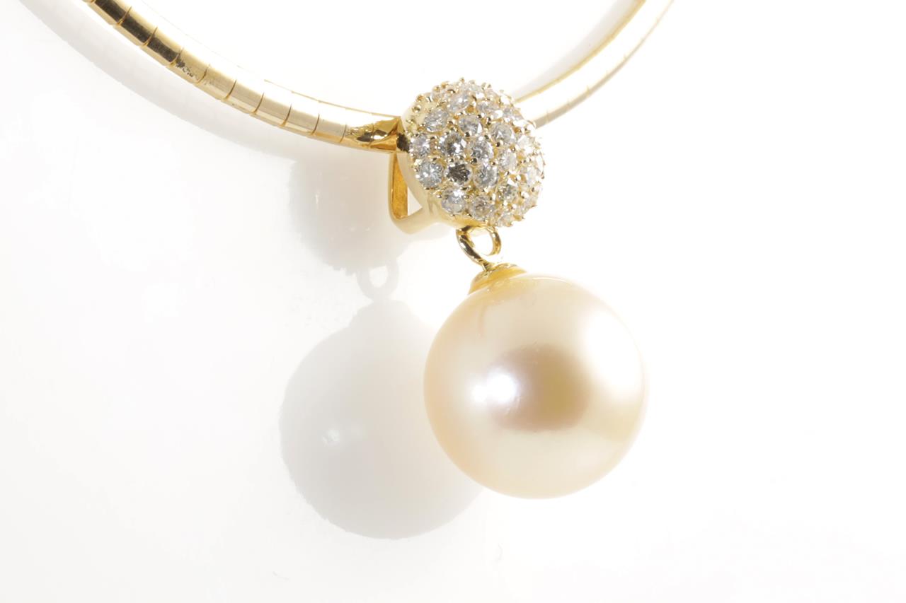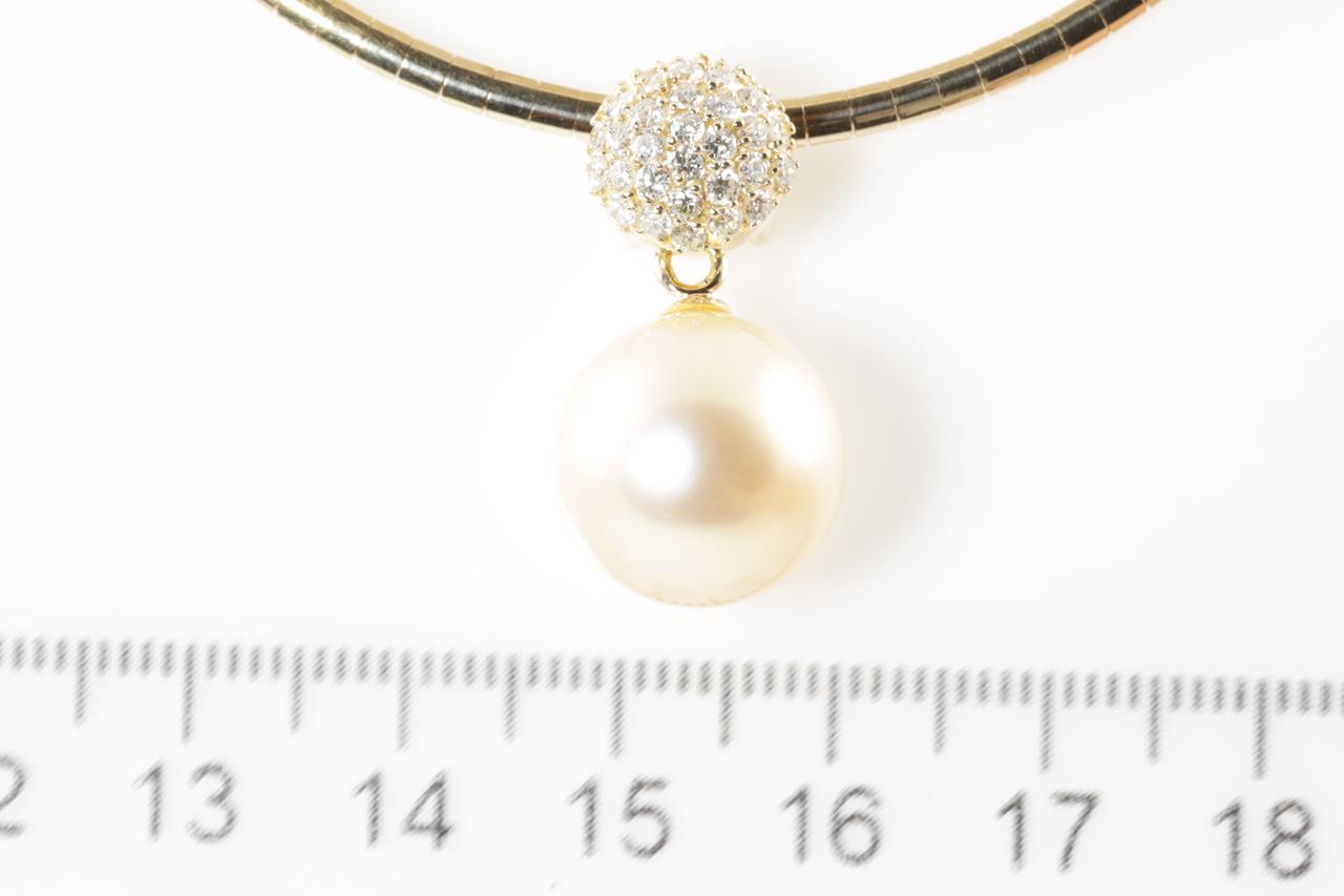 Pearl and Diamond pendant with a light golden South Sea Pearl of 13.5mm and Diamonds totalling 0.56cts (Estimated grading: H SI). 18ct yellow gold with 42cm necklet. Weight: 20.6g. (Pre-owned)