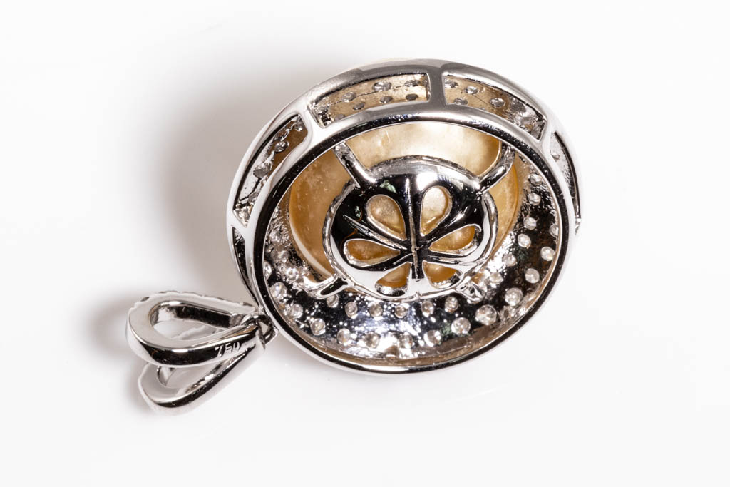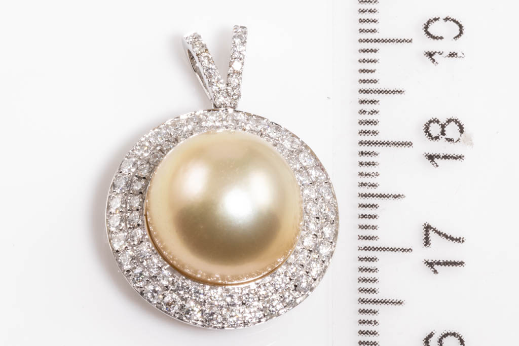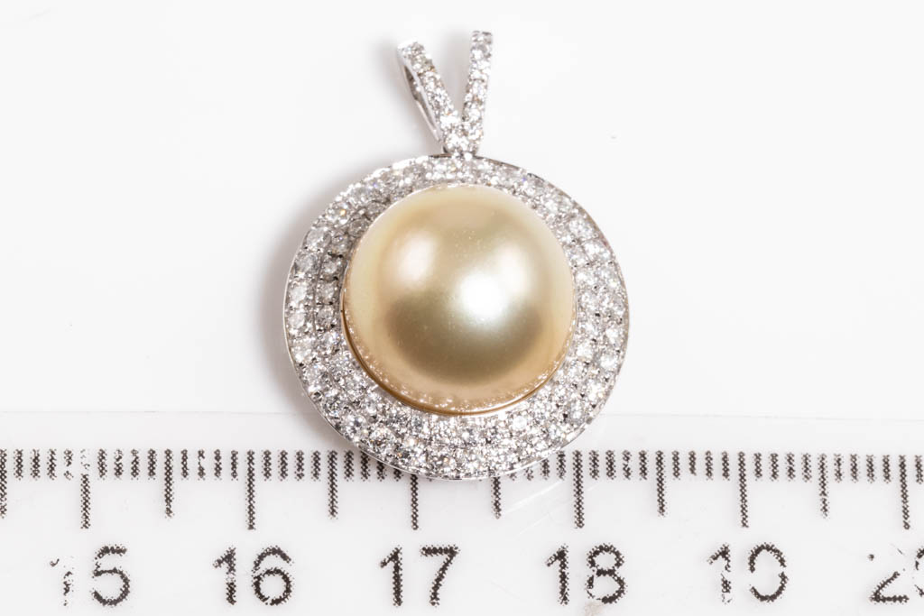 Pearl and Diamond Pendant with Golden South sea Pearl of 13.8mm and round Diamonds totalling approximately 1.72cts (Estimated grading F-G SI). 18ct white gold. No chain provided. Weight 8.2g. (Pre-owned)