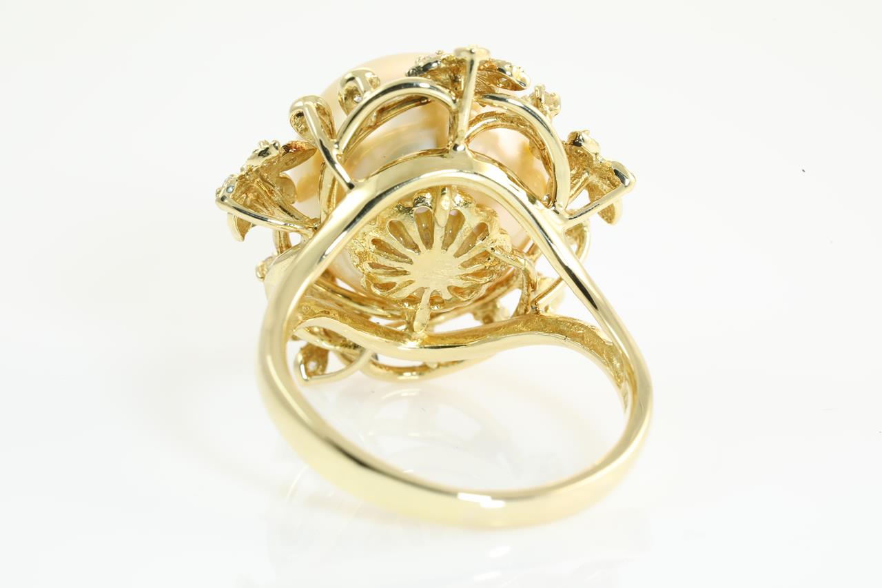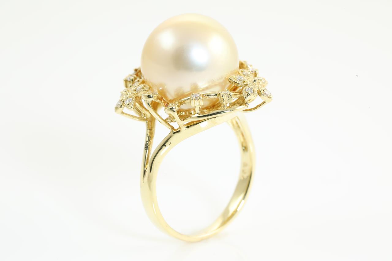 Pearl and Diamond ring with a light Golden South Sea Pearl of 15.0mm and Diamonds totalling 0.24cts. 18ct yellow gold. Ring size S. Weight: 13.3g (Pre-owned)