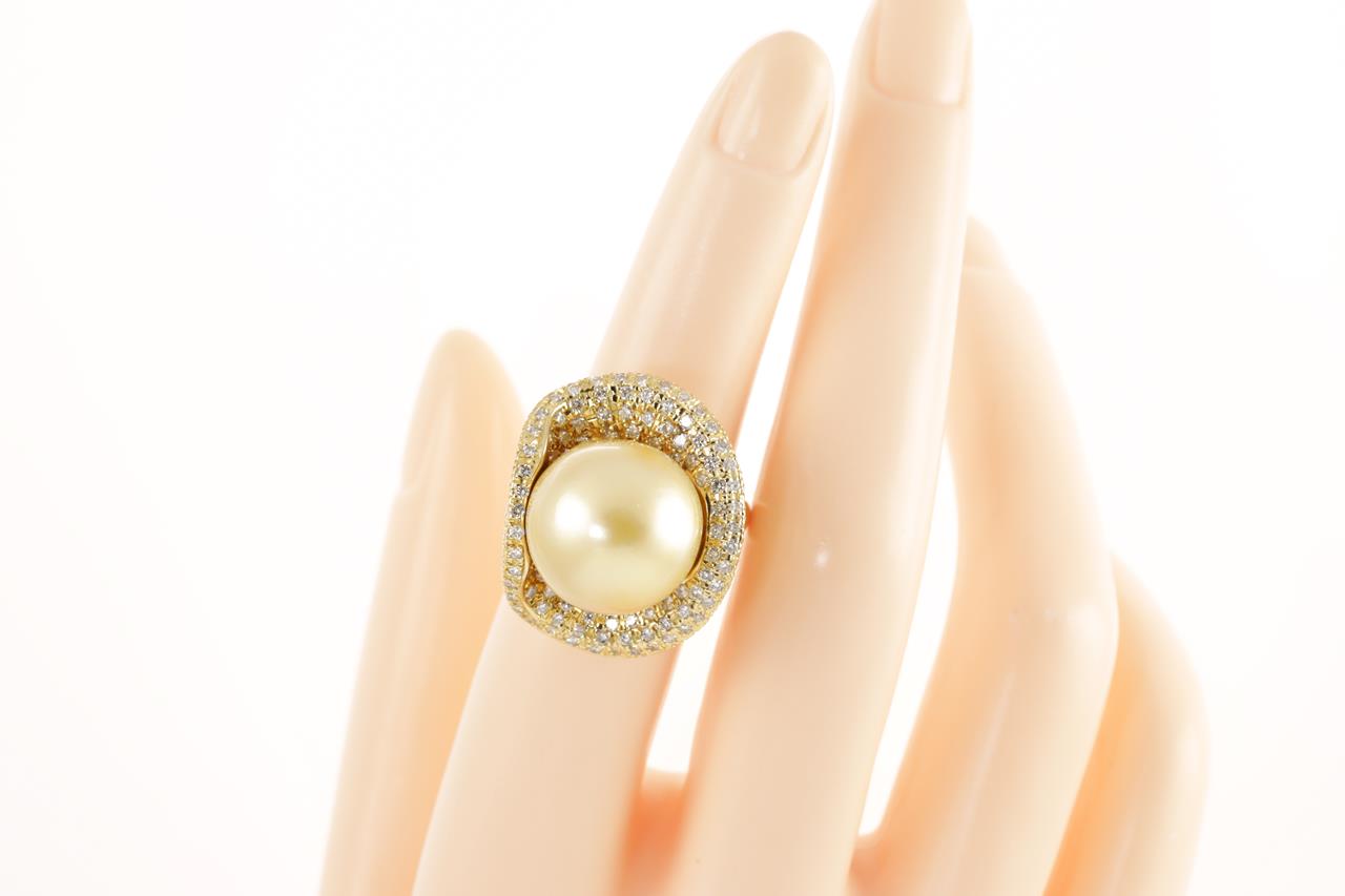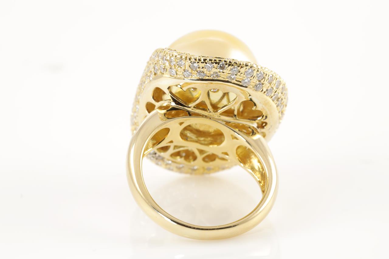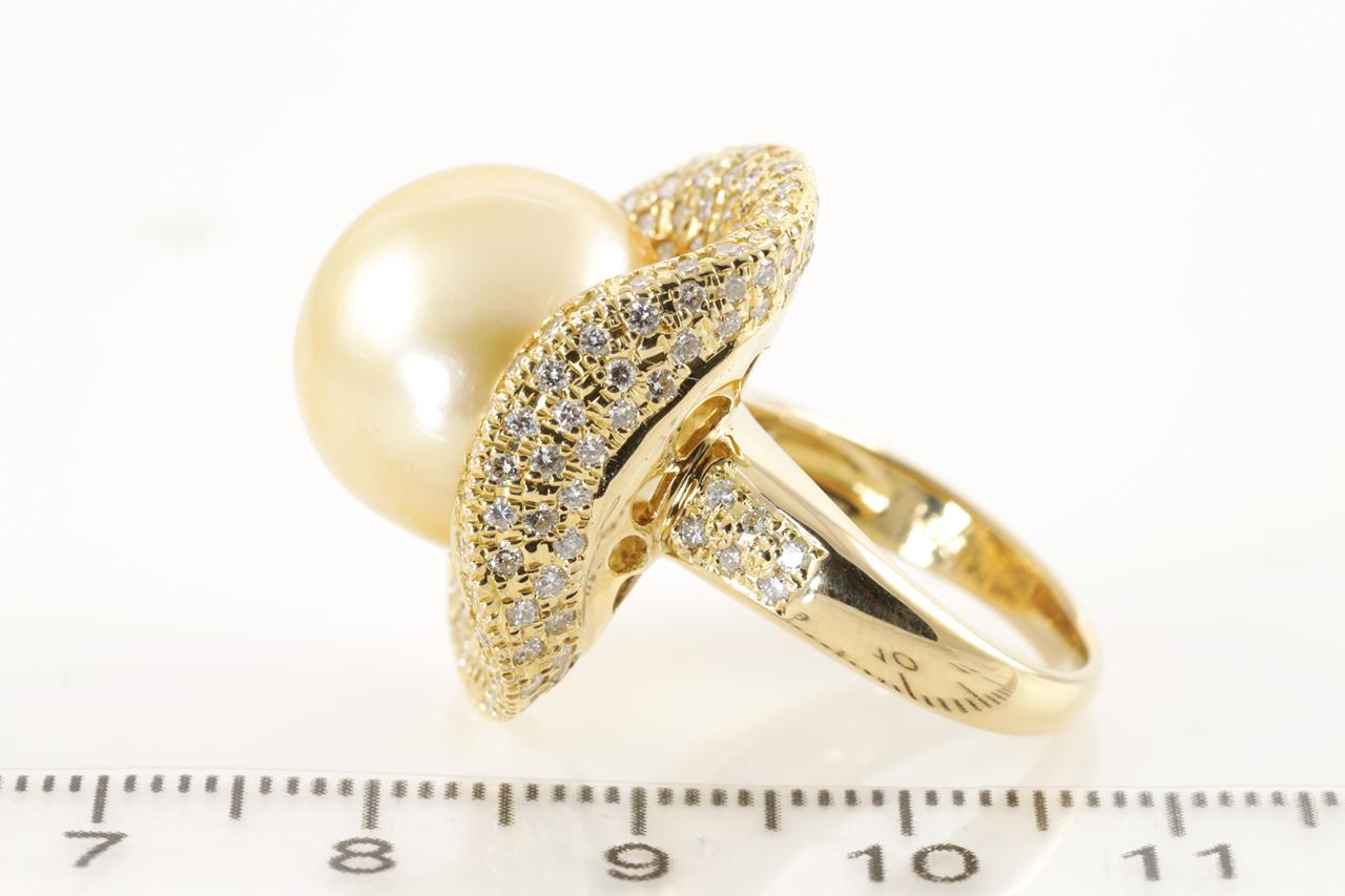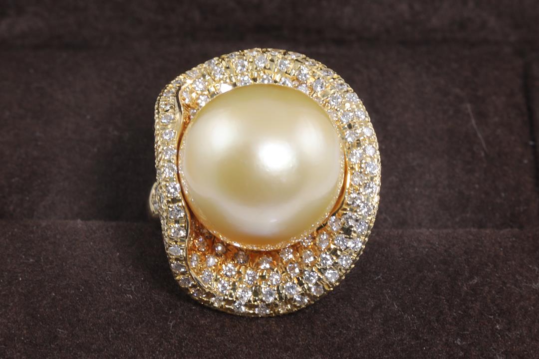 Pearl and Diamond ring with a Golden South Sea Pearl of 14.8mm and Diamonds totalling 1.66cts (Estimated grading: G-H SI). 18ct yellow gold. Ring size K1/2. Weight: 15.7g. (Pre-owned)