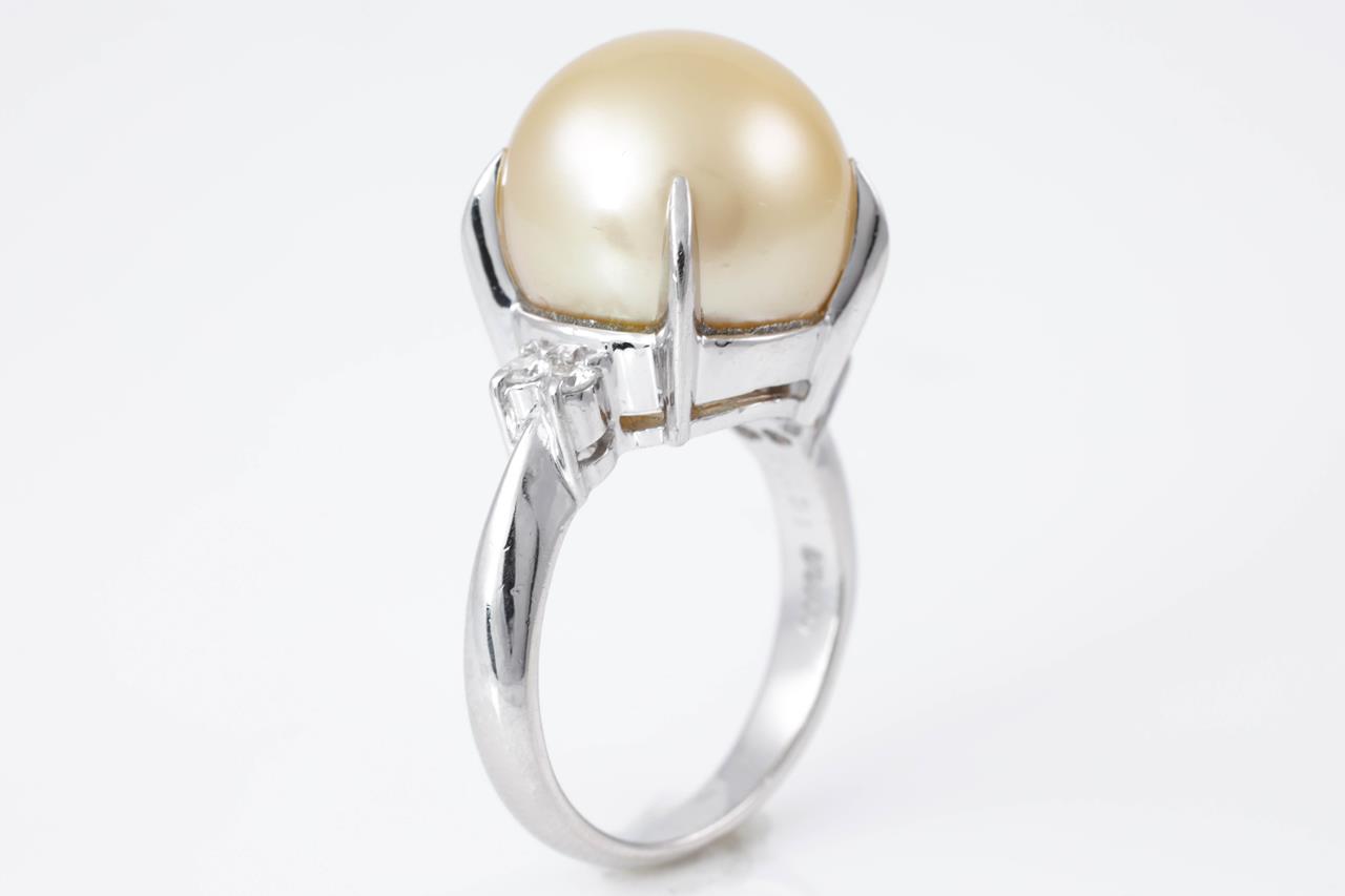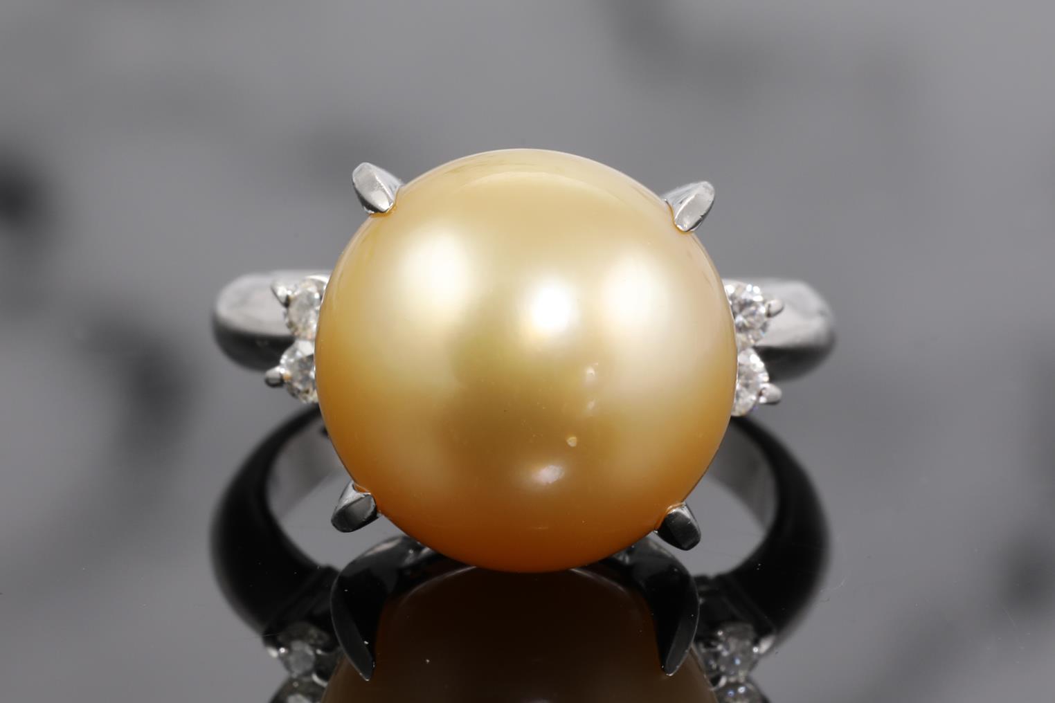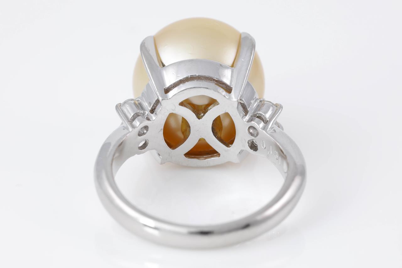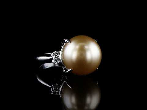 Pearl and Diamond ring with a Golden South Sea Pearl of 13.5mm and Diamonds totalling 0.13cts. Platinum. Ring size L1/2. Weight: 11.5g. (Pre-owned)