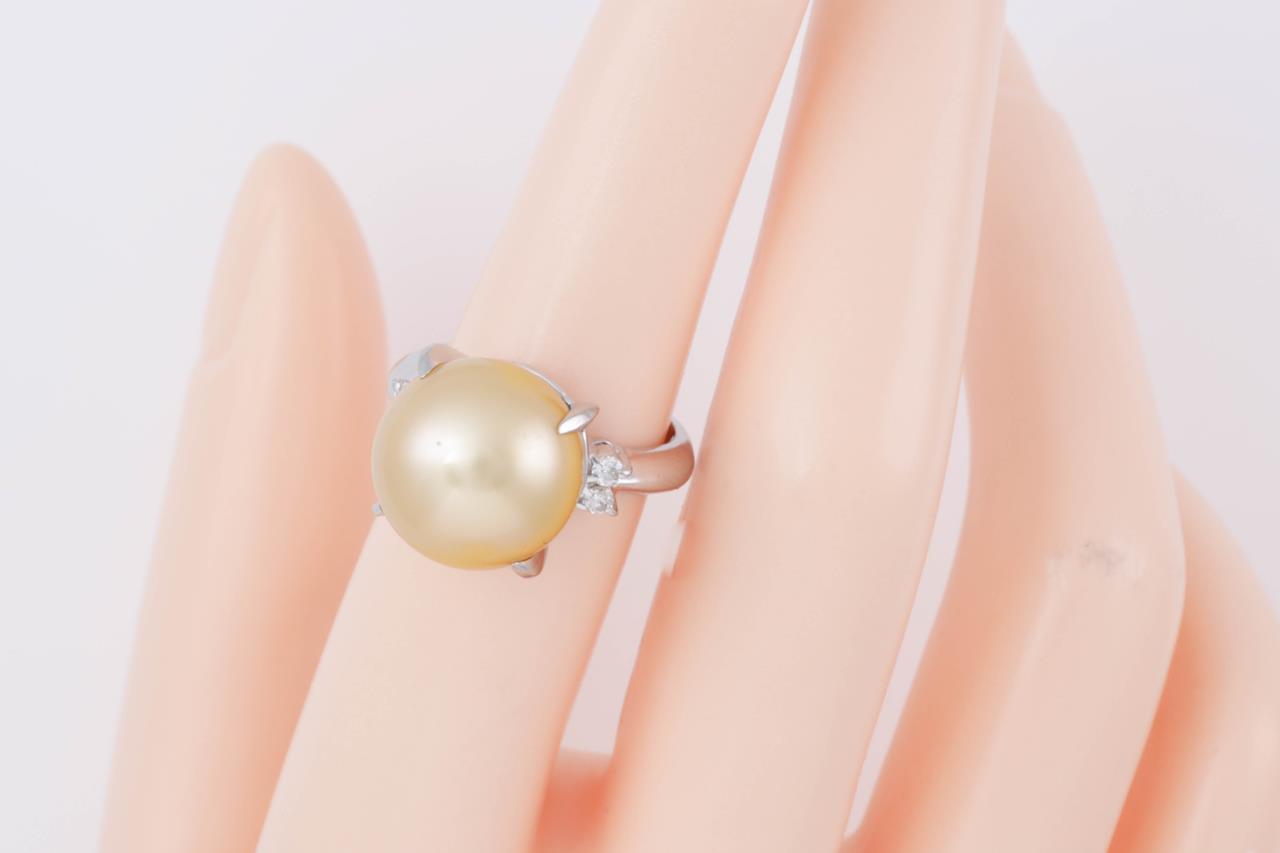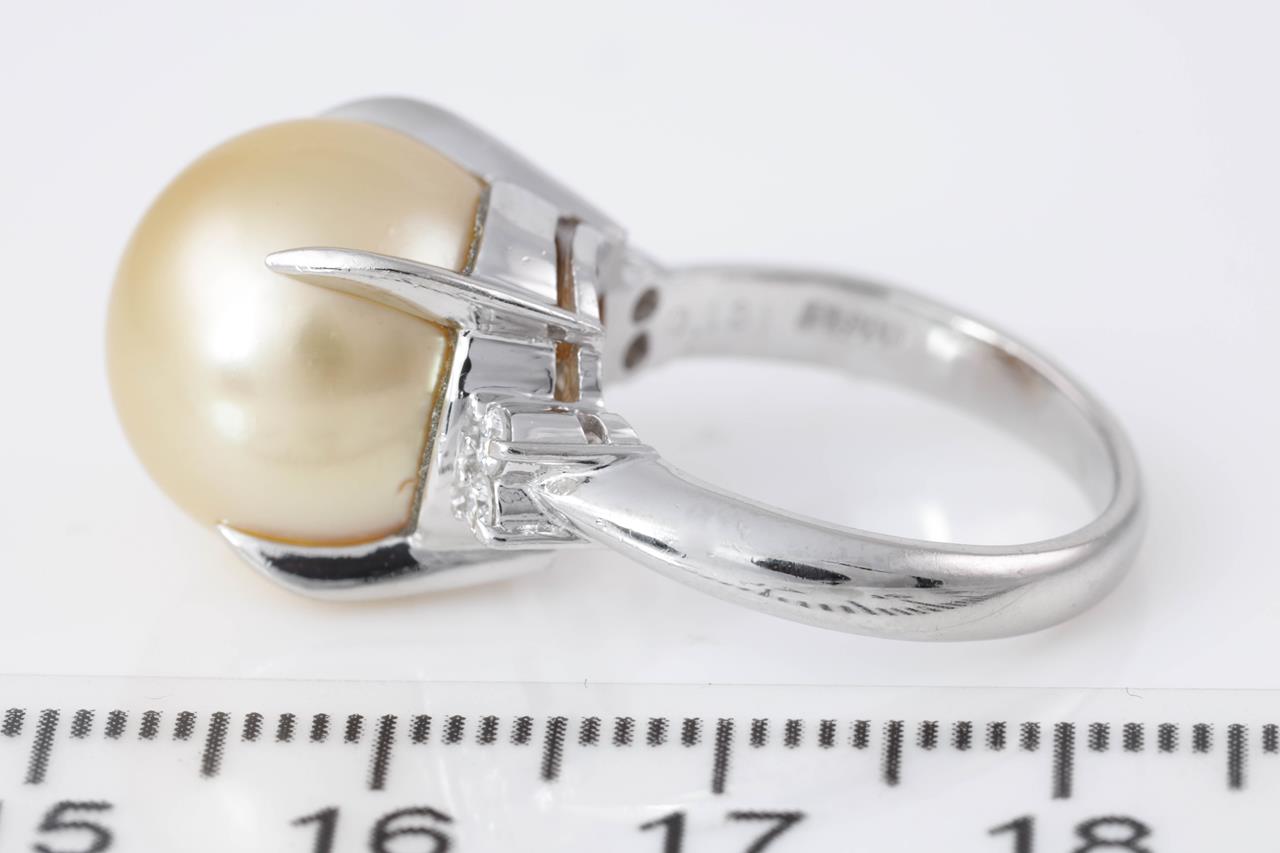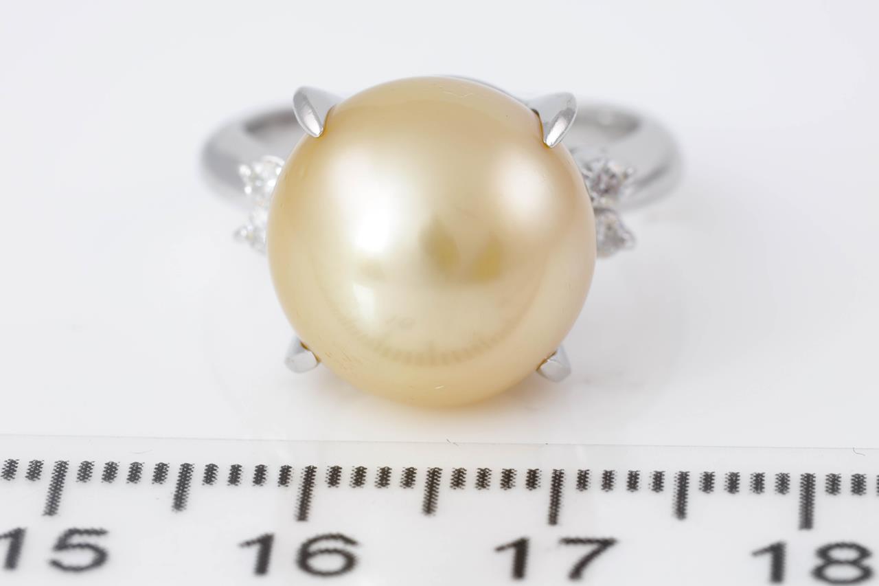 Pearl and Diamond ring with a Golden South Sea Pearl of 13.5mm and Diamonds totalling 0.13cts. Platinum. Ring size L1/2. Weight: 11.5g. (Pre-owned)