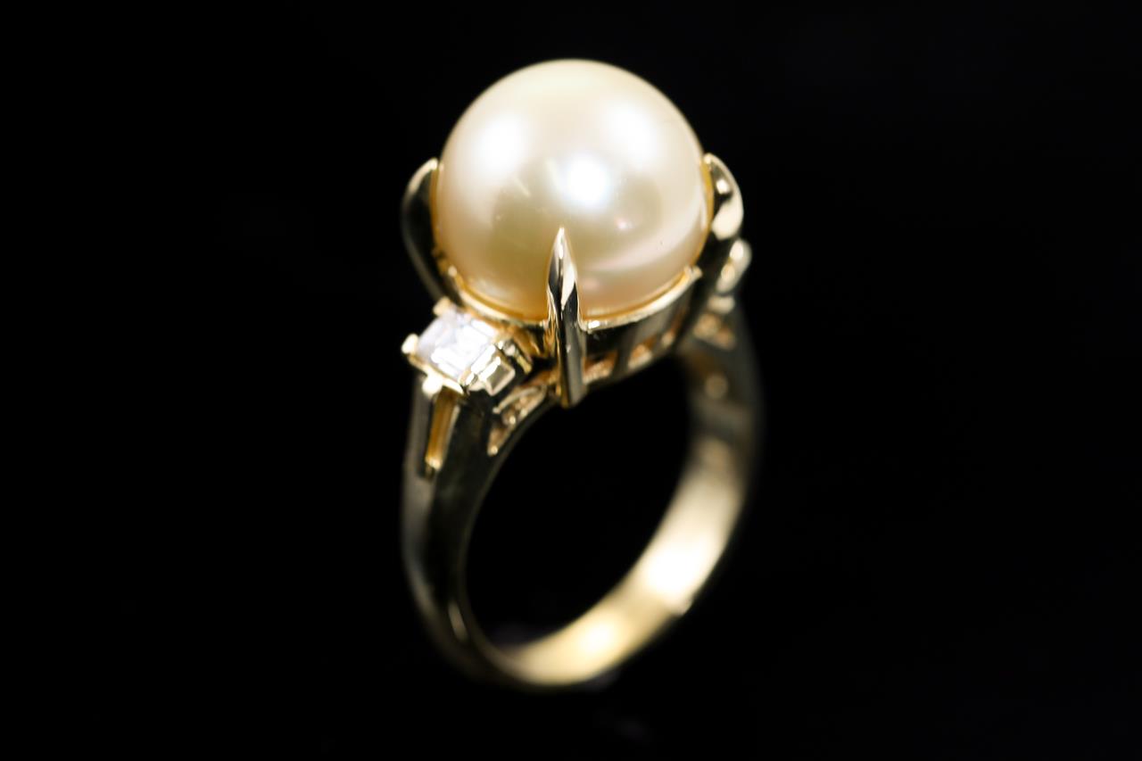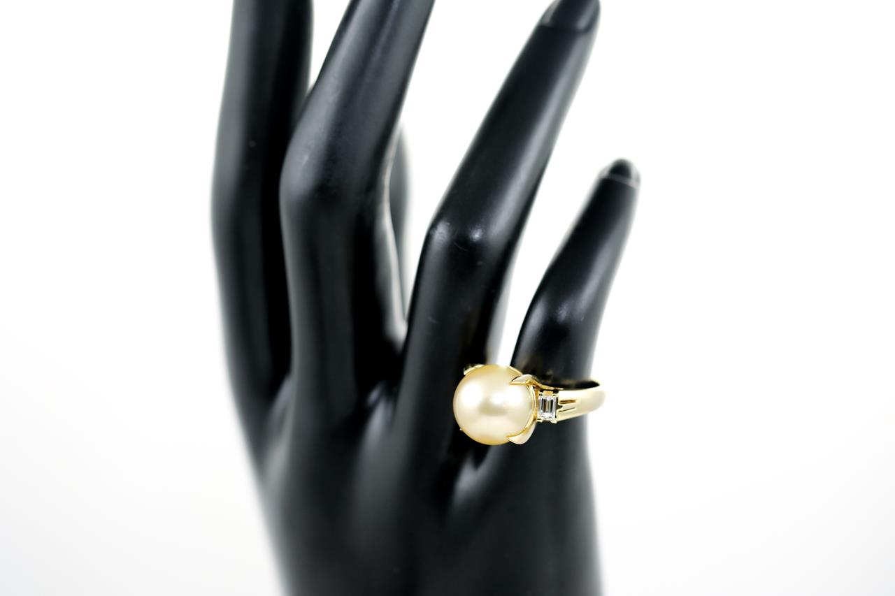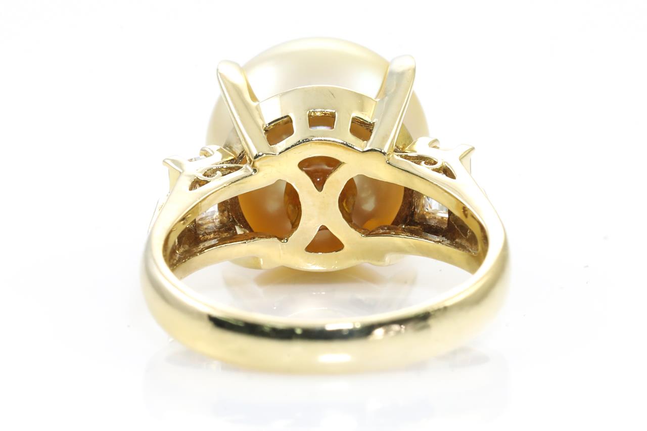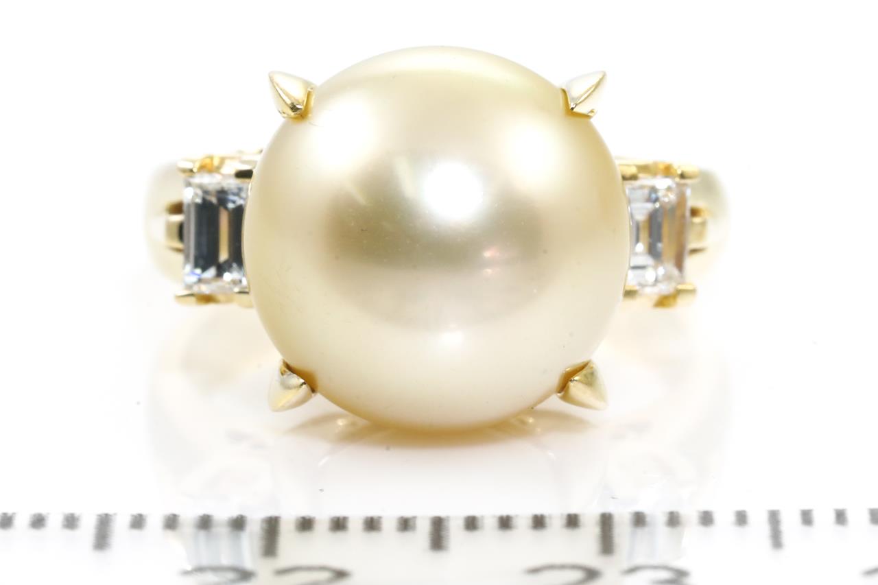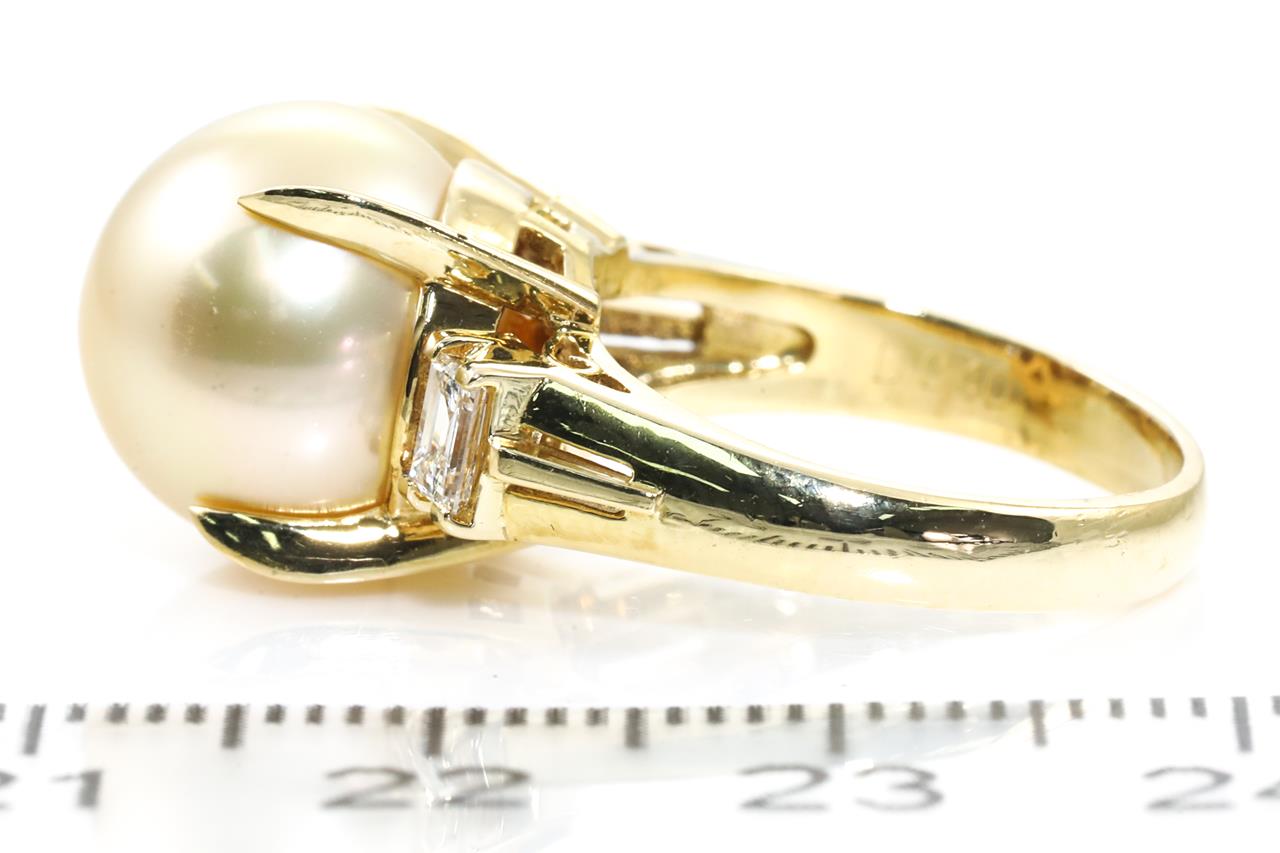 Pearl and Diamond ring with a Golden South Sea Pearl of 12.0mm and 2 baguette cut Diamonds totalling 0.40cts (Estimated grading: G-H SI). 18ct yellow gold. Ring size: J. Weight: 7.4g. (Pre-owned)