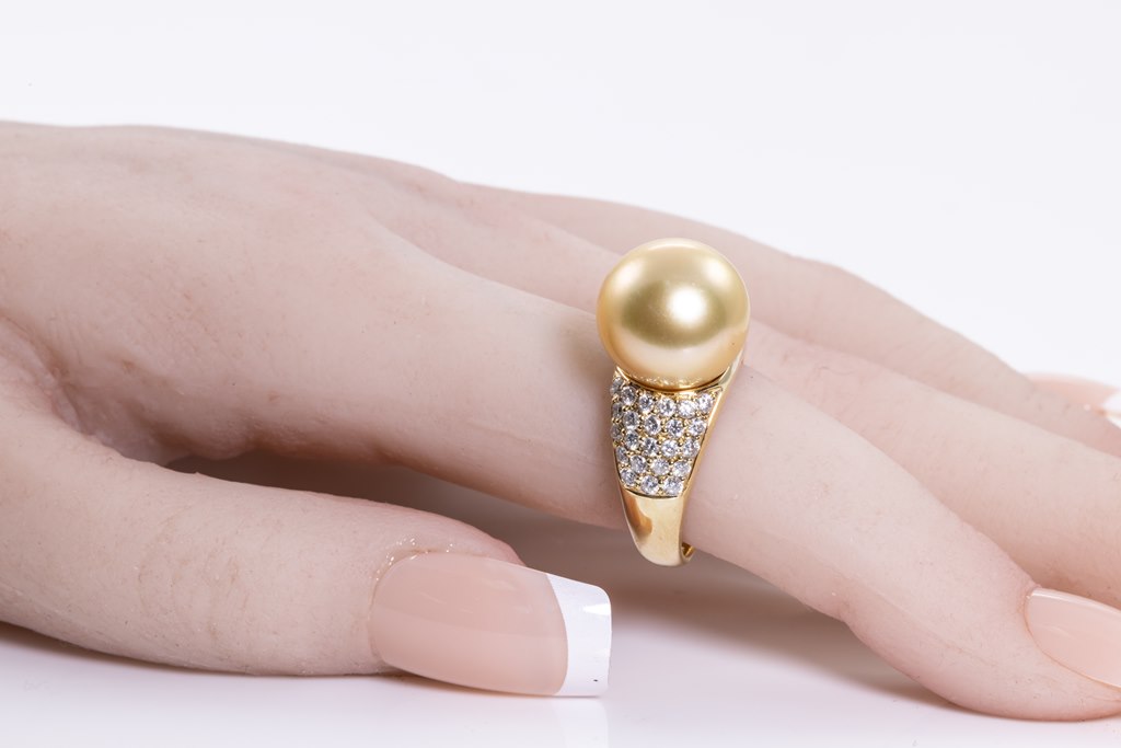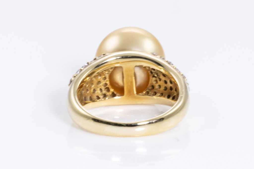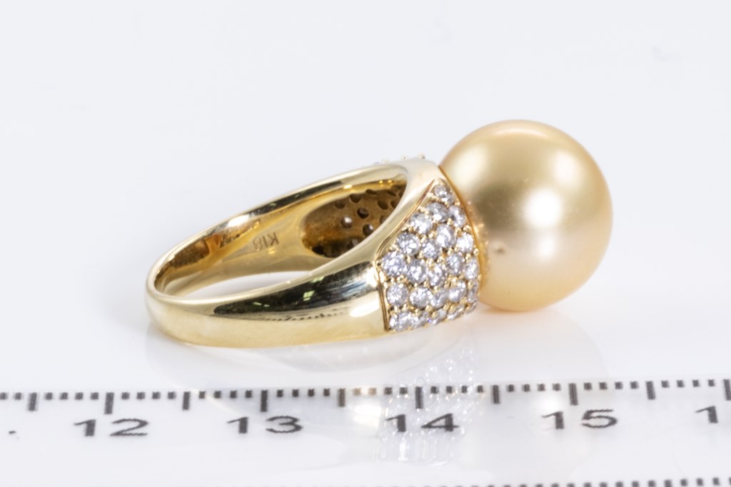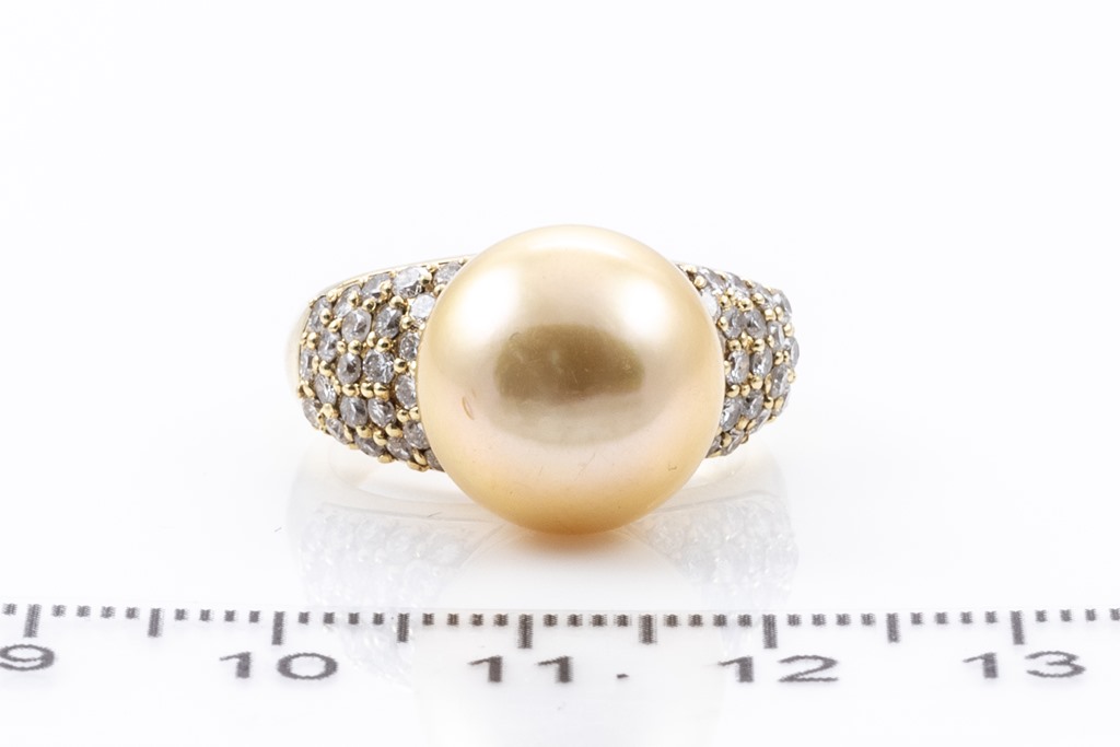Pearl and Diamond ring with golden South Sea Pearl of 13.0mm and round Diamonds totalling 0.93cts (Estimated grading: G SI-P1). 18ct yellow gold. Ring size: N - ring resizing is not recommended. Weight: 12g. (Pre-owned)