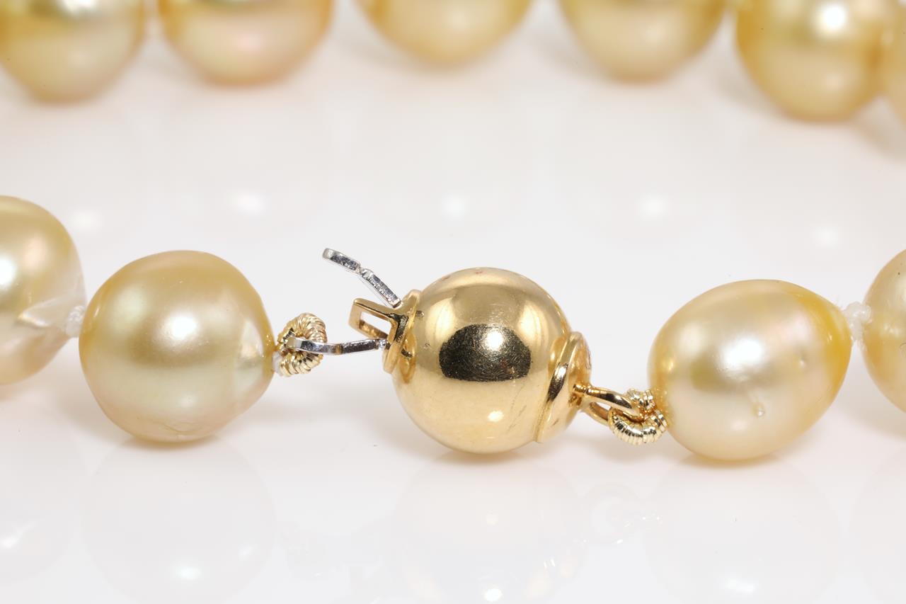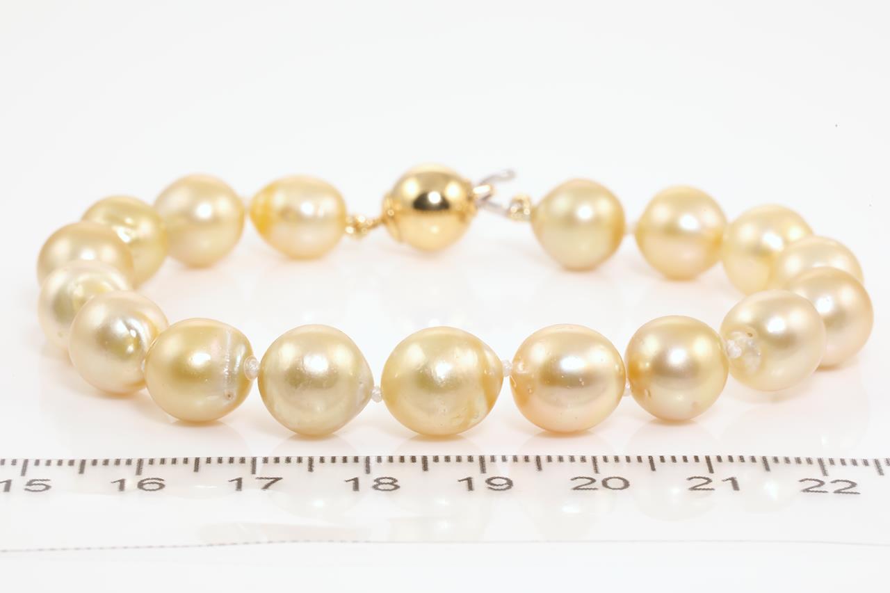 Pearl bracelet with 17 slightly graduated Golden South Sea Pearls of 8.5mm-9.9mm. With gold clasp. 18ct yellow gold. Length: 20cm. Weight: 20g. (Pre-owned)