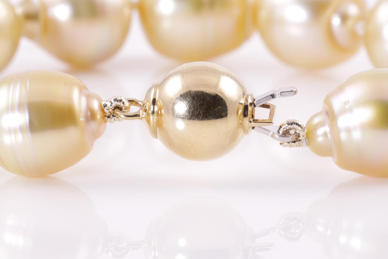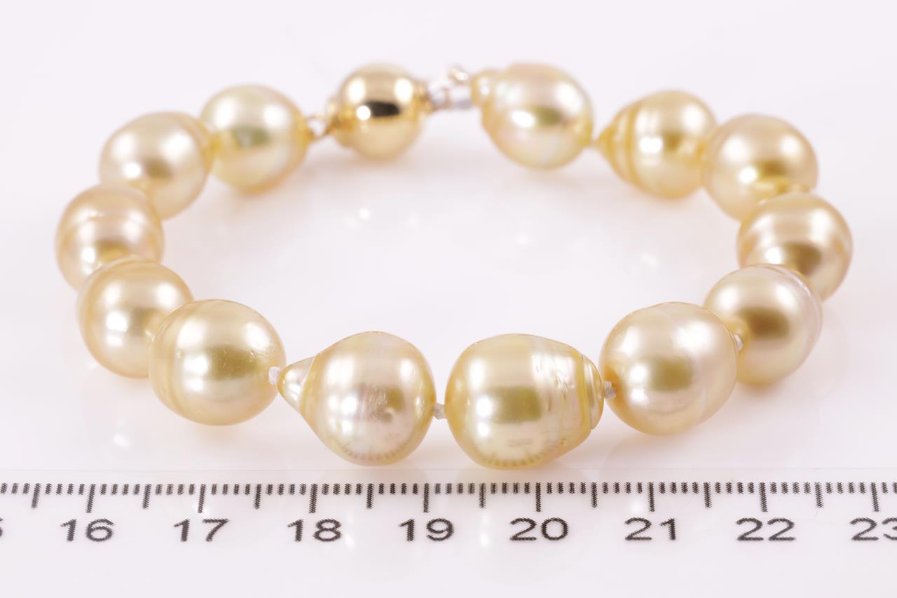 Pearl bracelet with 13 slightly graduated Golden South Sea Pearls of 10.5mm-12.3mm. With 18ct yellow gold clasp. 18ct yellow gold. Length: 20cm. Weight: 32.3g. (Pre-owned)