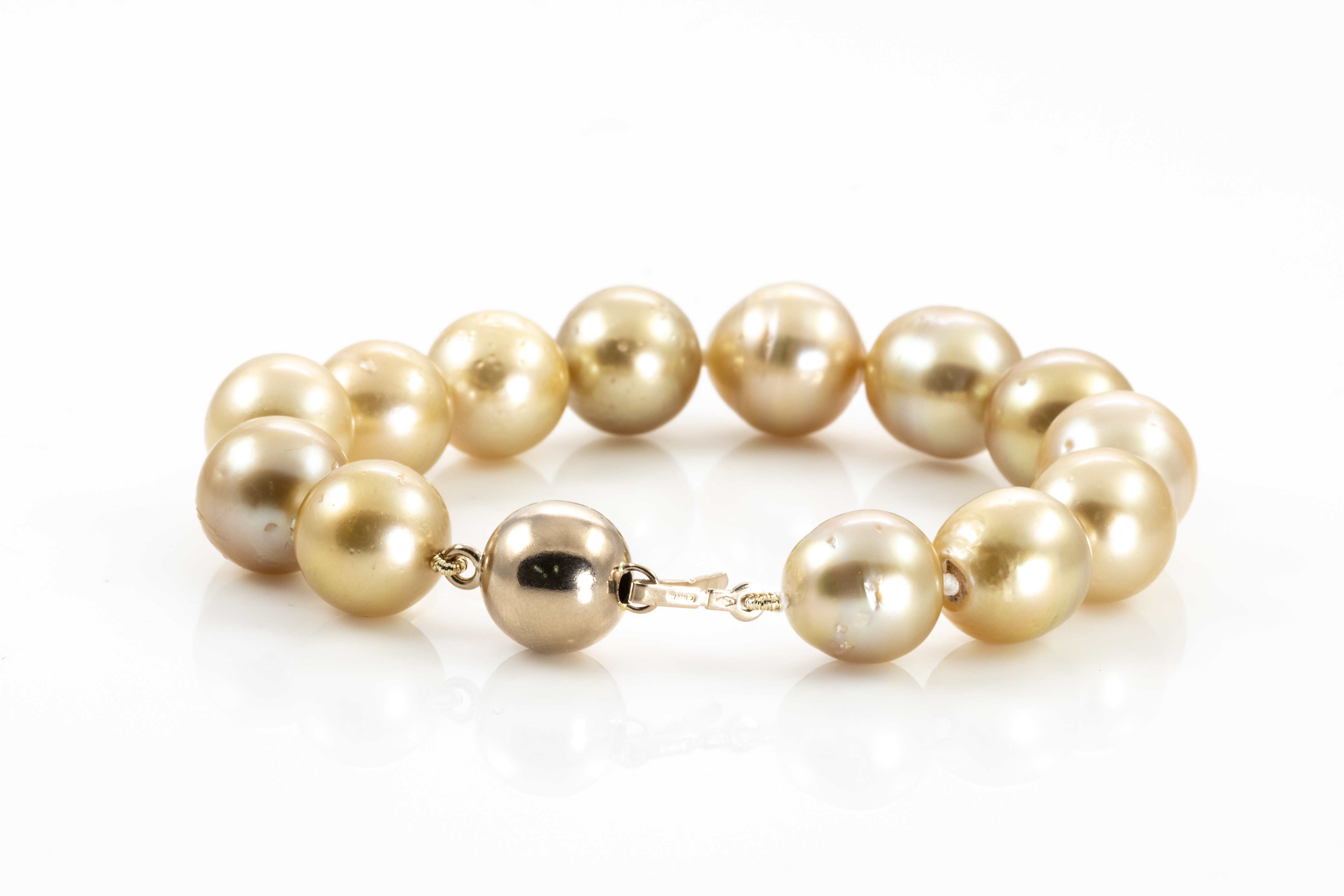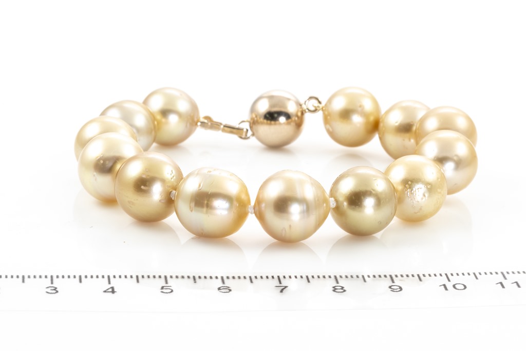 Pearl bracelet with 13 Golden South Sea Pearls of 12.0mm -13.5mm. 18ct yellow gold clasp. Length: 20cm. Weight: 41.8g. (Pre-owned)