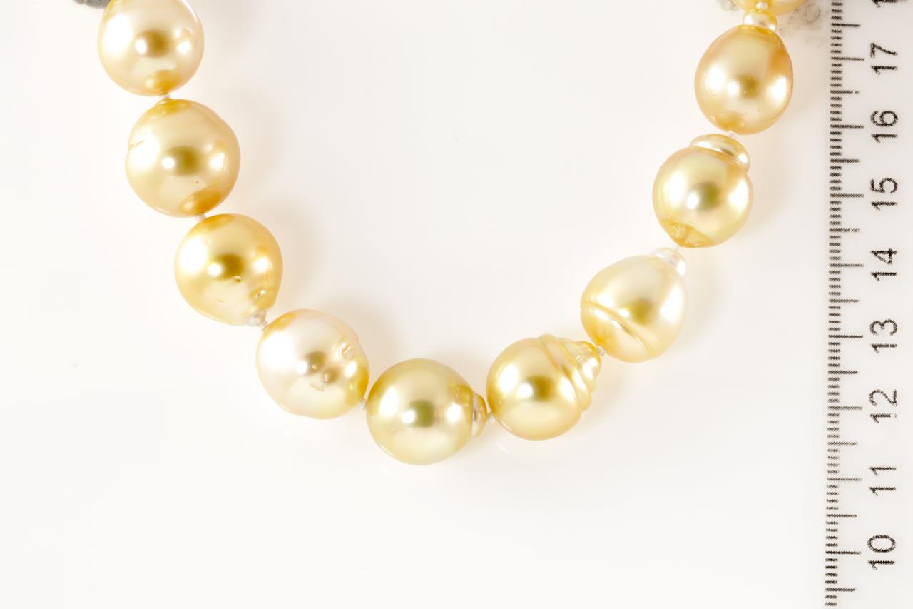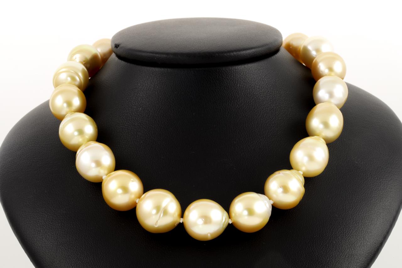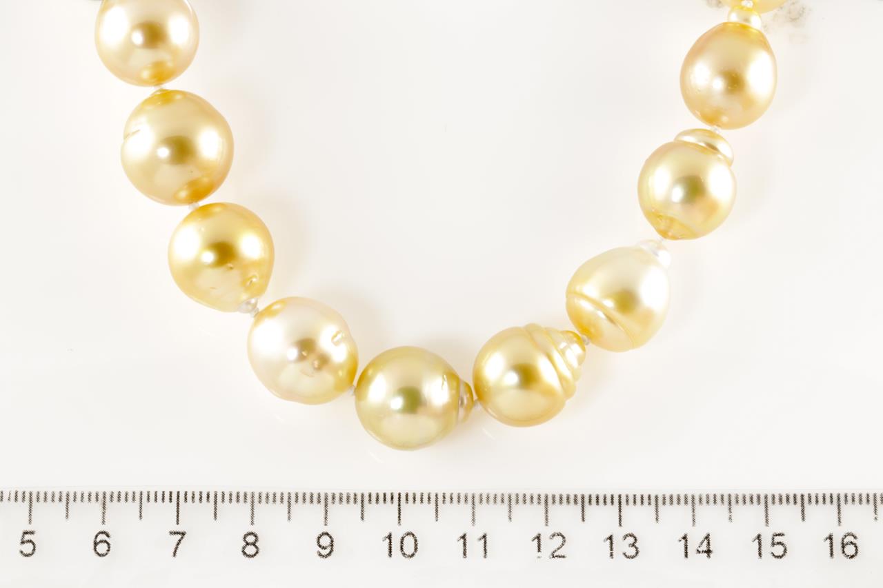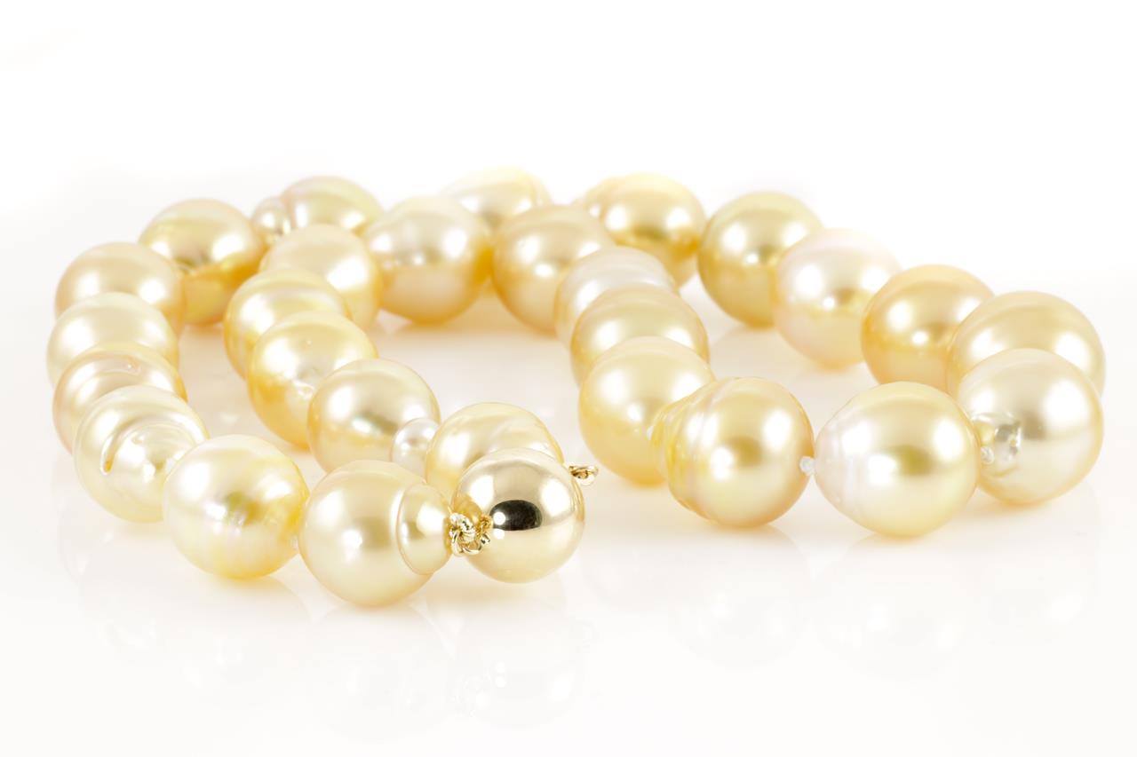 Pearl necklace with 27 graduated Golden South Sea Pearls of 15.6mm-12.2mm. With 14ct gold 12mm clasp. Length: 46cm. Weight: 103g (New)
