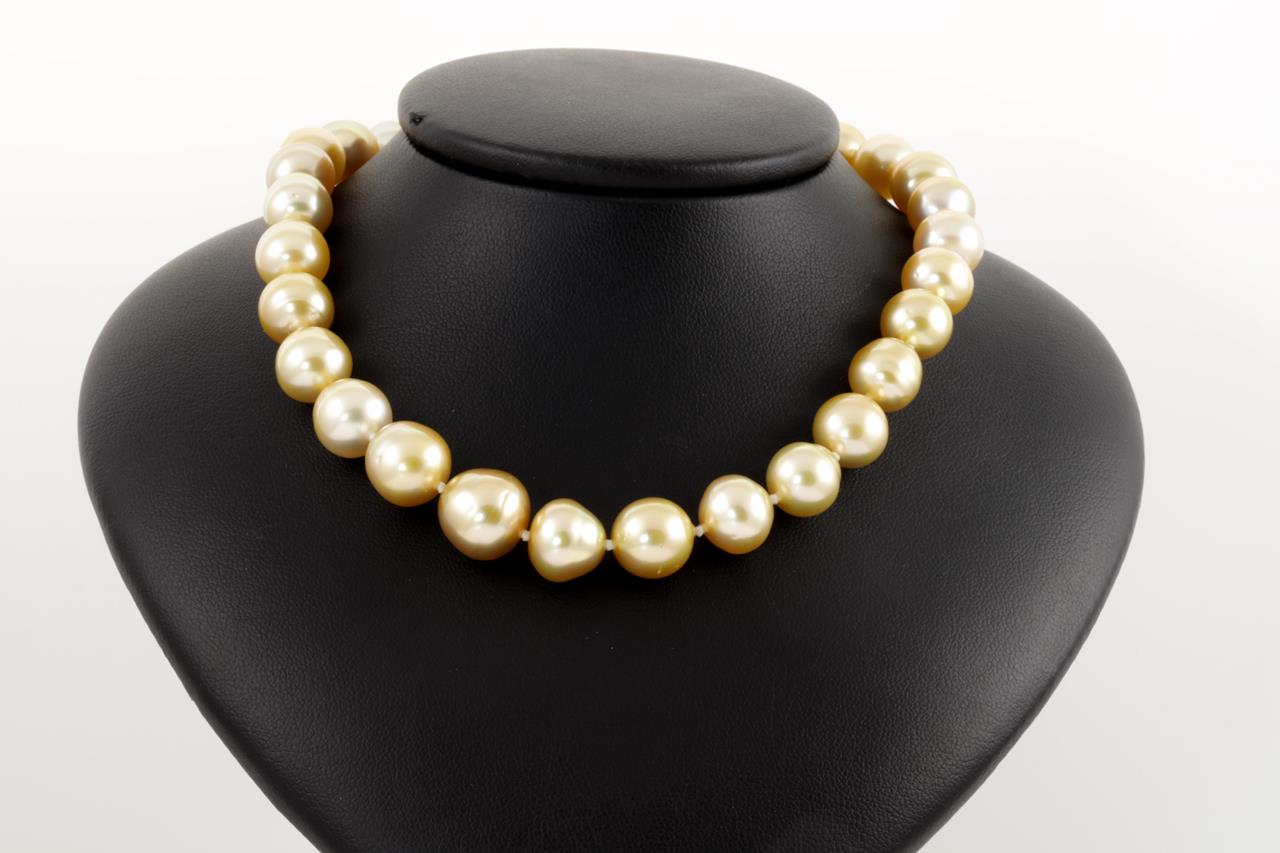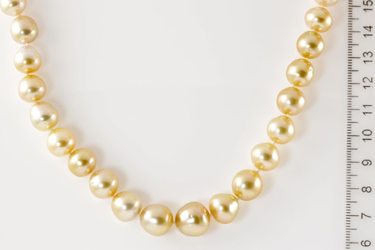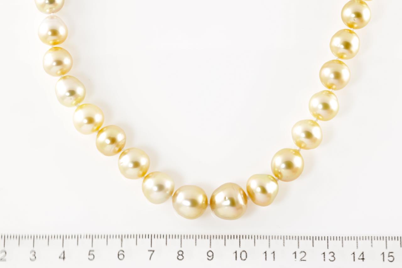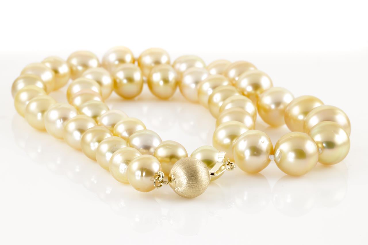 Pearl necklace with 41 graduated Golden South Sea circle Pearls of 12.8mm-9.0mm. With 14ct gold 10mm clasp with matte finish. Length: 45cm. Weight: 63.6g (New)