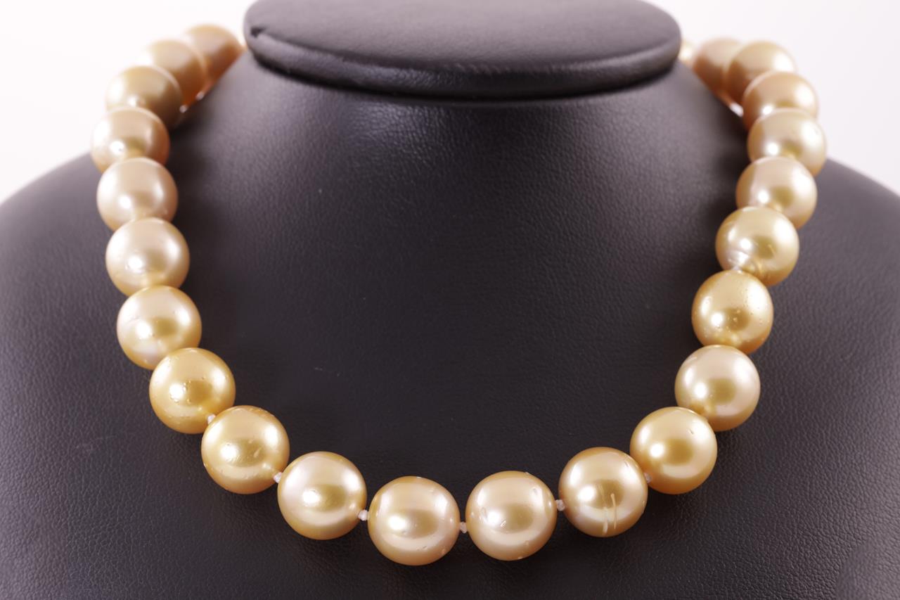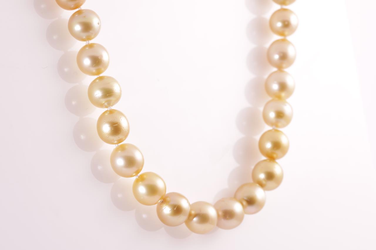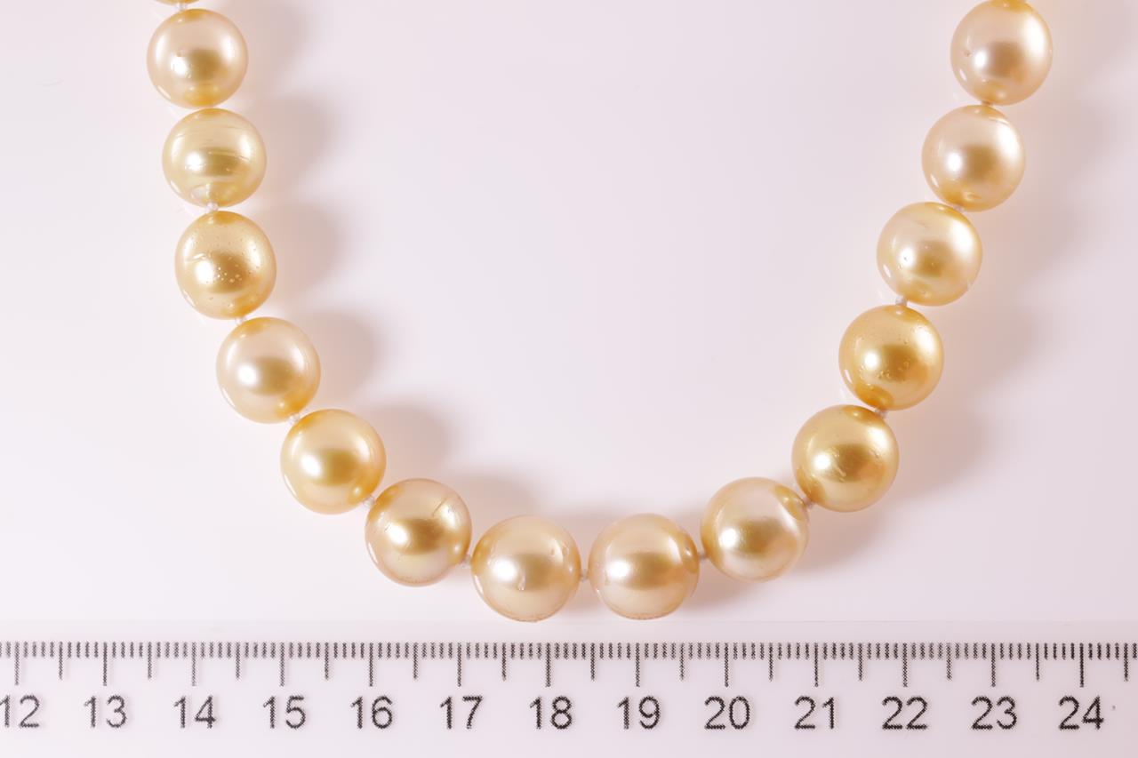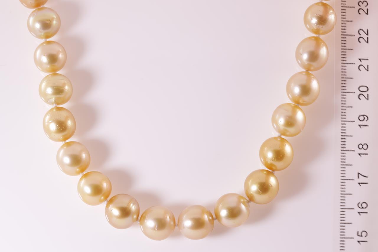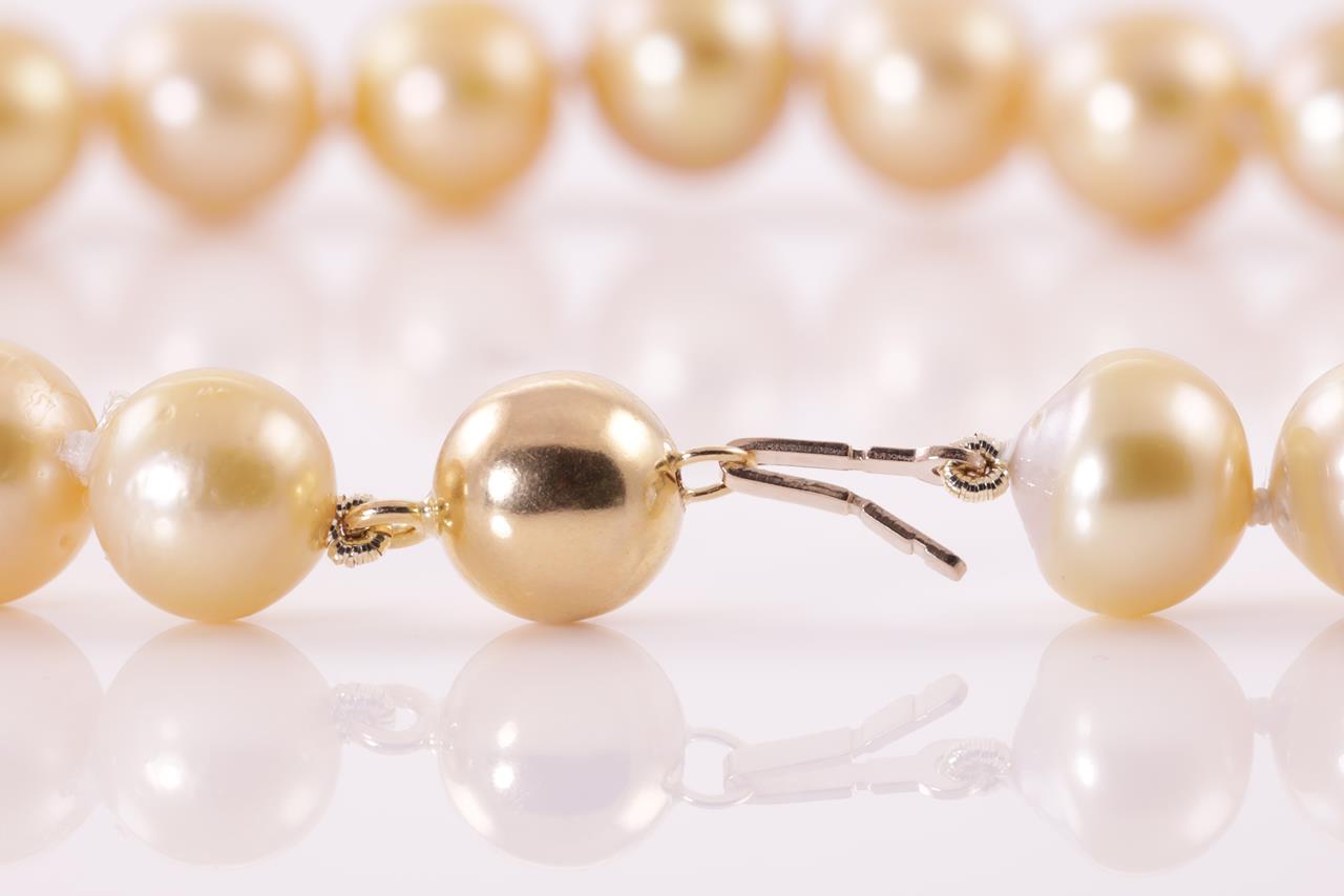 Pearl necklace with 35 Golden South Sea Pearls of 10.1mm-12.00mm. With 18ct yellow gold clasp. Length: 45cm. Weight: 77.2g (Pre-owned)
