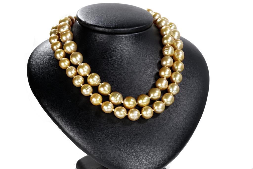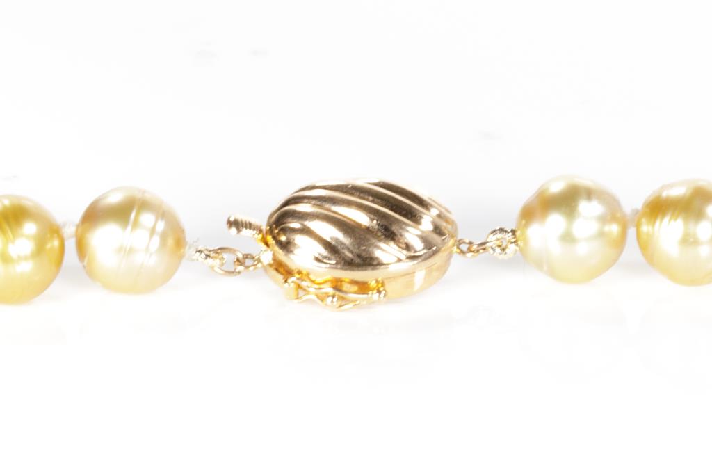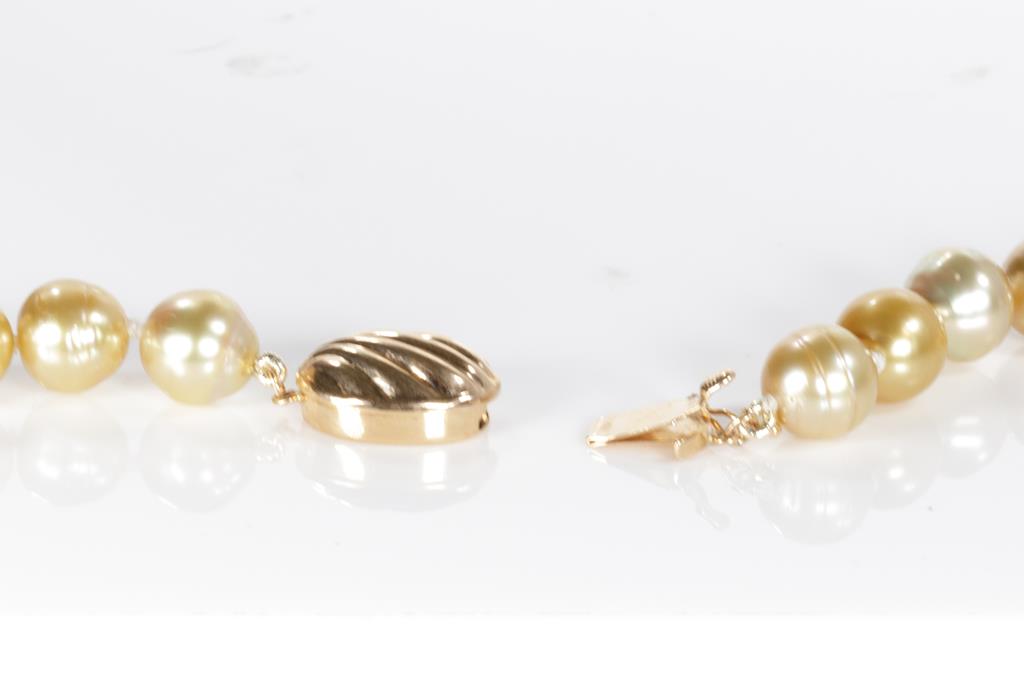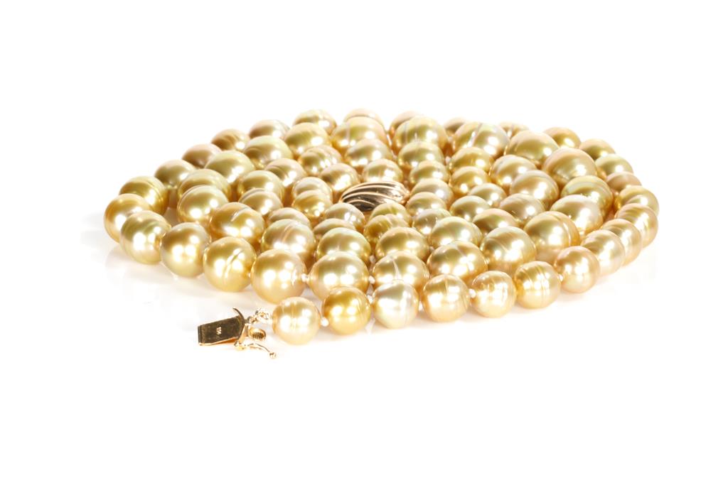 Golden Pearl Necklace, with 79 ringed Golden South Sea Pearls of 9-10mm. 14ct yellow gold clasp. Length 95cm. Weight 130g. (Pre-owned)