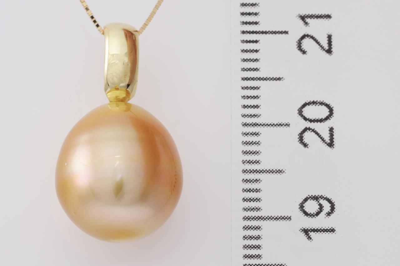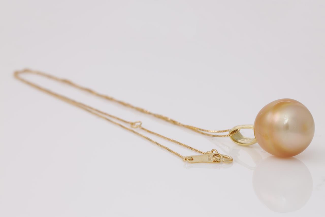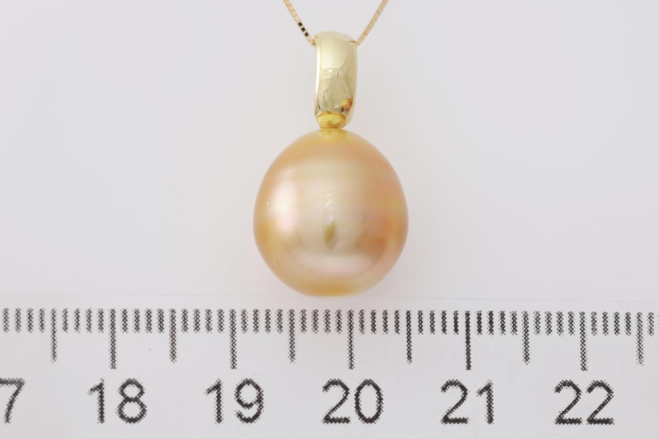 Pearl pendant with a drop shape Golden South Sea Pearl of 13.3m. 18ct yellow gold with 40cm 18ct gold adjsuatble chain. Weight: 5.2g. (Pre-owned)