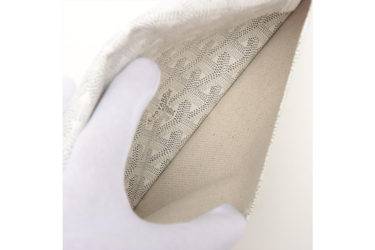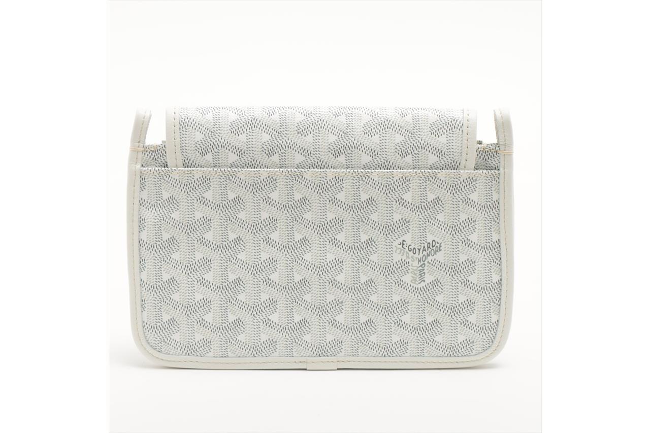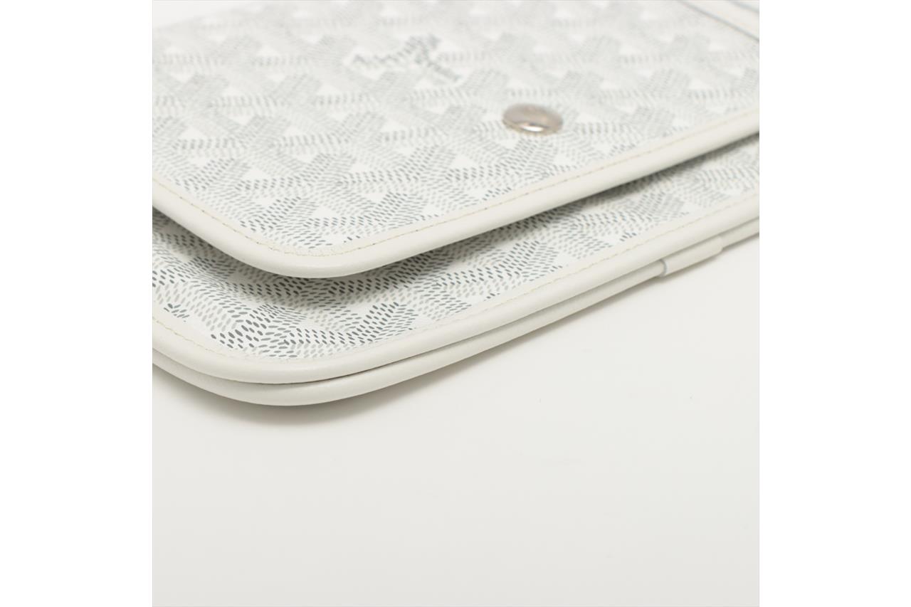 Goyard Plumet wallet clutch in white Goyard monogram coated canvas. Featuring leather trim, silver-toned hardware, an exterior pocket at the back, fold over top with snap button. The top opens to fabric lining interior with 3 compartments. Approximate dimensions: 20.5cm(L) x 13.5cm(H) x 2cm(D). Note: shoulder strap NOT included. With Entrupy Certificate of Authenticity. (Pre-owned)