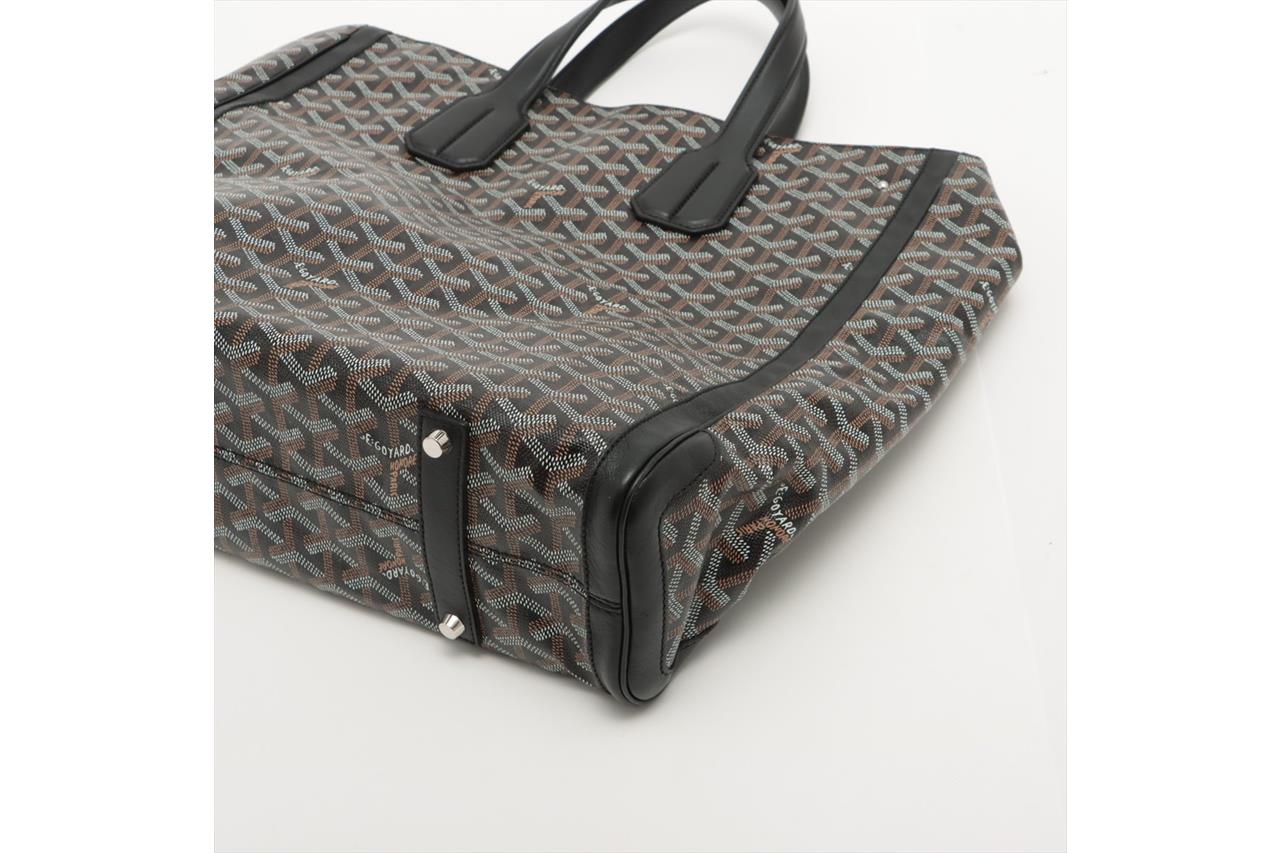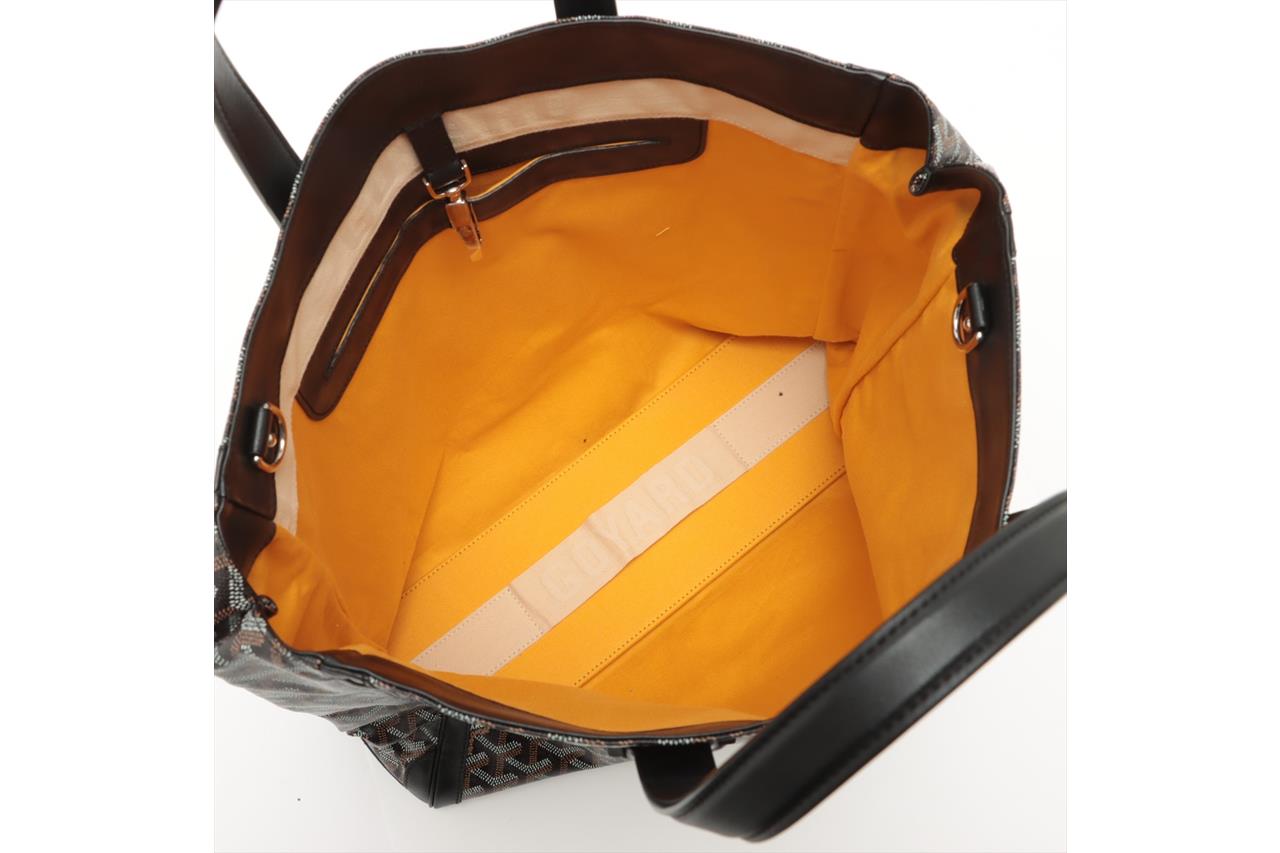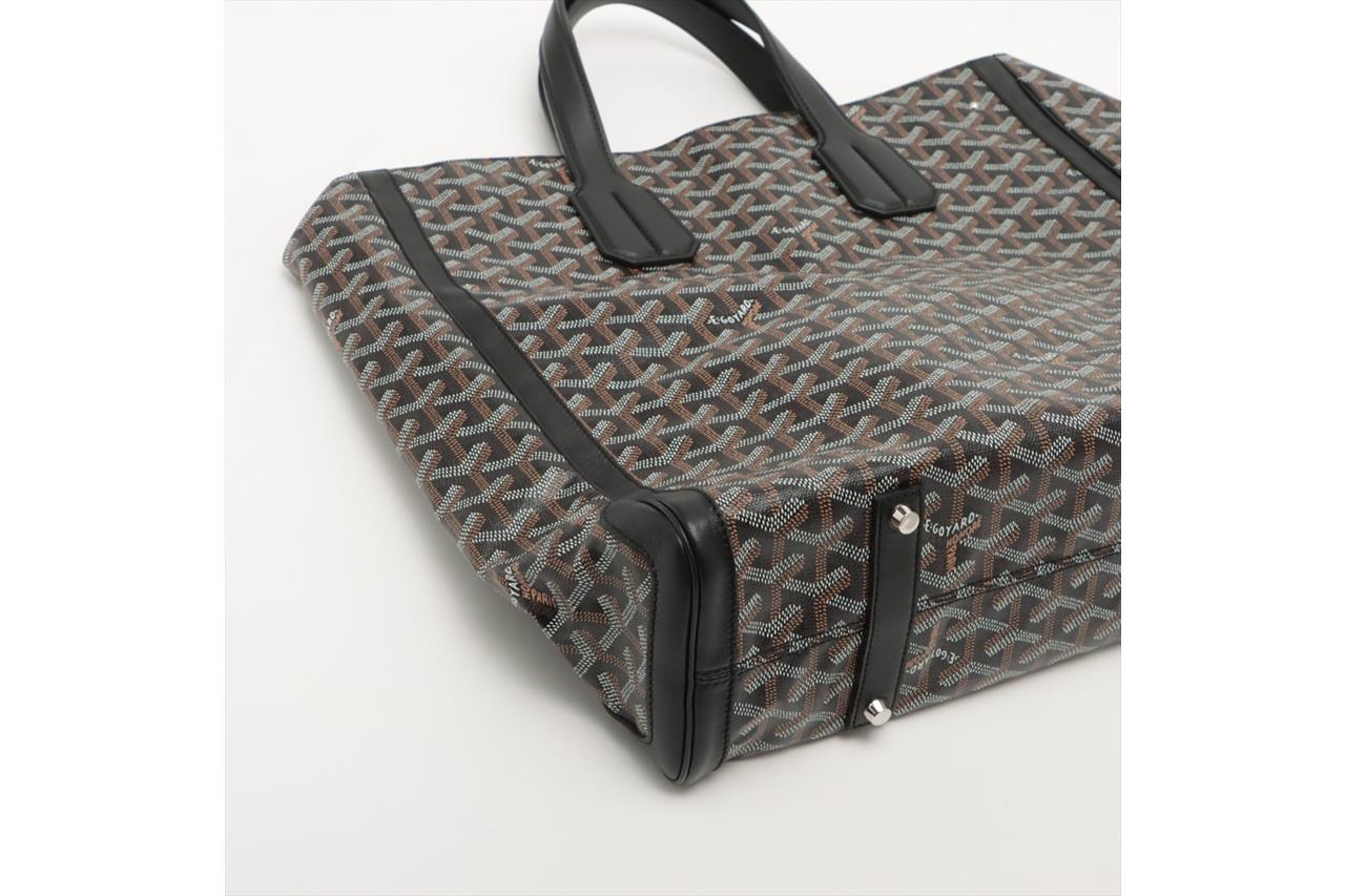Goyard Sac Voltaire Tote Bag in PVC Coated Canvas and Black Leather Exterior. Featuring silver-tone hardware, yellow textile lining with single flat pocket, and clasp closure. Approximate dimensions: 38cm (L) x 37cm (H) x 11.5cm (D), 12.5cm handle height, and 57cm adjustable and detachable shoulder strap. Accompanied by Goyard bottom board and dust bag. With Entrupy Certificate of Authenticity. (Pre-owned)