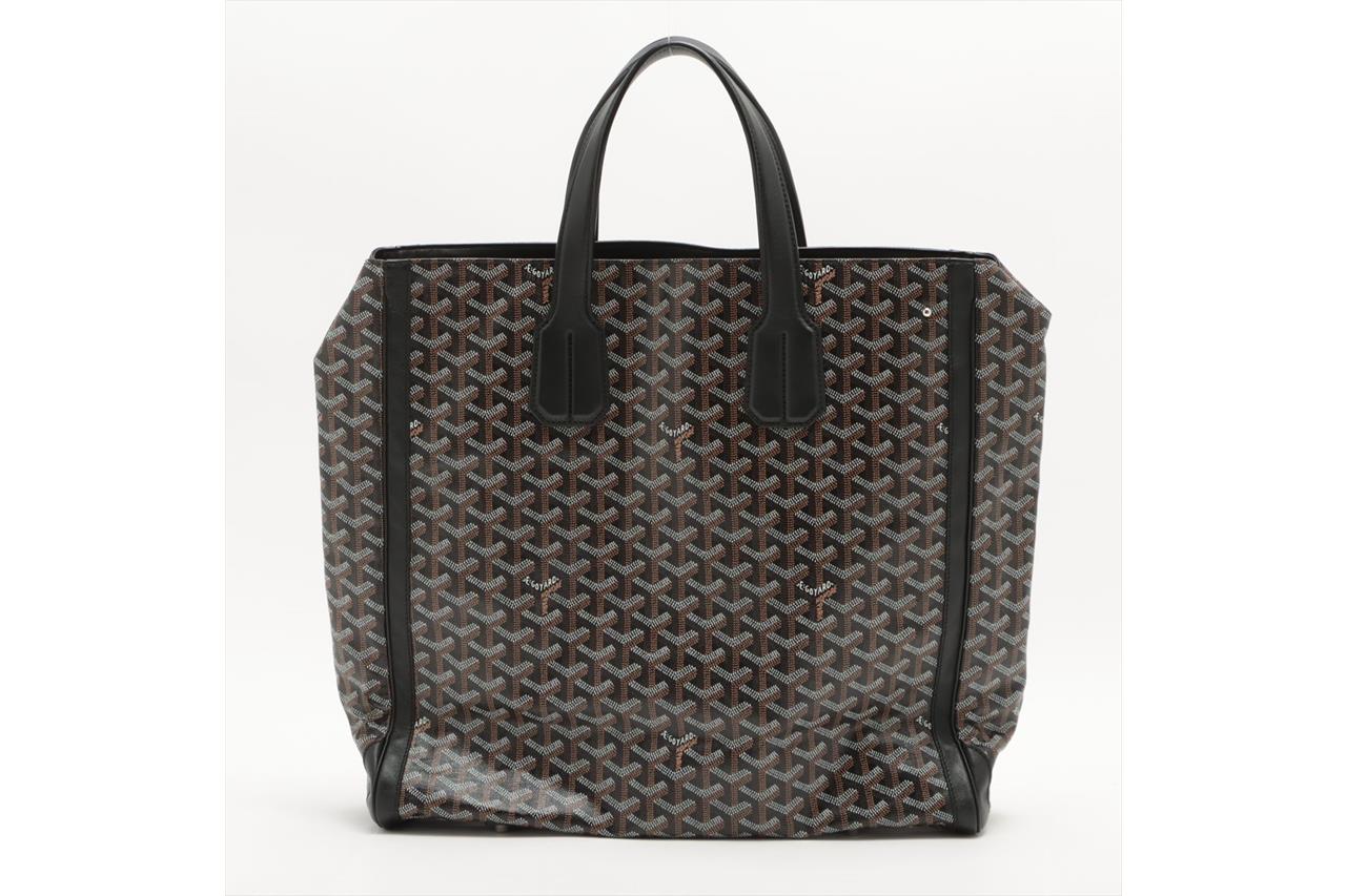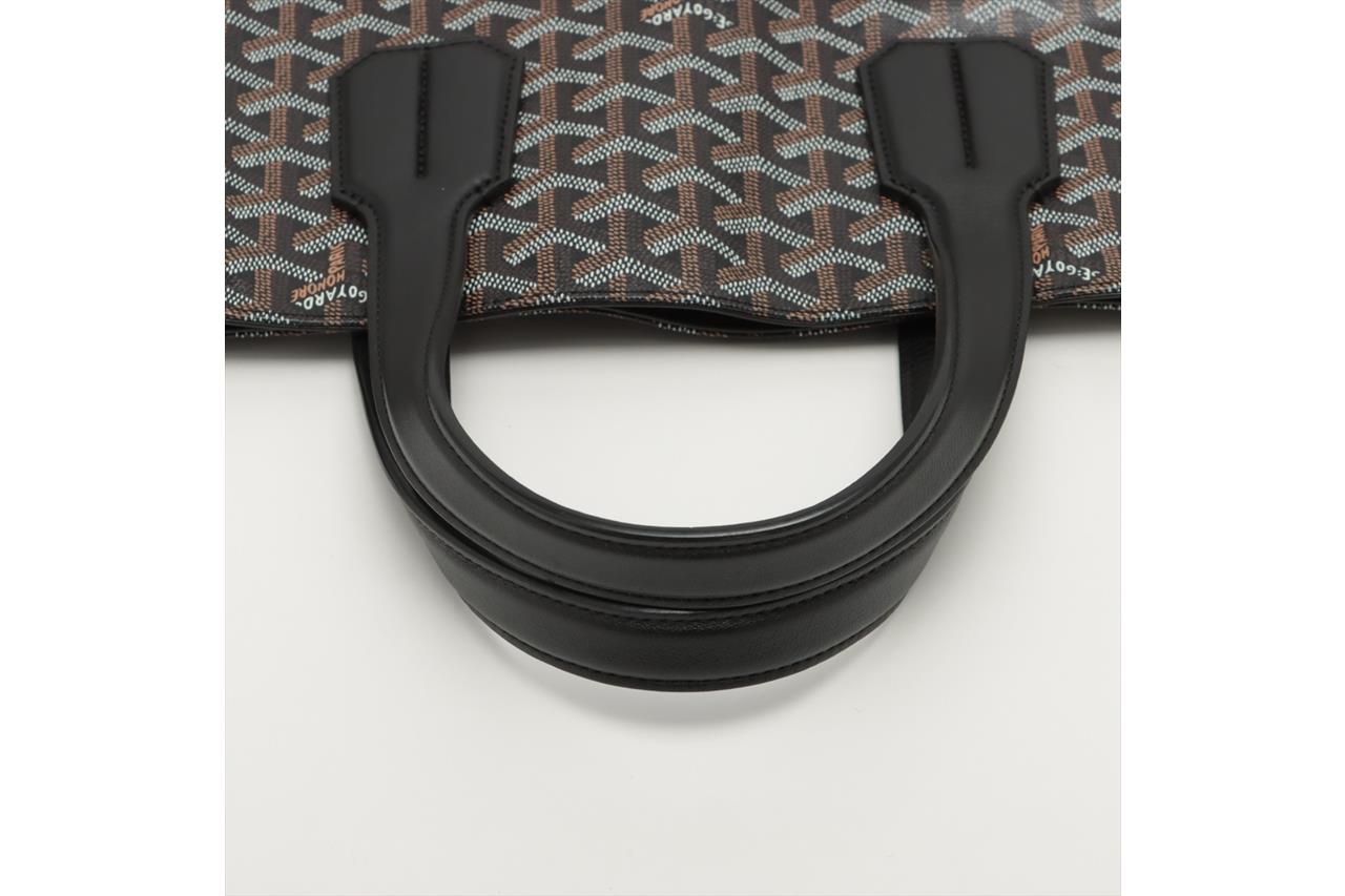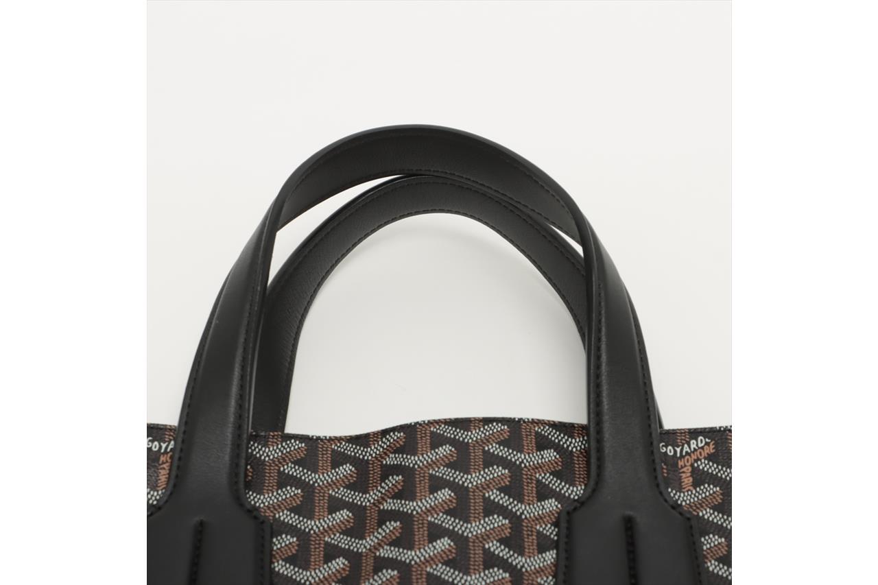 Goyard Sac Voltaire Tote Bag in PVC Coated Canvas and Black Leather Exterior. Featuring silver-tone hardware, yellow textile lining with single flat pocket, and clasp closure. Approximate dimensions: 38cm (L) x 37cm (H) x 11.5cm (D), 12.5cm handle height, and 57cm adjustable and detachable shoulder strap. Accompanied by Goyard bottom board and dust bag. With Entrupy Certificate of Authenticity. (Pre-owned)