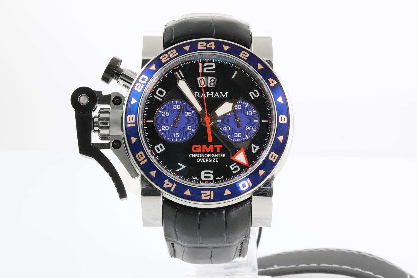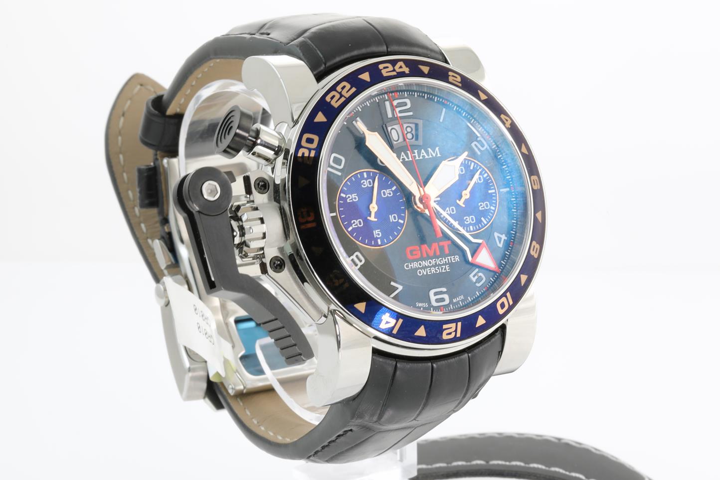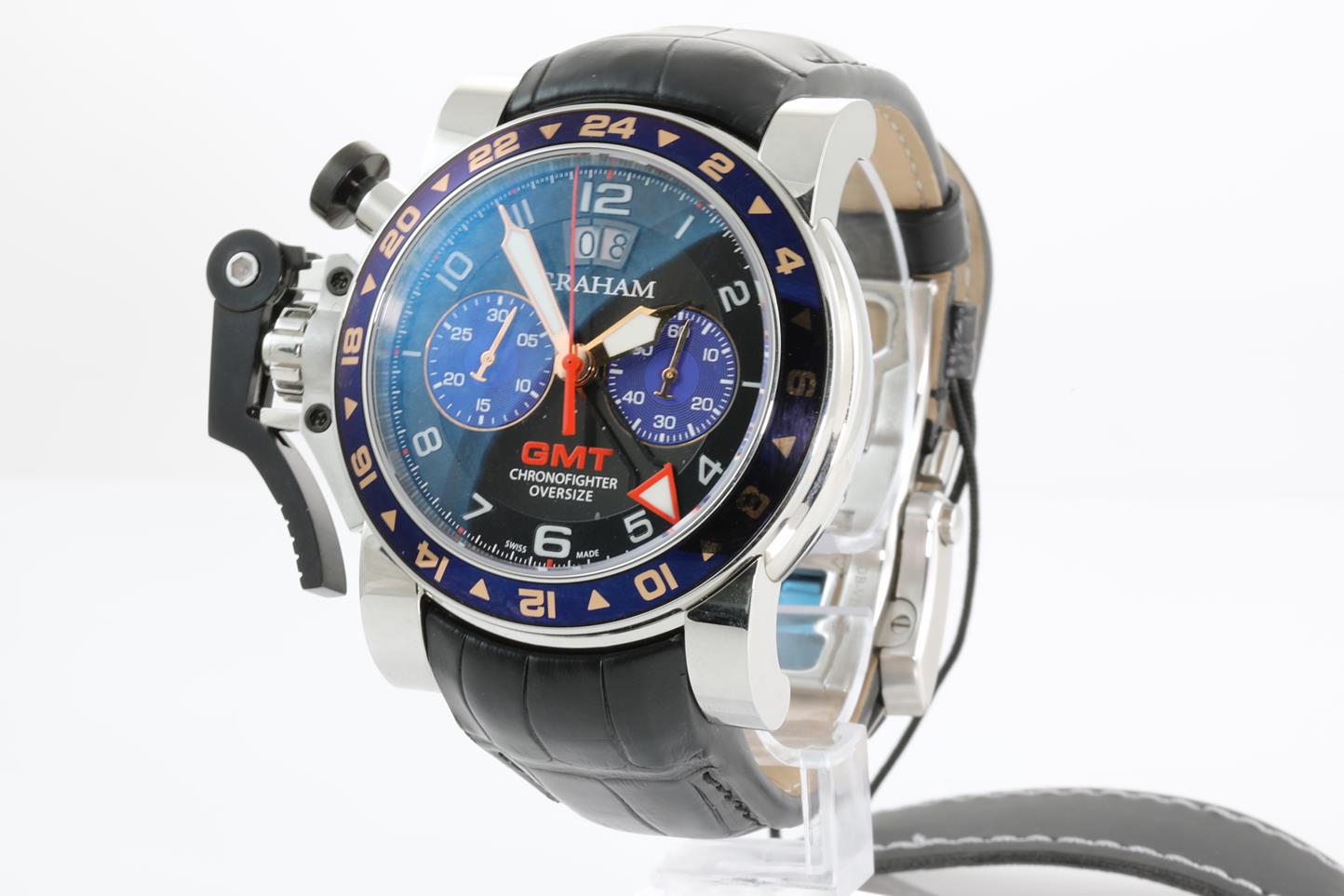 Graham Chronofighter Oversize GMT stainless steel automatic mens watch. Black dial, date, case diameter: 47mm, Swiss made. Ref #2OVGS.B26A.C118F. With Graham black leather strap and clasp. Note: Designed to be worn on the right arm and slight wear on strap due to being display stock. With Graham watch passport inside Graham worn box. 3 month FSA warranty. (New)