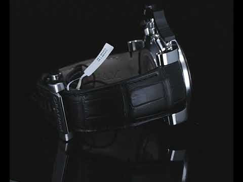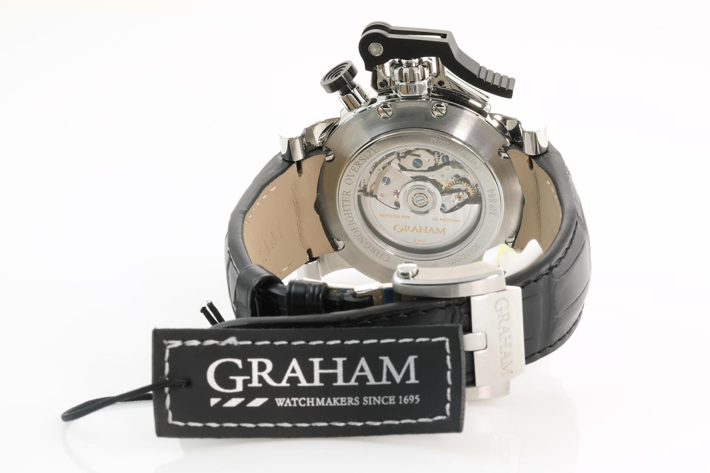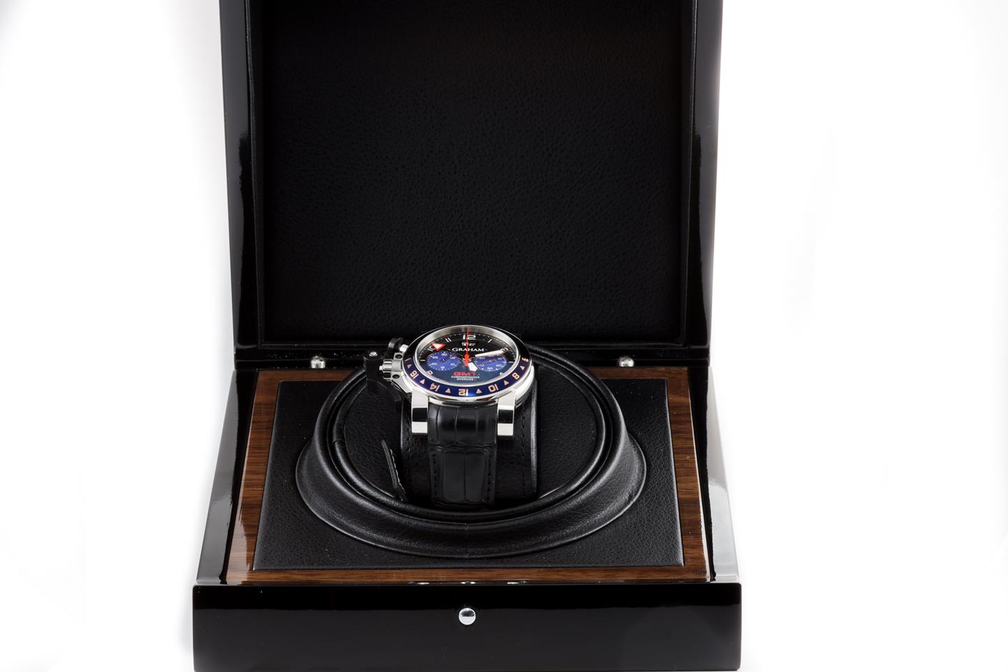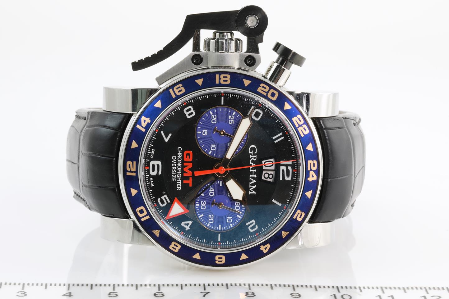 Graham Chronofighter Oversize GMT stainless steel automatic mens watch. Black dial, date, case diameter: 47mm, Swiss made. Ref #2OVGS.B26A.C118F. With Graham black leather strap and clasp. Note: Designed to be worn on the right arm and slight wear on strap due to being display stock. With Graham watch passport inside Graham worn box. 3 month FSA warranty. (New)