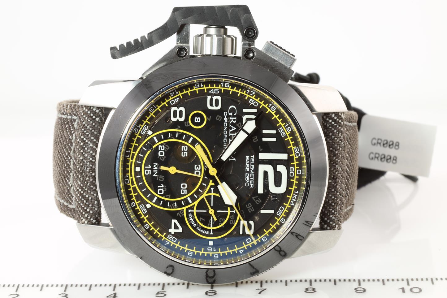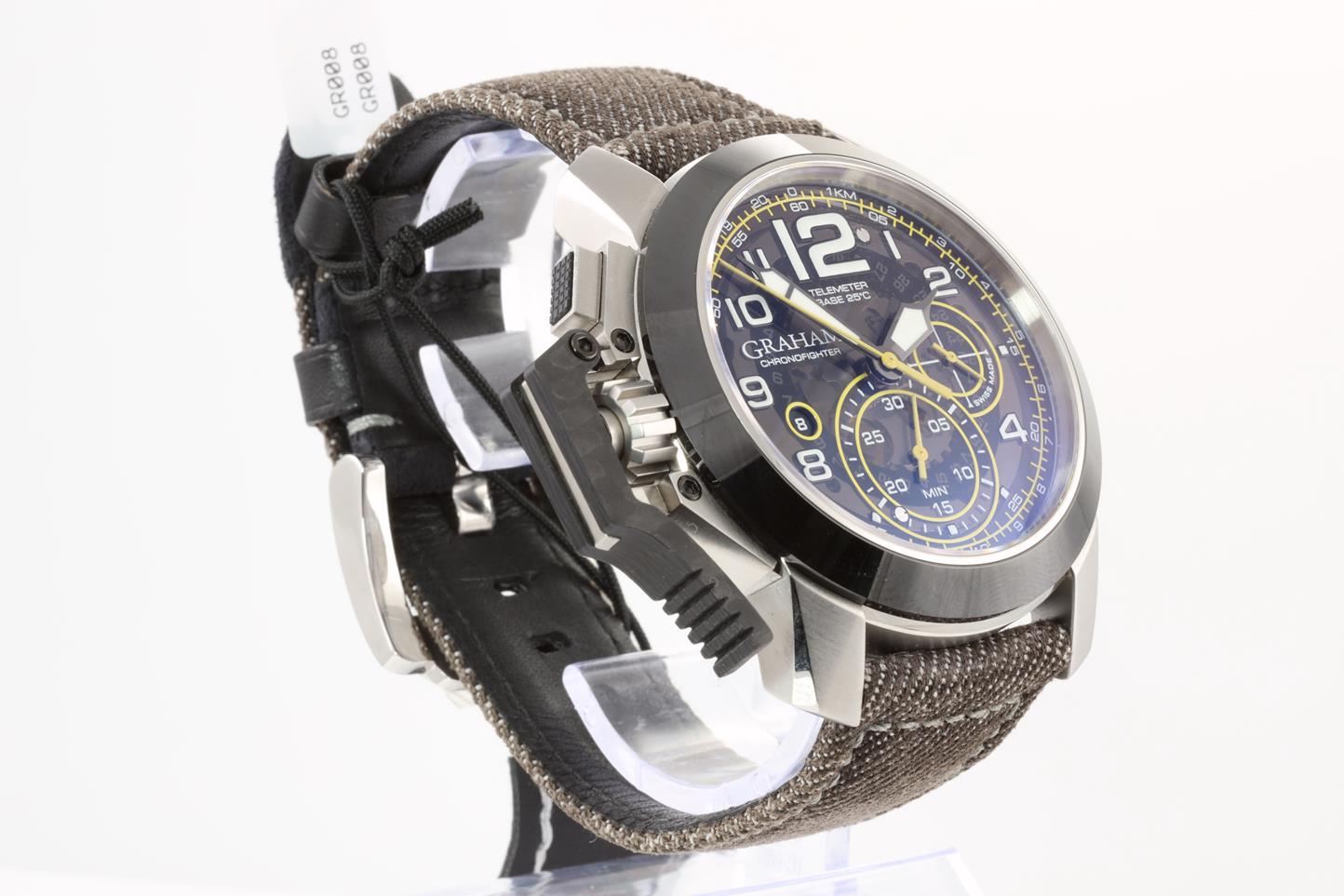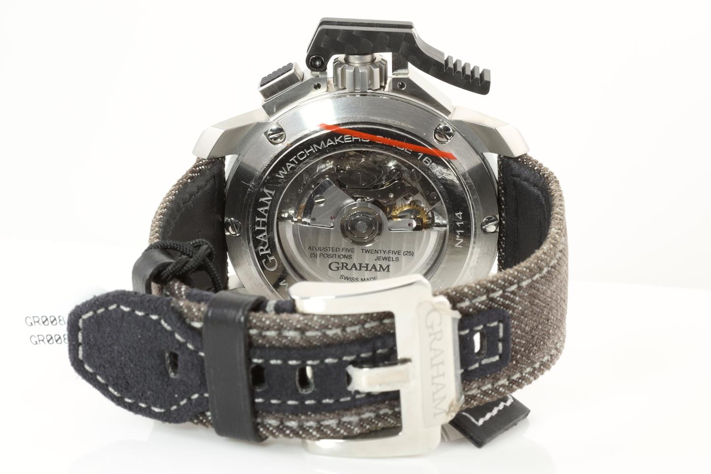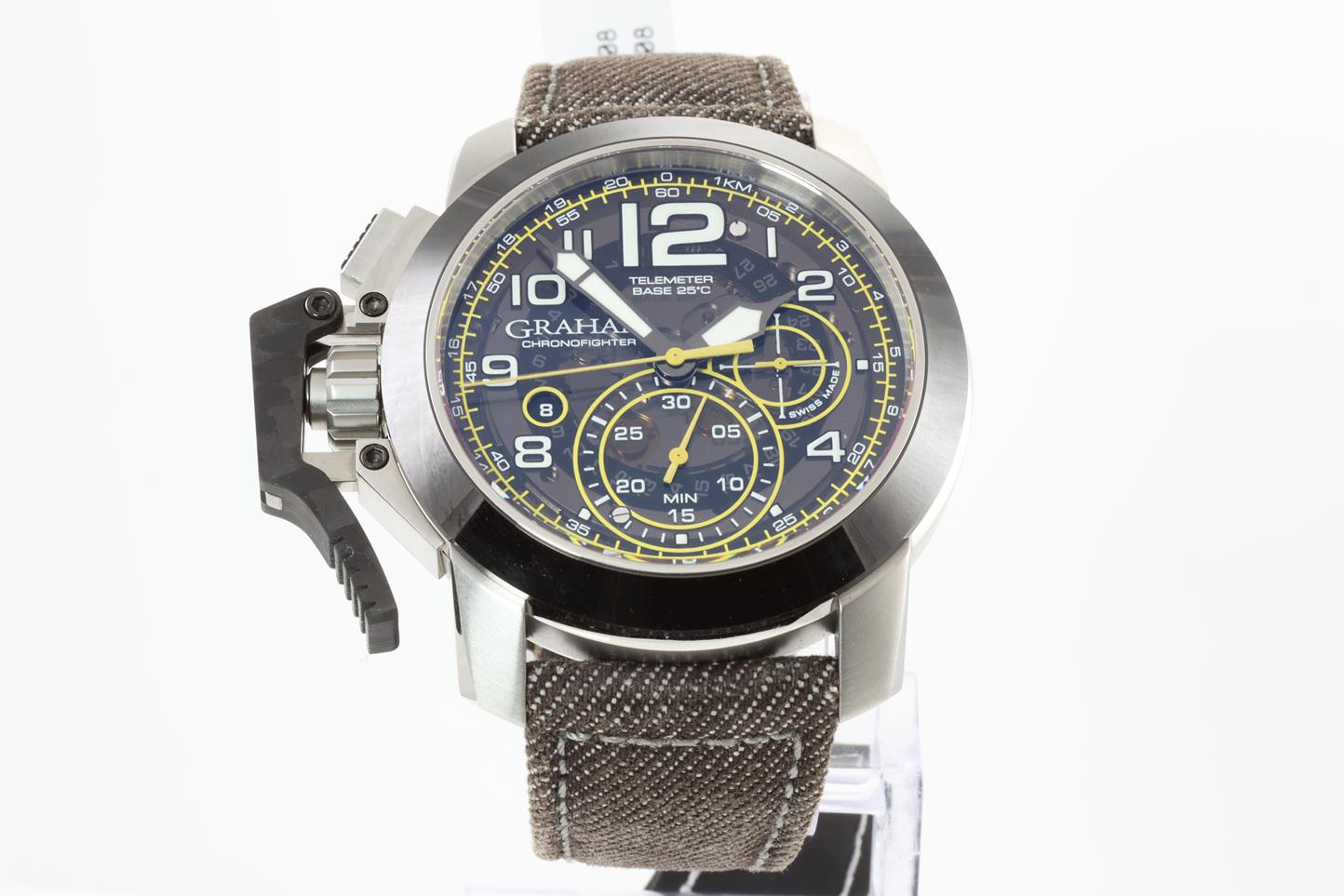 Graham Chronofighter Oversize stainless steel automatic mens watch. Skeleton dial, black ceramic bezel, date, case diameter: 47mm, Swiss made. Ref #2CCAC.B16A.T34S. With Graham brown denim strap and clasp. Note: Slight wear on strap due to being display stock. With Graham watch passport and instruction manual. (New)