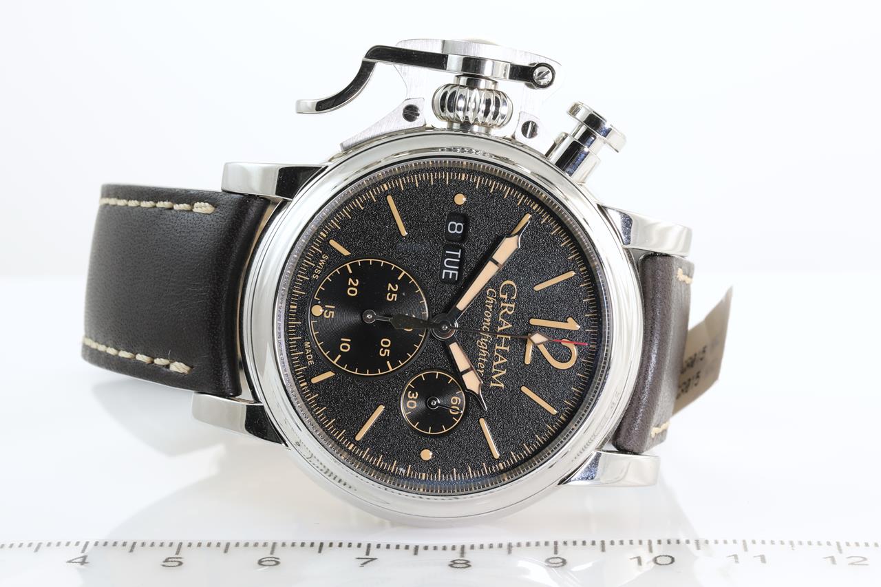 Graham Chronofighter Vintage stainless steel automatic men's watch. Black dial, day & date, small seconds, case diameter: 44mm. Swiss made. Ref#2CVAS.B01A.L126S. With Graham brown leather strap and clasp. Note: Note: Designed to be worn on the right arm and light wear due to being display stock. With Graham watch passport inside Graham box. 3 month FSA Warranty. (New)