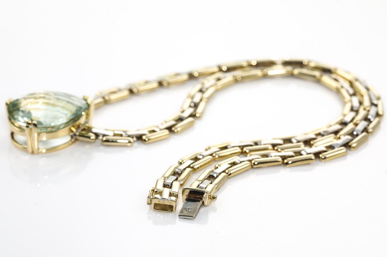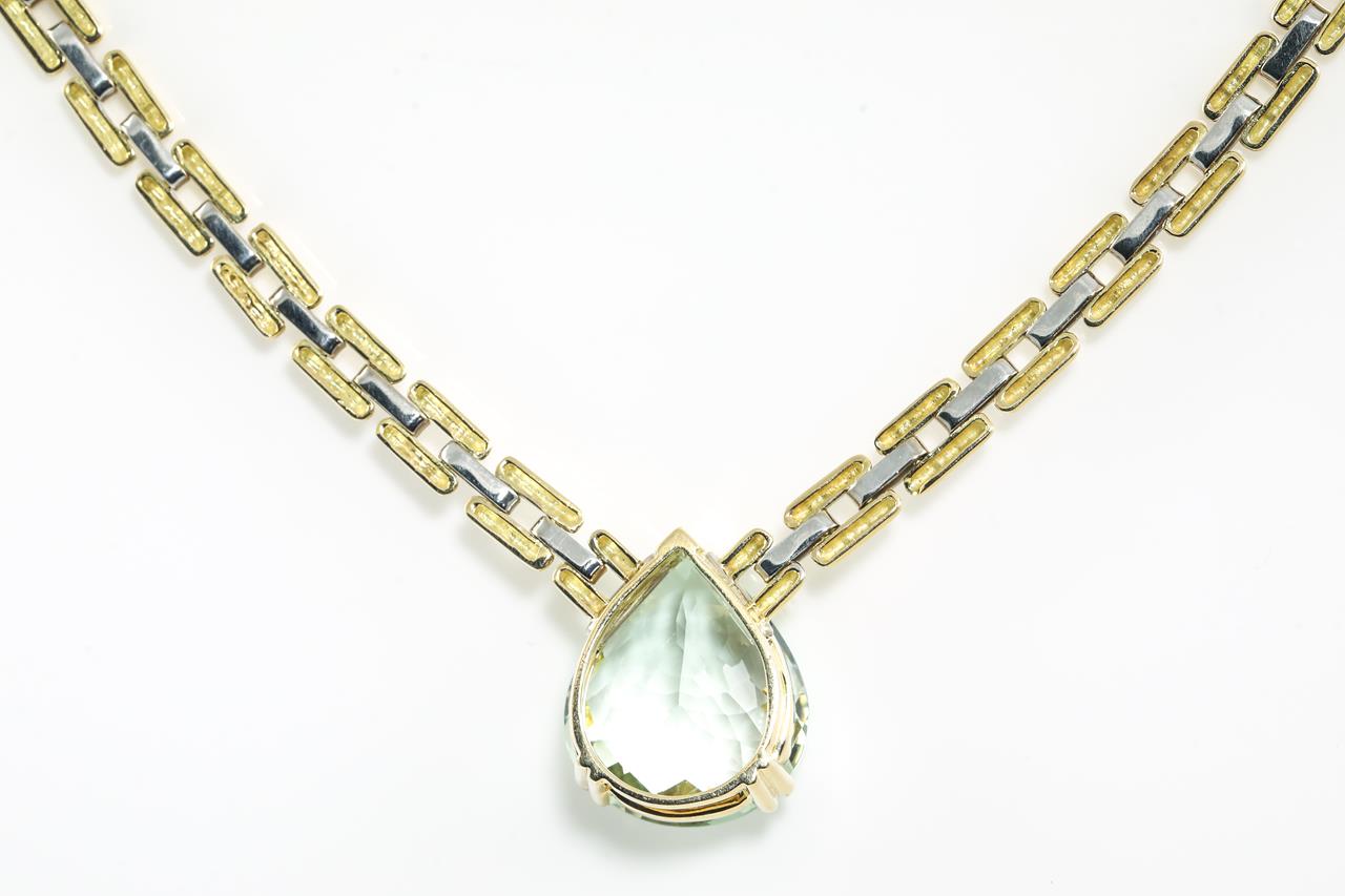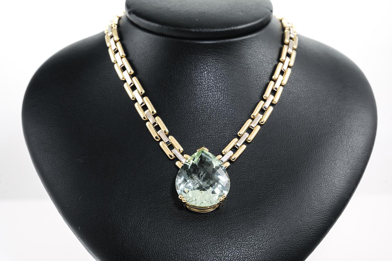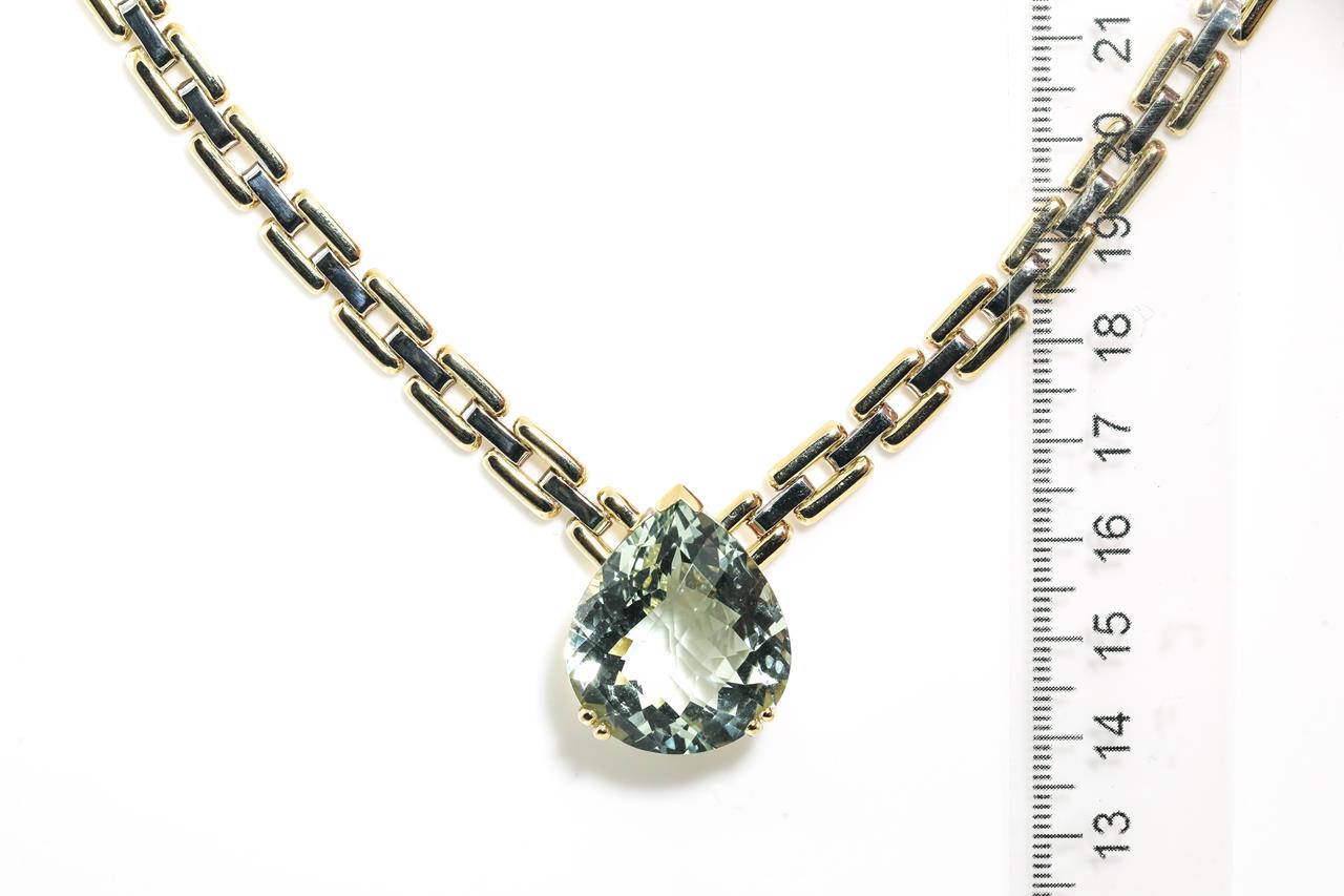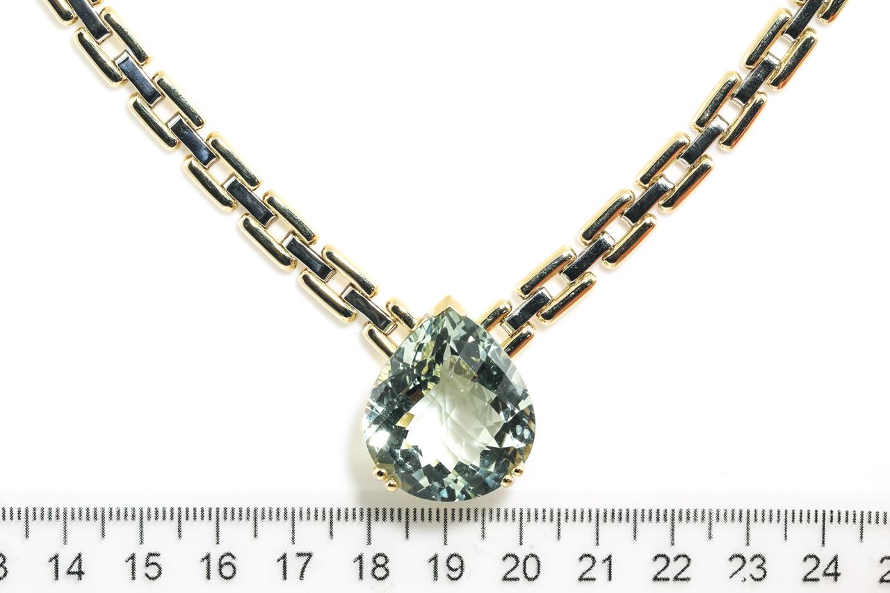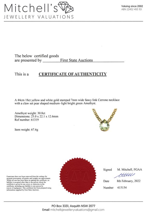 Amethyst necklace with a pear checkerboard cut Green Amethyst of approximately 30.00ct. 18ct yellow & white gold with attached chain. Length: 44cm. Weight: 67.6g With certificate #415154. (Pre-owned)