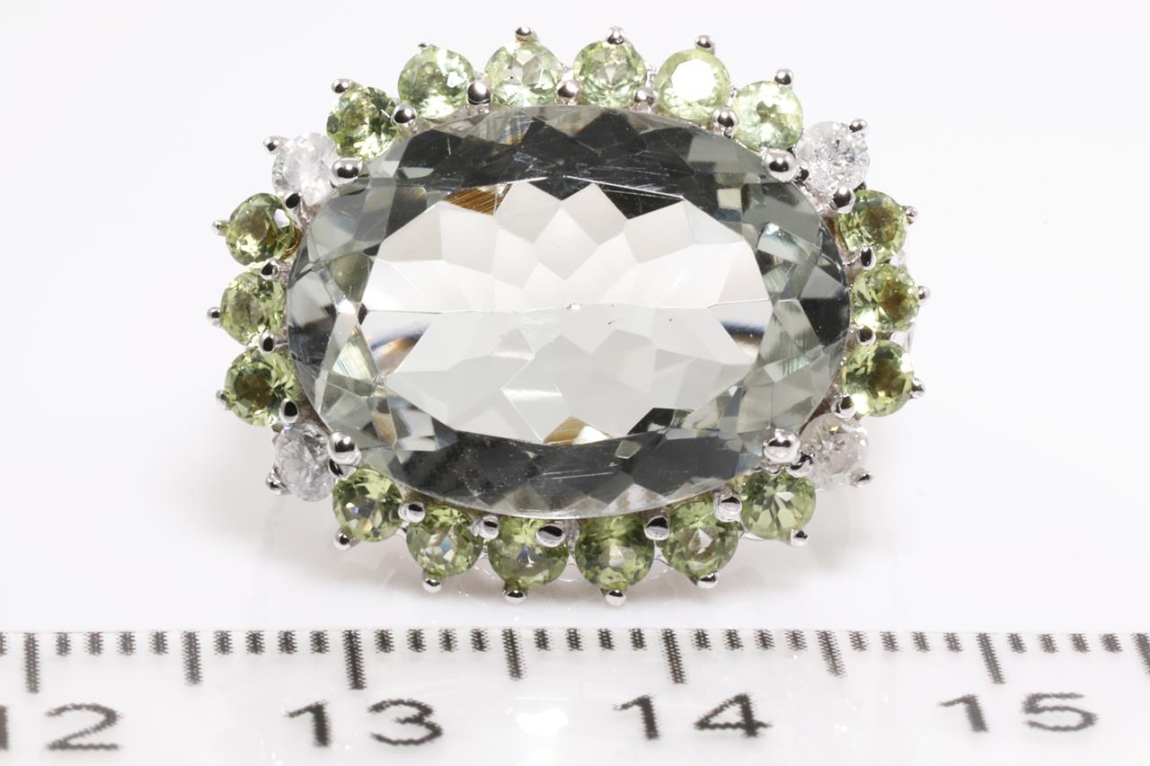 Amethyst, Peridot and Diamond Ring with oval cut green Amethyst of approximately 11.23ct, round Peridot totalling approximately 1.62cts and 4 round Diamonds totalling approximately 0.27cts. 14ct white gold. Ring size M1/2 - ring resizing is not recommended. Weight 10.5g. (Pre-owned)