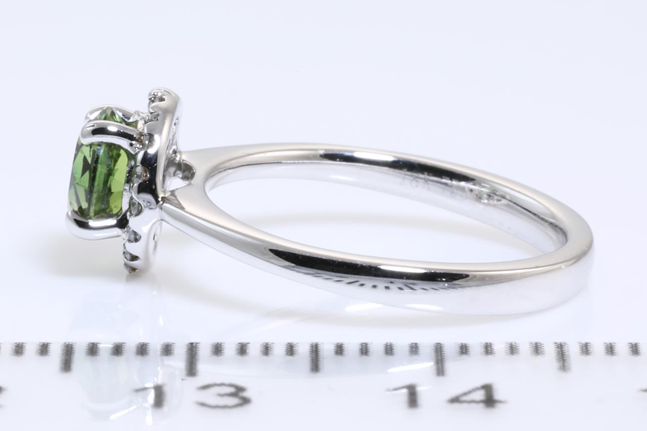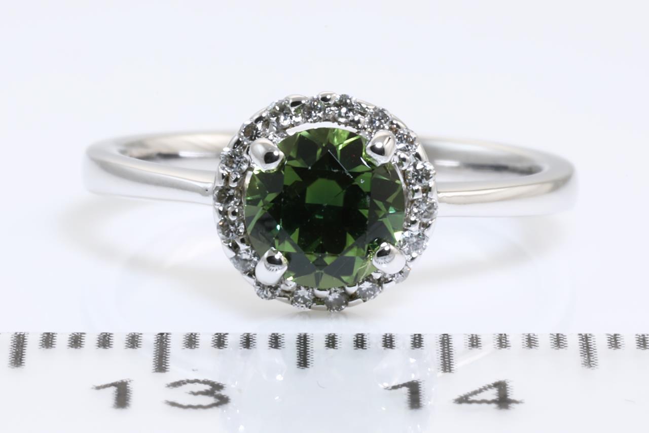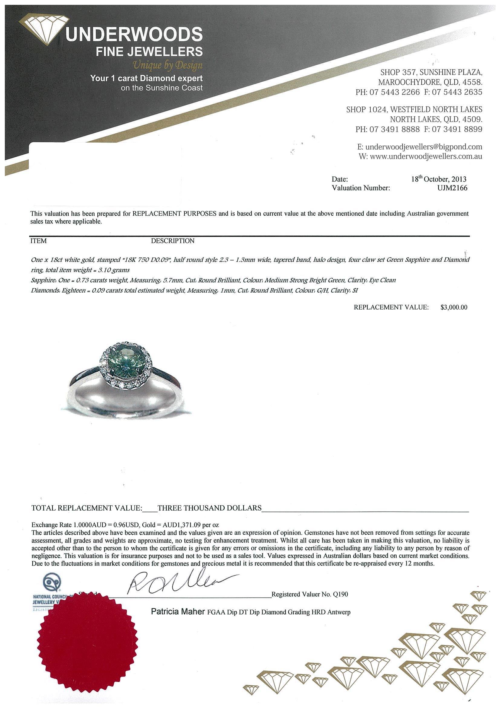 Sapphire and Diamond ring with a round green sapphire of 0.73ct and Diamonds totalling 0.09cts. 18ct white gold. Ring size H. With valuation dated 18/10/13. Weight: 2.9g (Pre-owned).