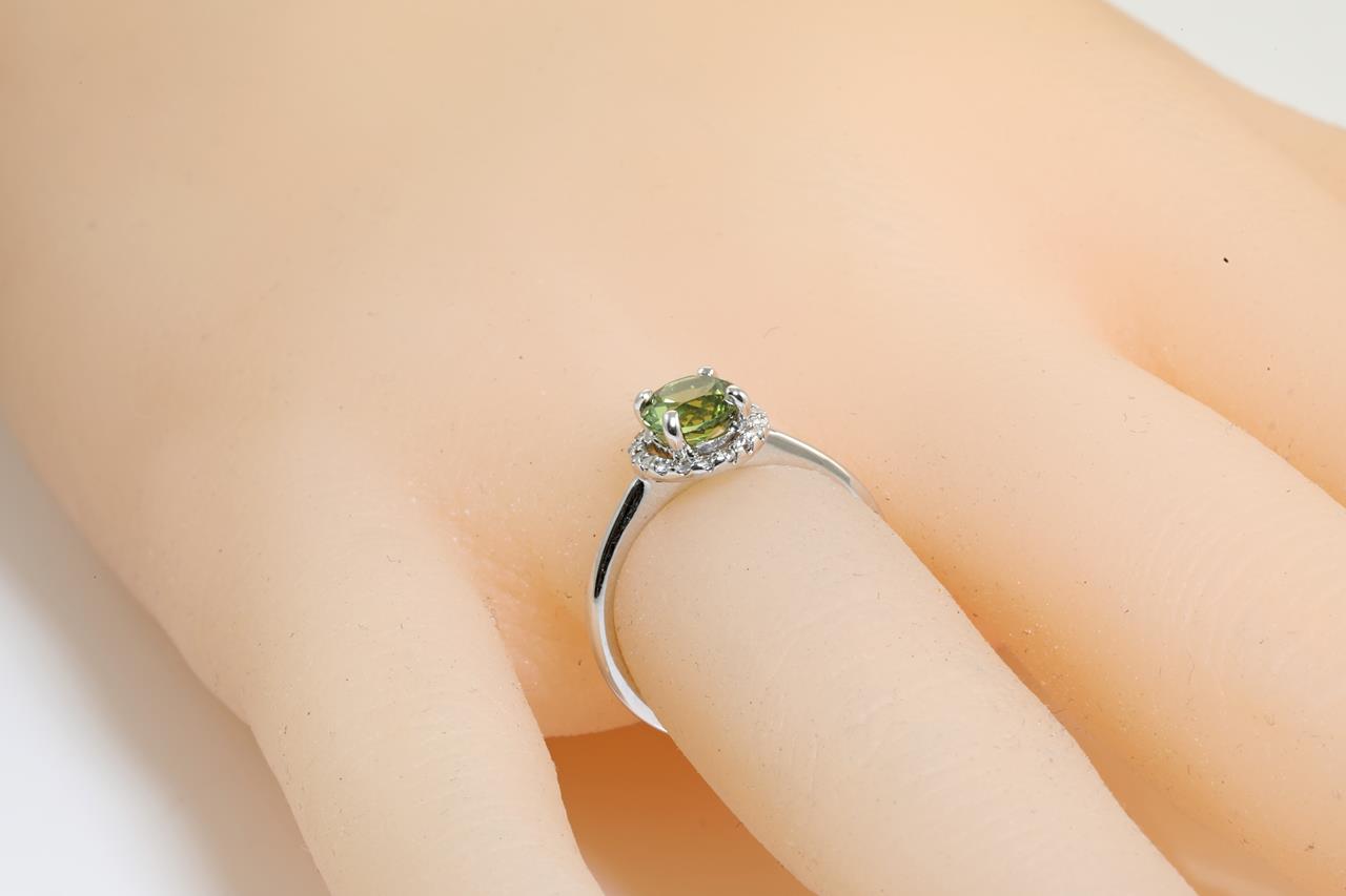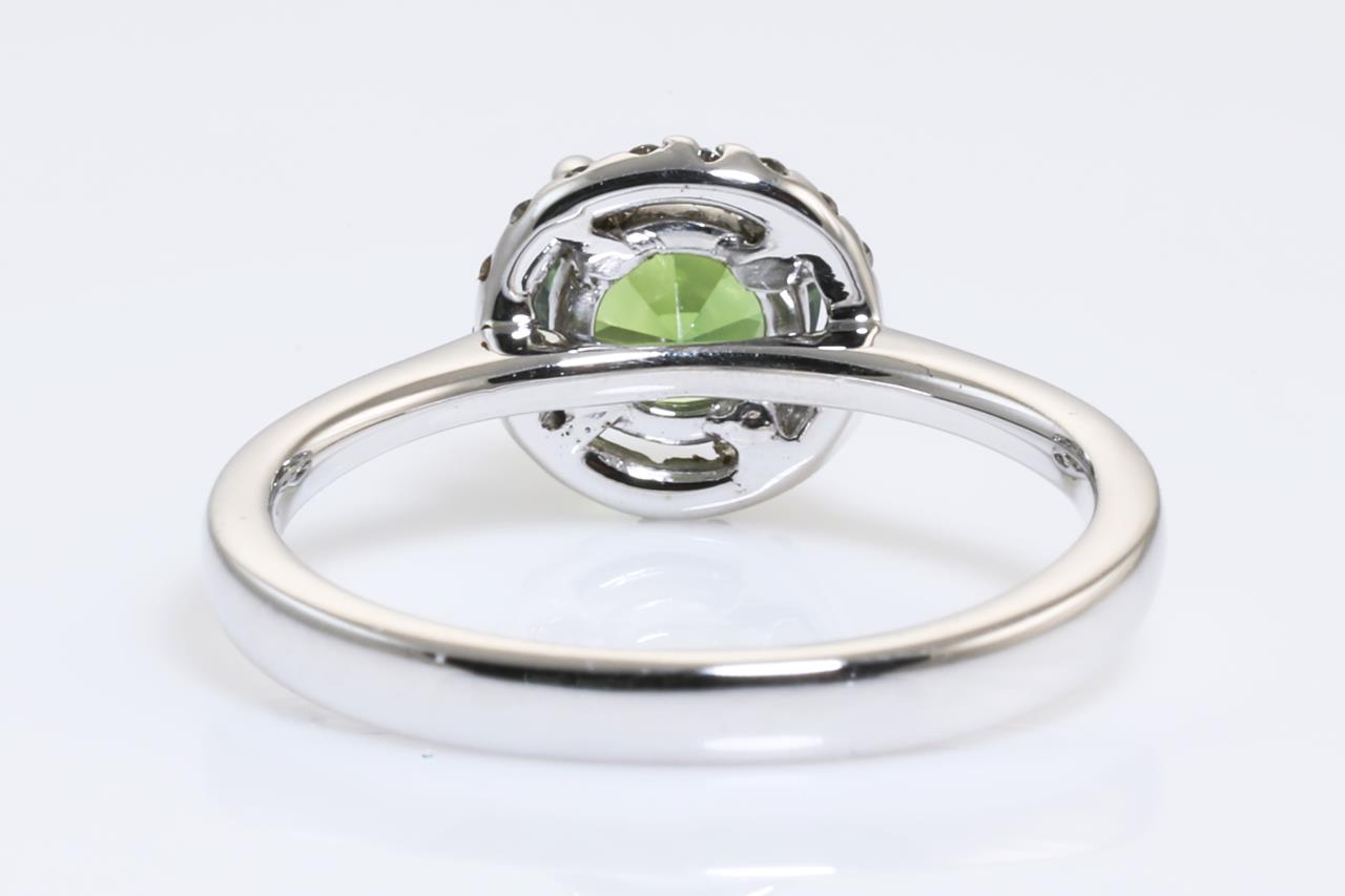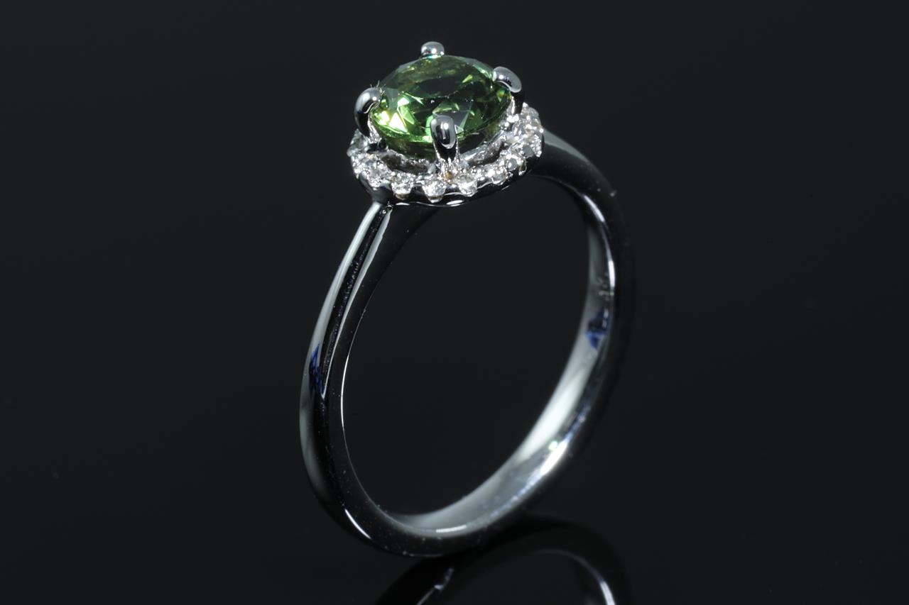 Sapphire and Diamond ring with a round green sapphire of 0.73ct and Diamonds totalling 0.09cts. 18ct white gold. Ring size H. With valuation dated 18/10/13. Weight: 2.9g (Pre-owned).