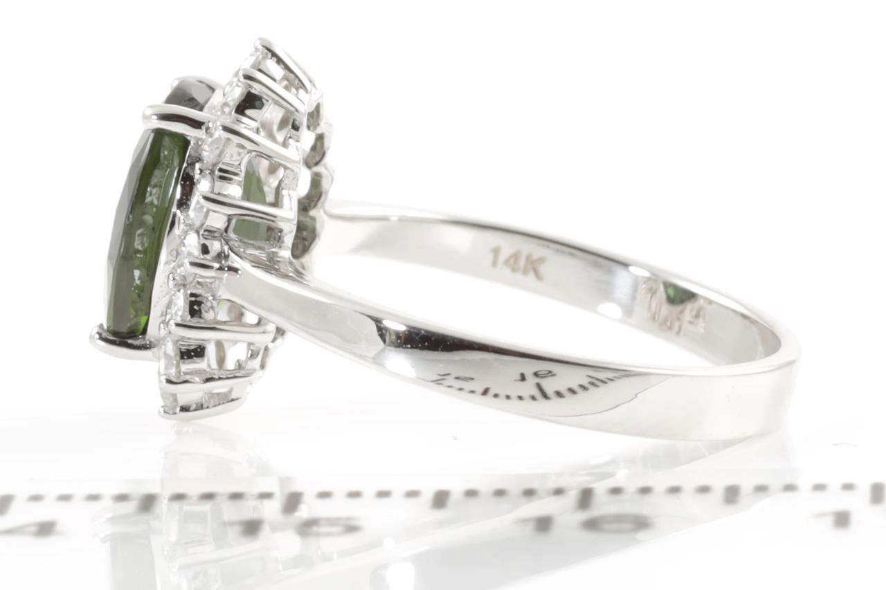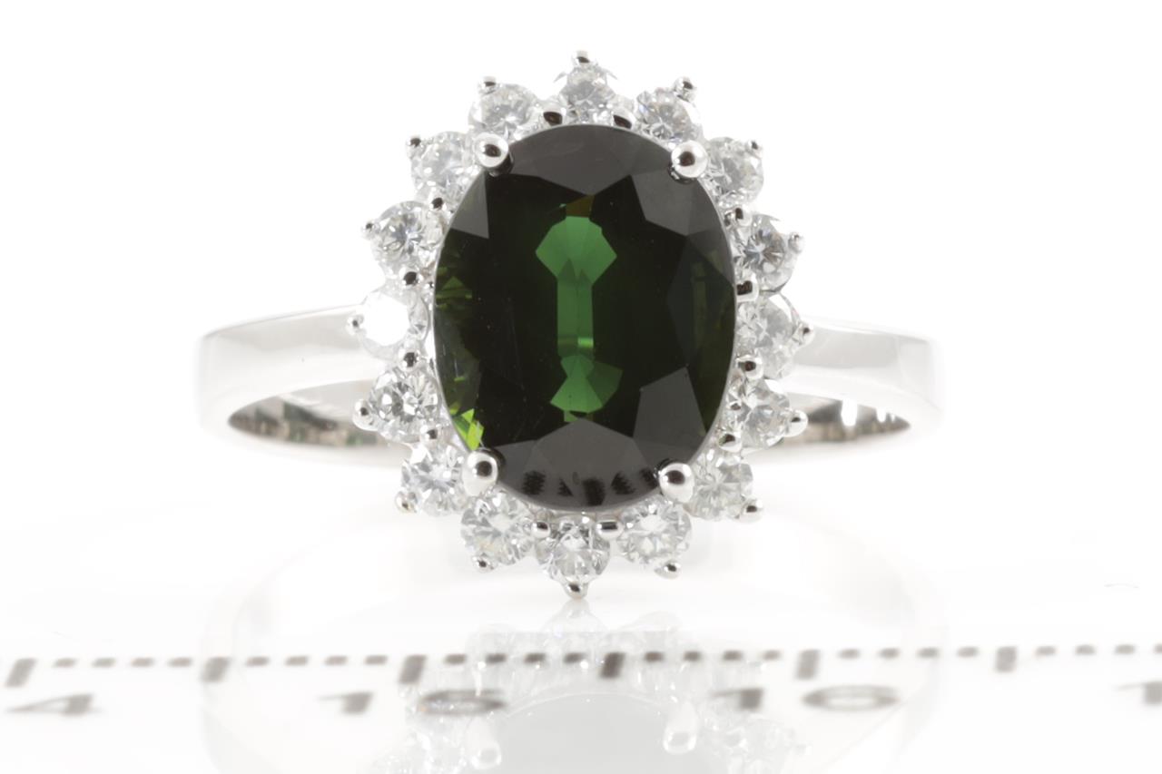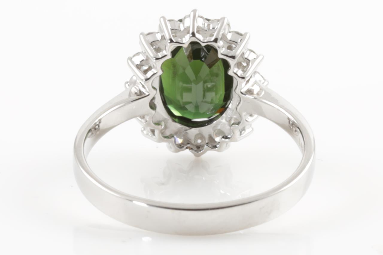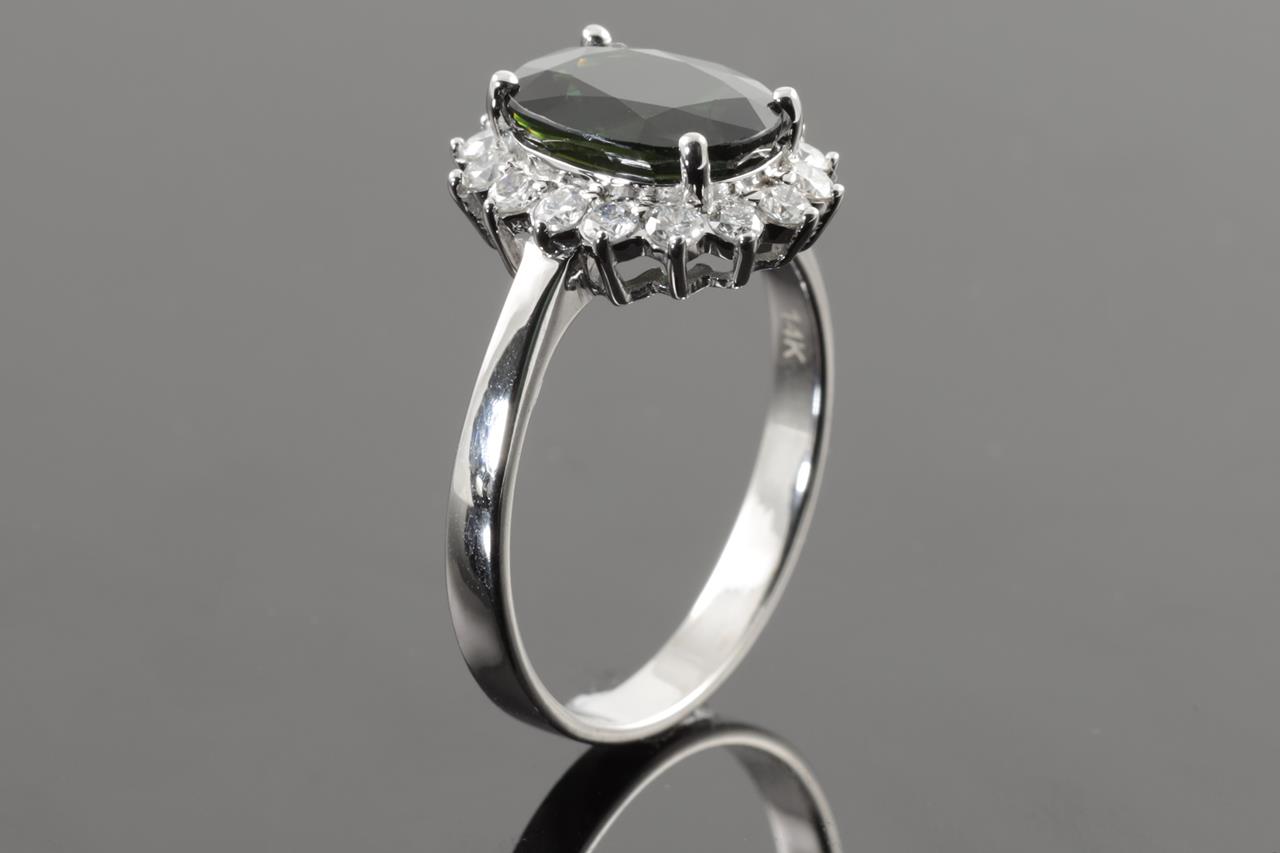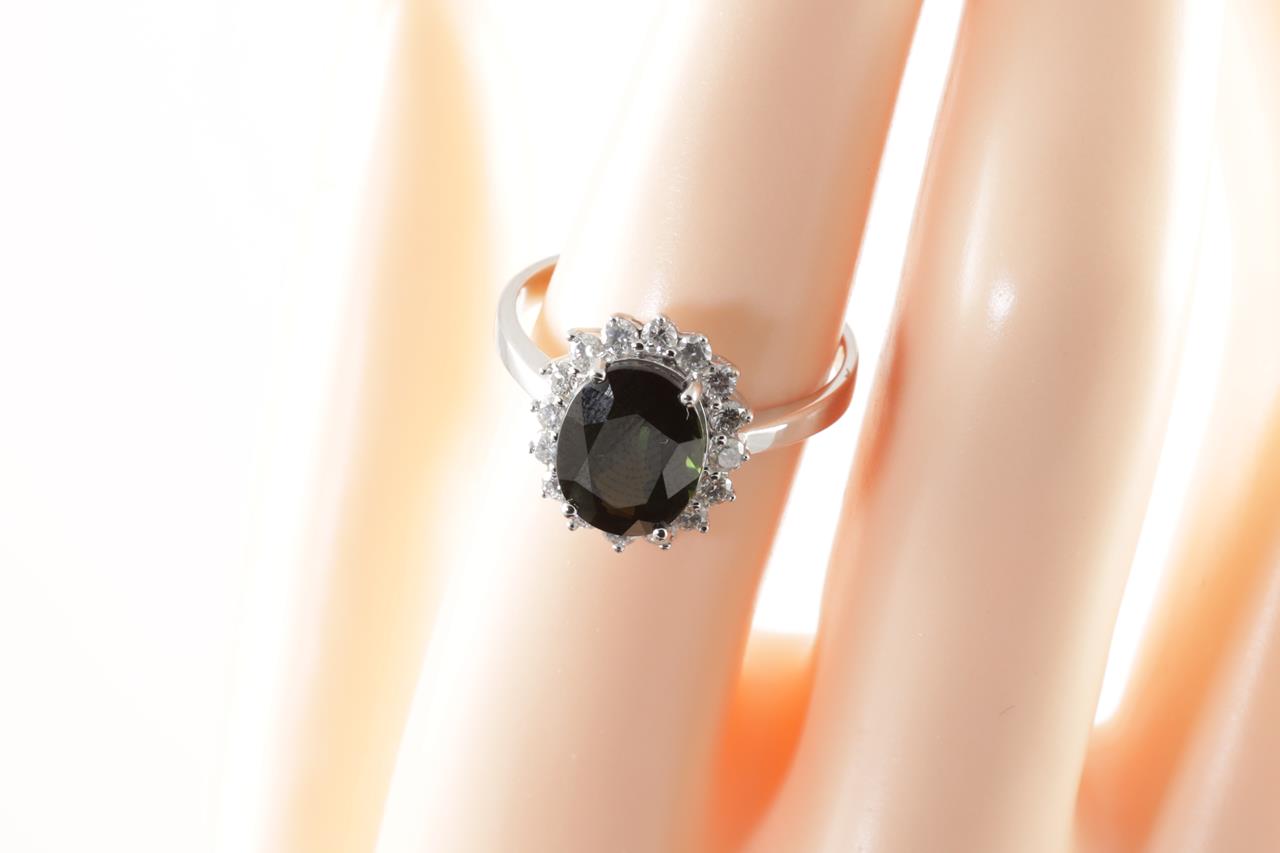 Sapphire and Diamond Ring with oval cut green Sapphire of approximately 3.55ct and round Diamond totalling 0.46cts (Estimated grading: H SI). 14ct white gold. Ring size P. Weight 3.7g. (Pre-owned)