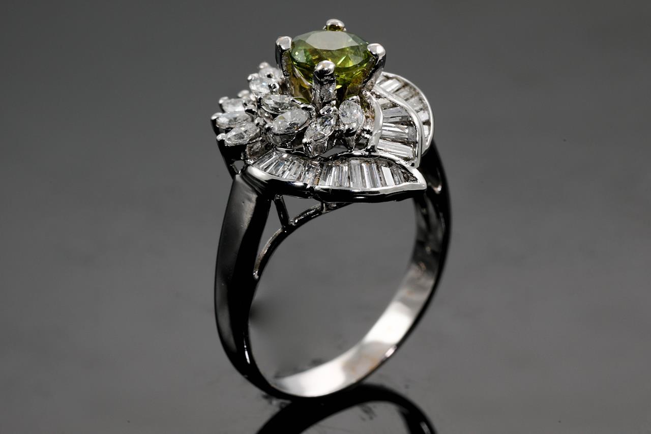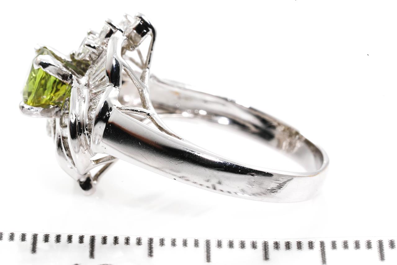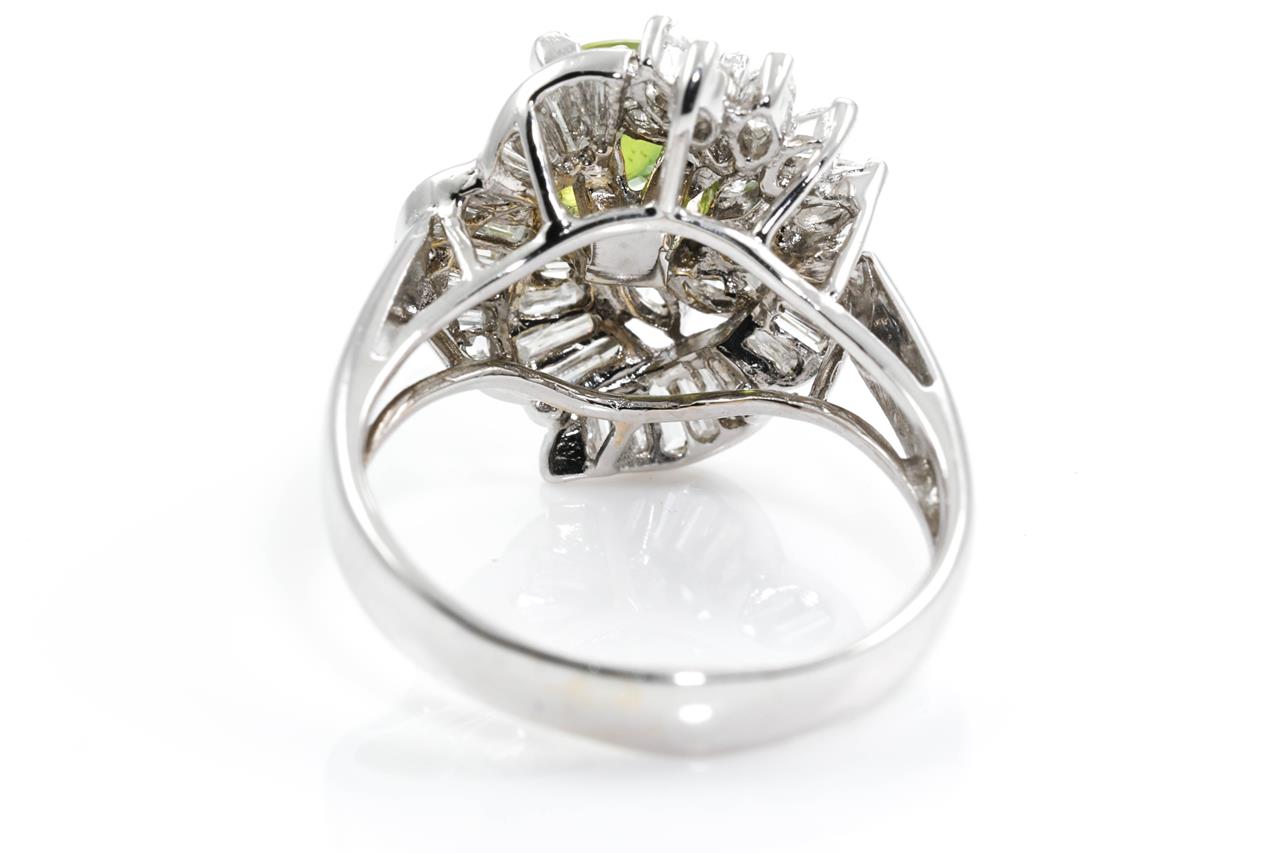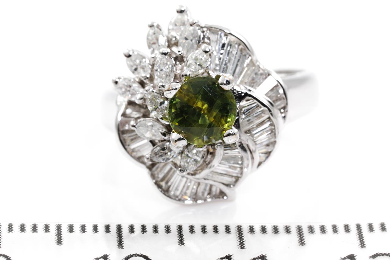 Sapphire and Diamond Ring with centre green round Sapphire of approximately 0.85cts with baguette and marquise cut Diamonds totalling approximately 1.00cts. (Estimate grading: G-H VS-P1). 18ct white gold. Ring size M. Weight 5.7g. (Pre-owned)