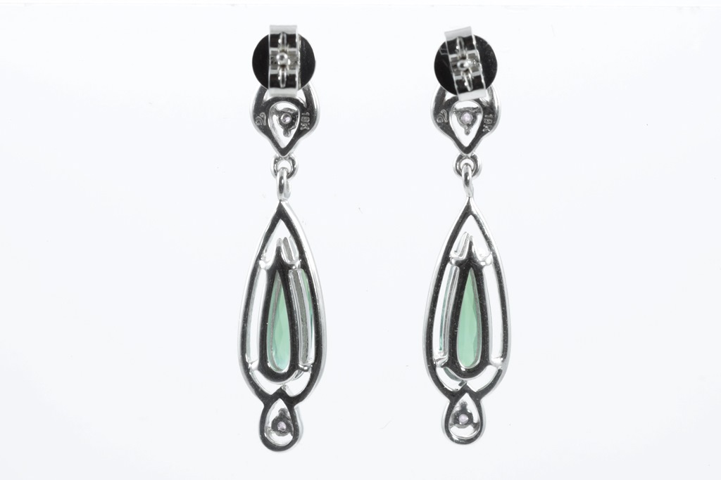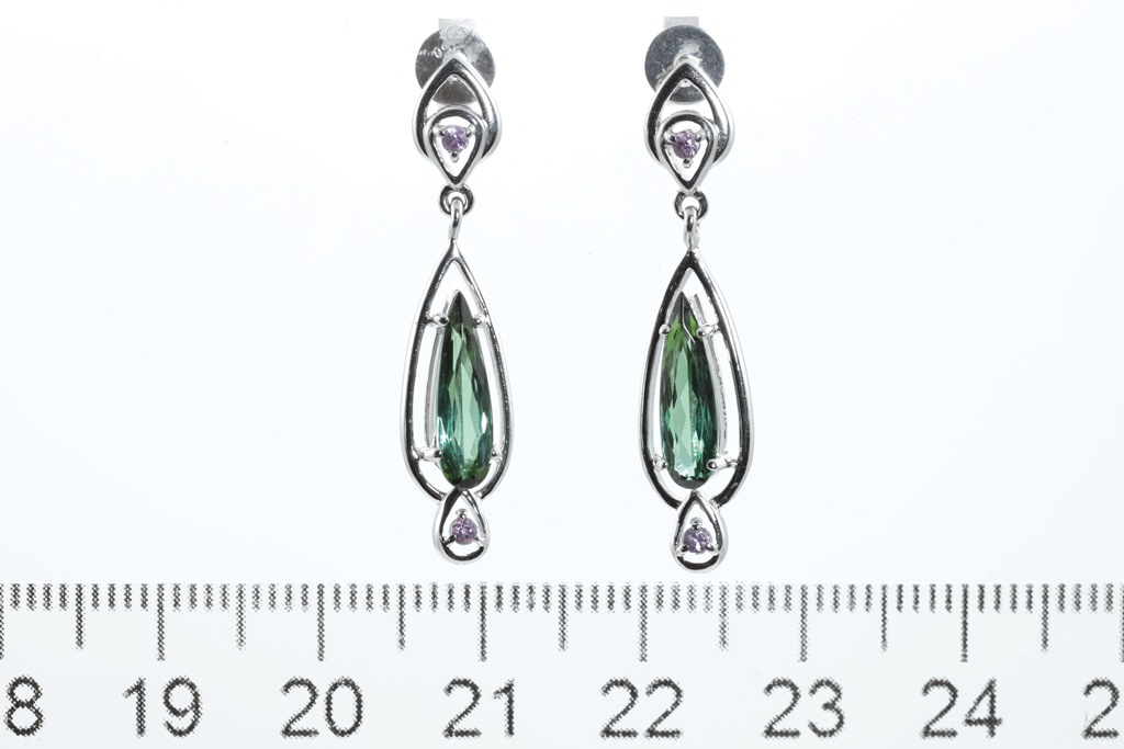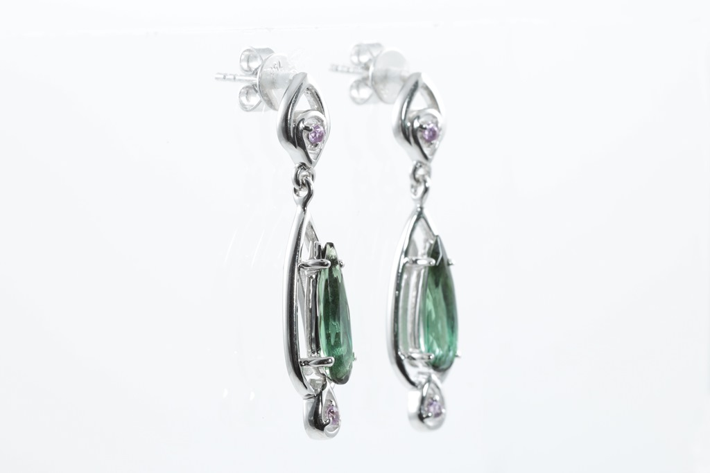 Tourmaline and Sapphire earrings with pear shape green Tourmaline totalling 1.10cts and round pink Sapphires totalling 0.12cts. 18ct white gold. Weight: 5.3g. (Pre-owned)