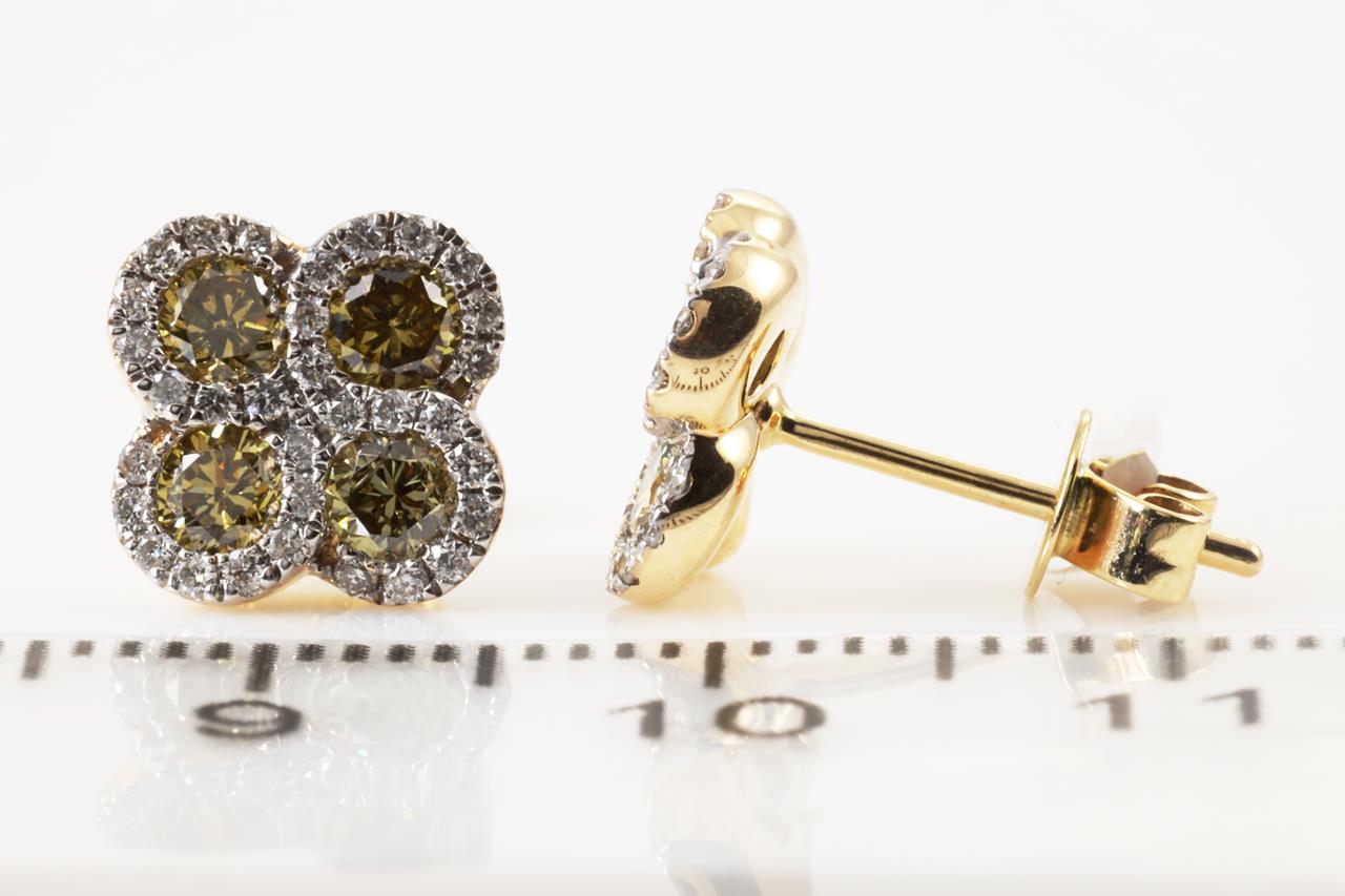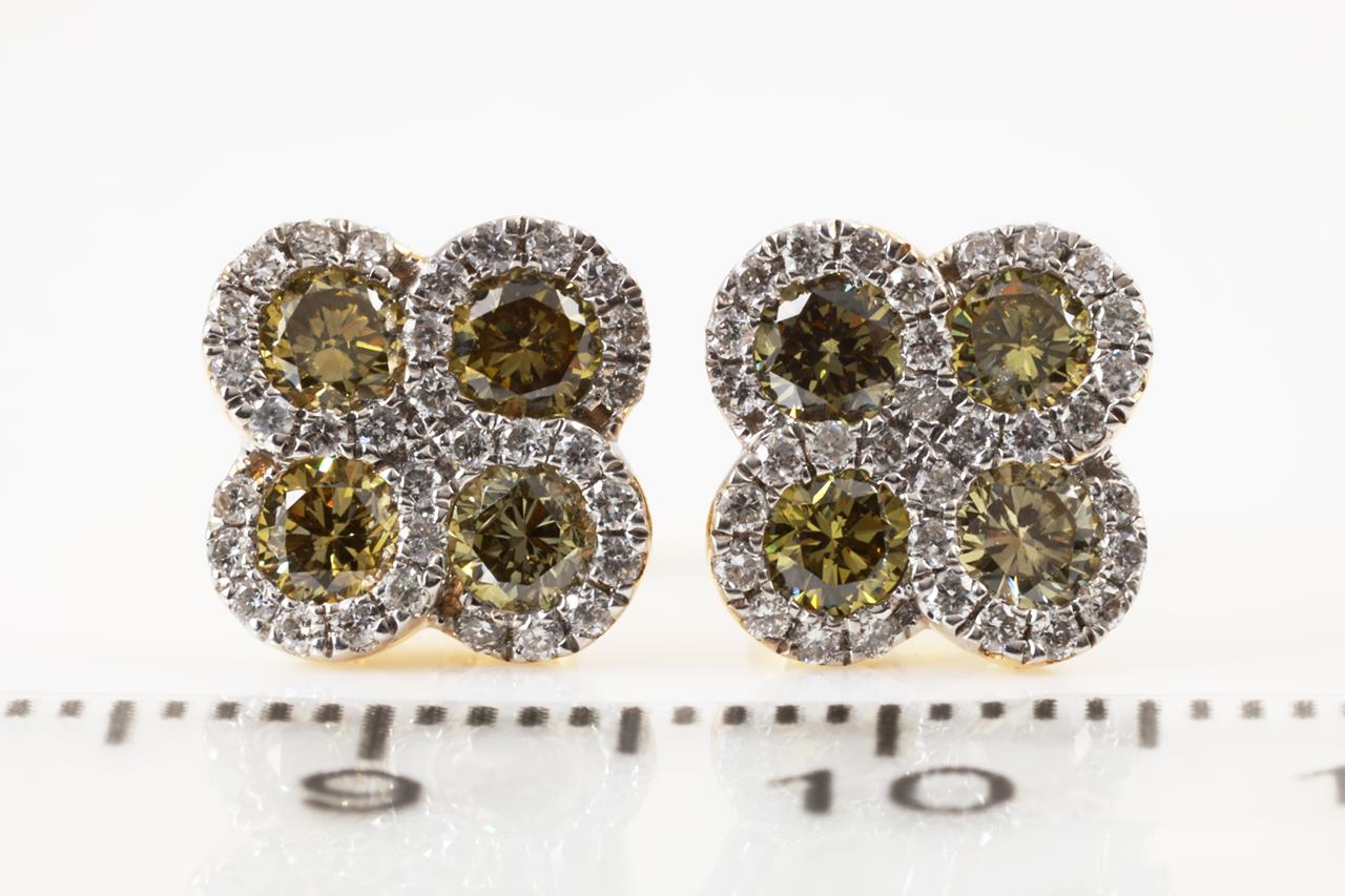 Diamond earrings with 8 round natural green Diamonds totalling 0.92cts (Estimated grading: VS-SI) and white Diamonds totalling 0.29cts (Estimated grading: H SI). 14ct yellow gold. Weight: 2.8g. (As new)