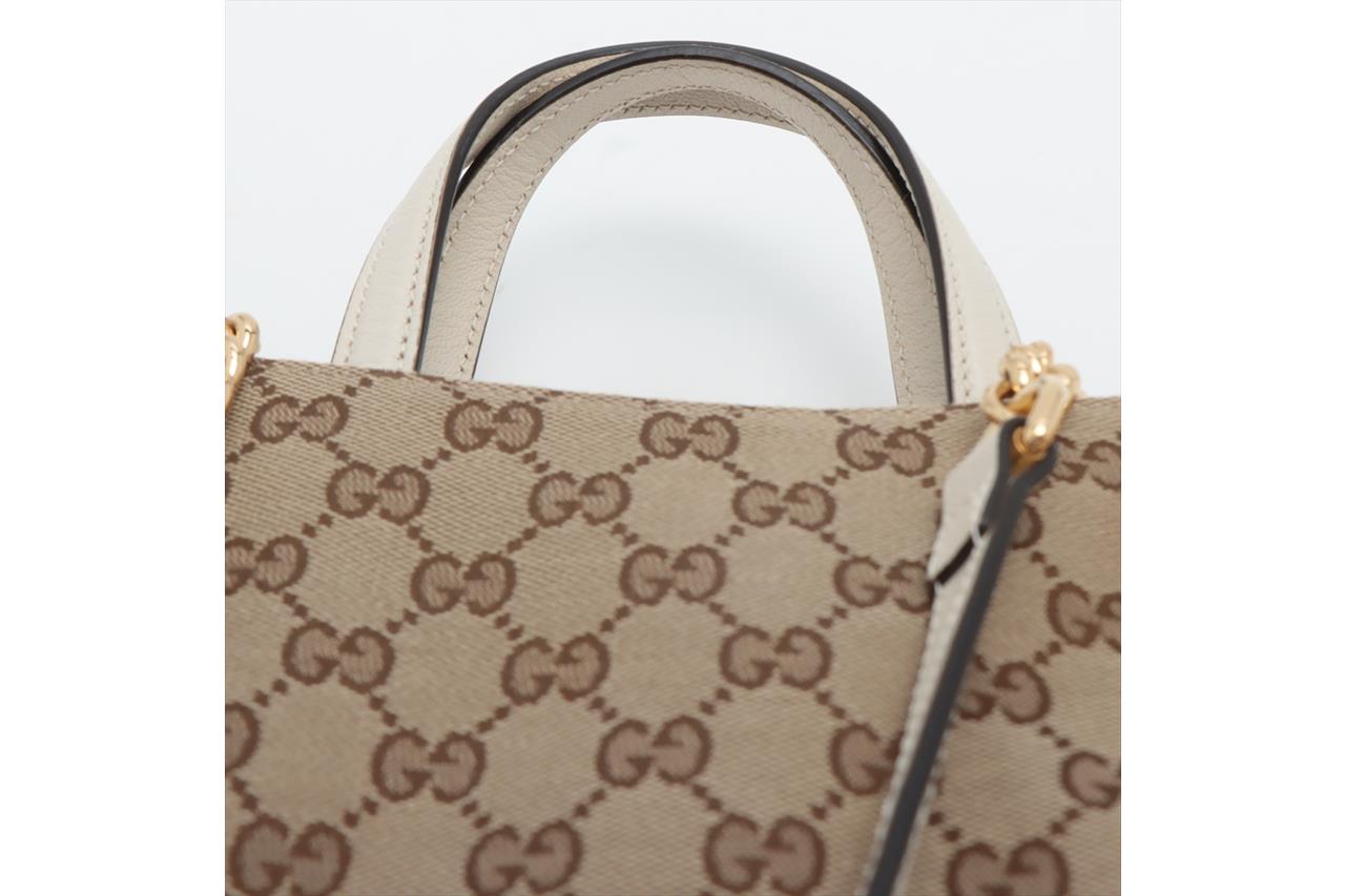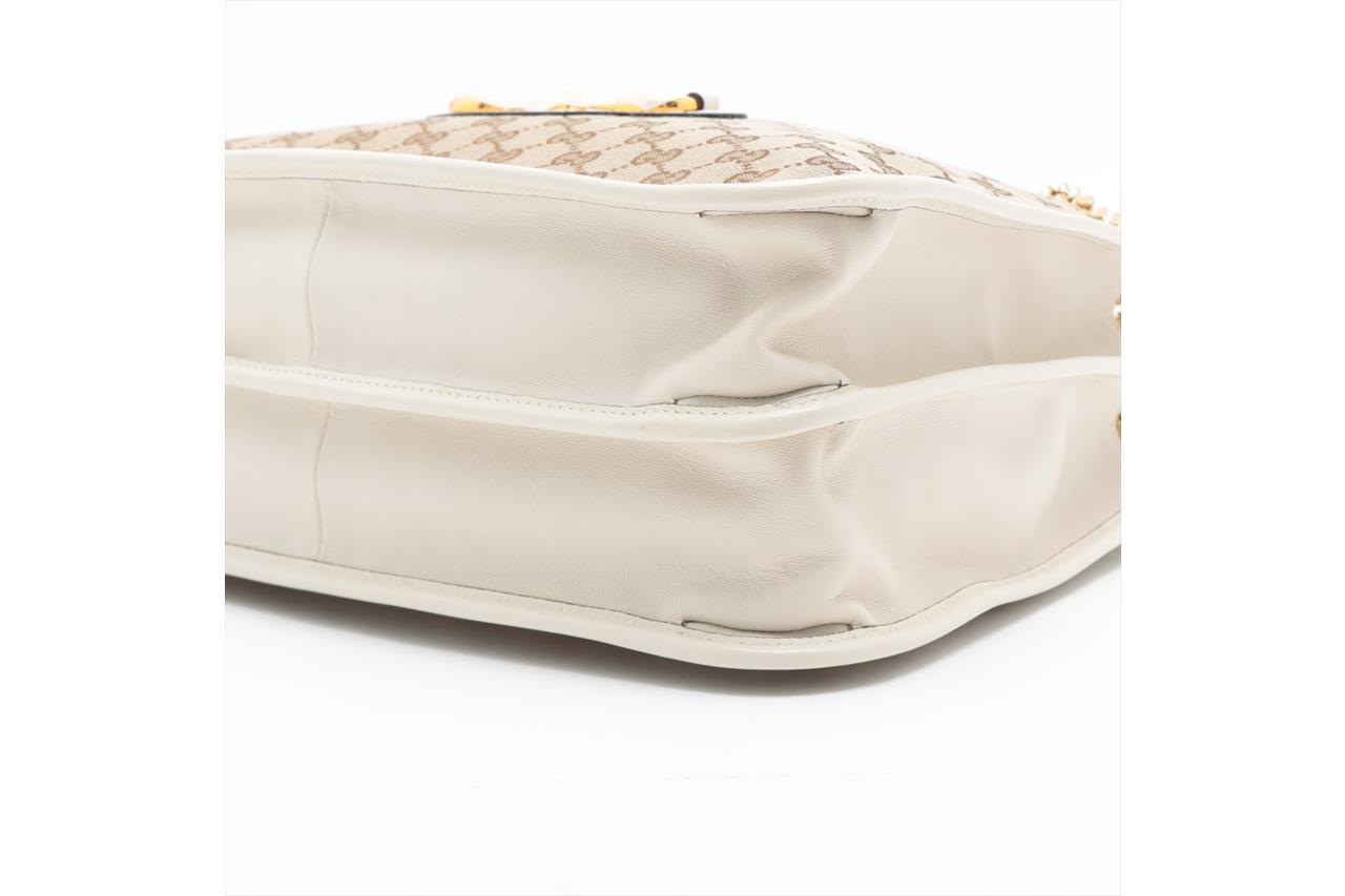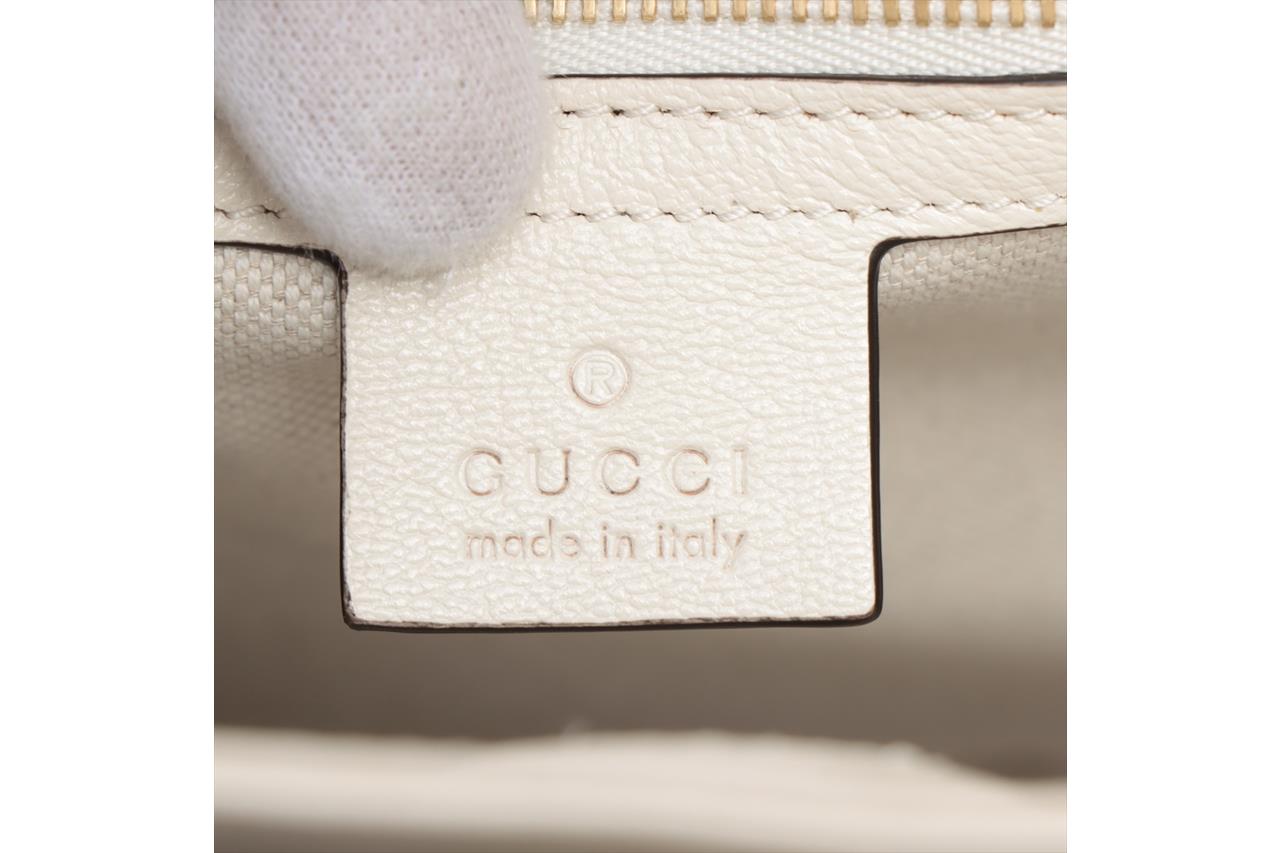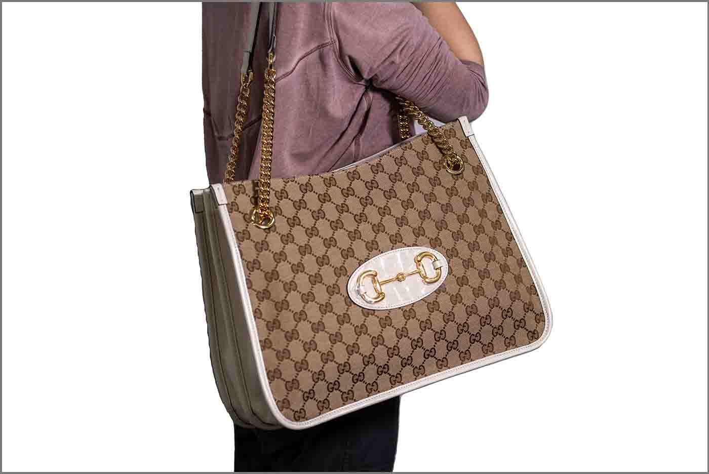 Gucci 1955 HorseBit medium tote bag in GG supreme print canvas and white leather. Featuring gold-toned hardware, horsebit detail at front, magnetic closures on top. White canvas lined interior with 2 compartments and internal slip pockets. Approximate dimensions: 35cm(L) x 27cm(H) x 12cm(D), 10cm handle drop, 28cm leather&chain link shoulder strap. Accompanied by Gucci dust bag, tags. With Entrupy Certificate of Authenticity. (Pre-owned)