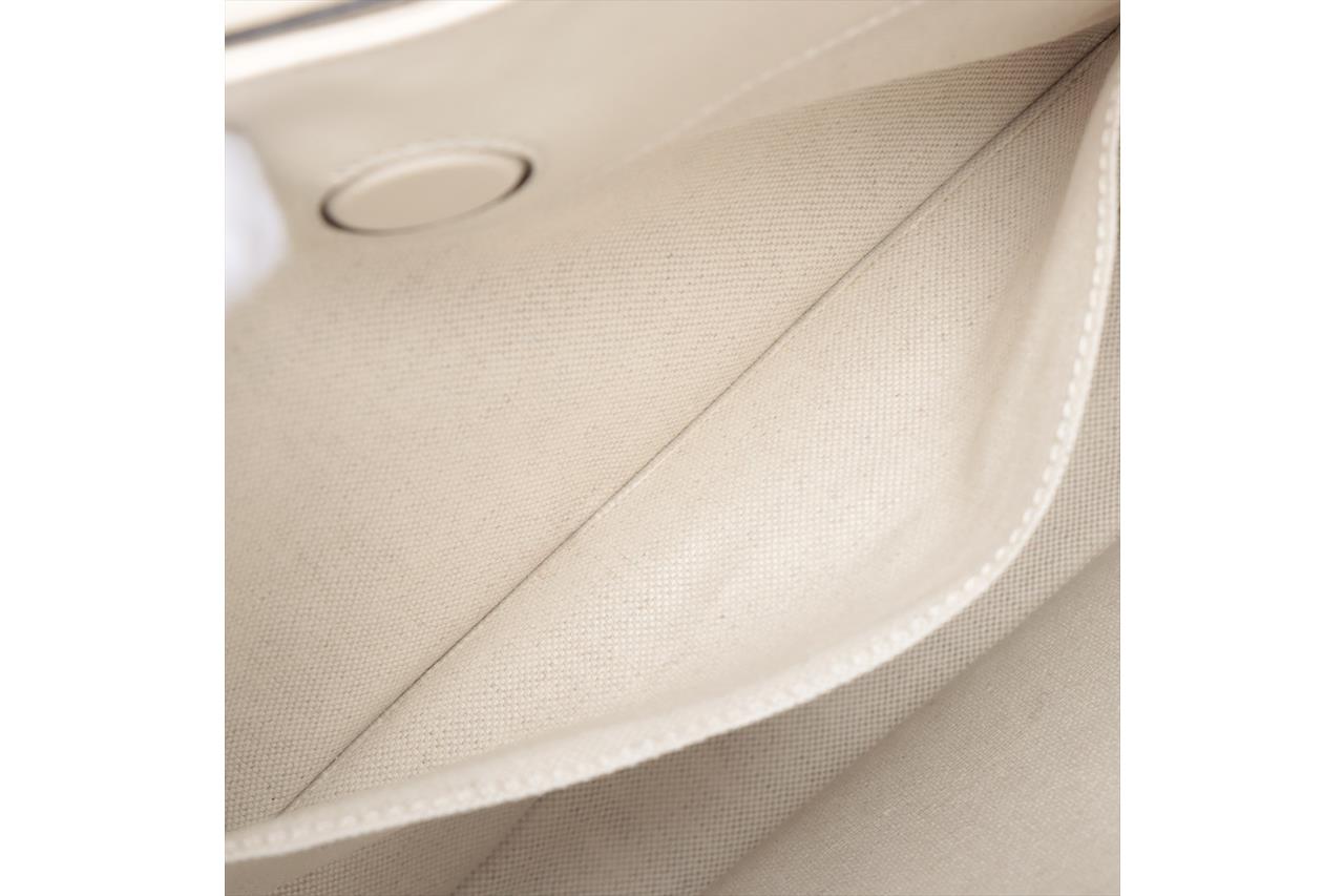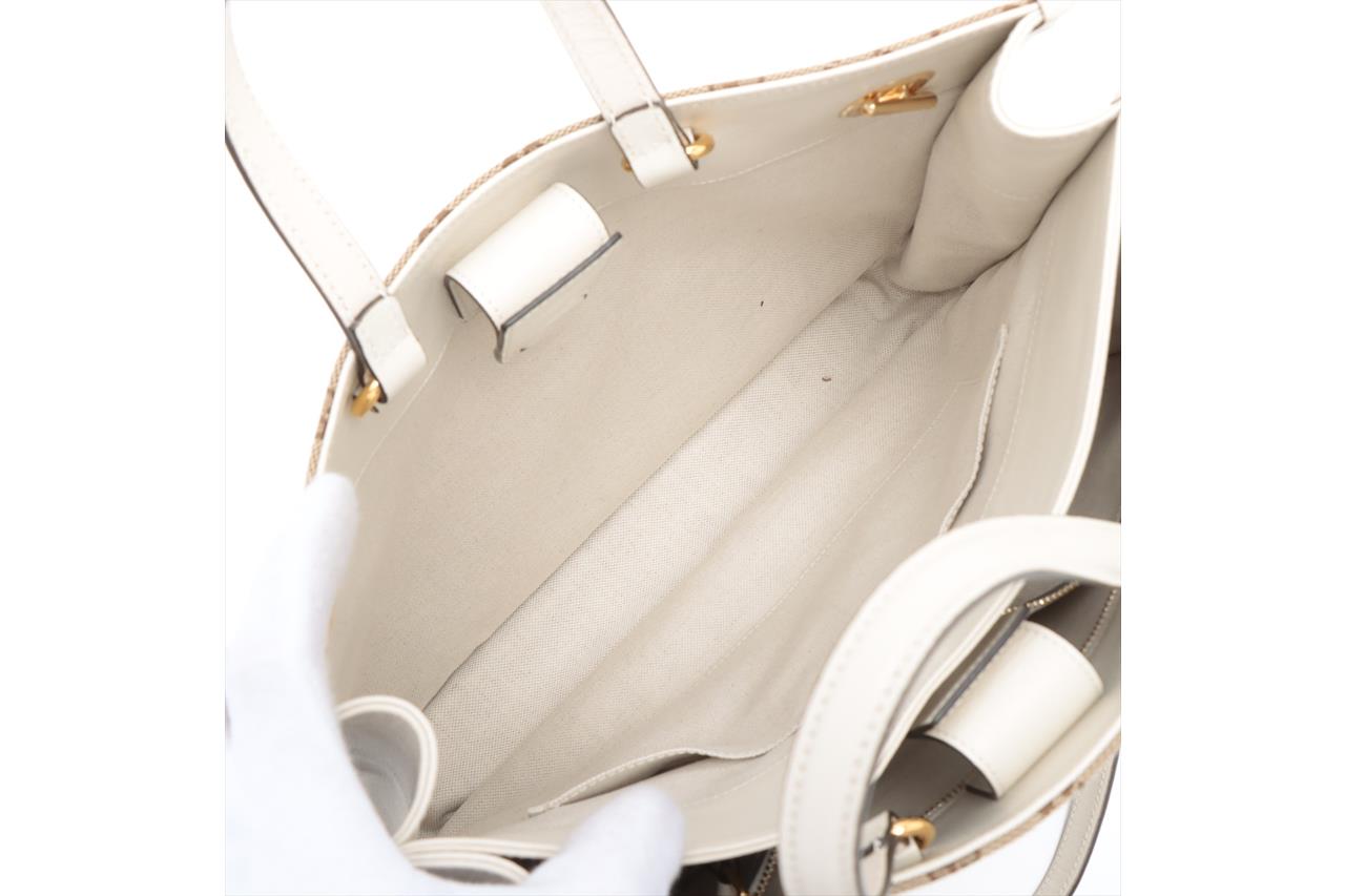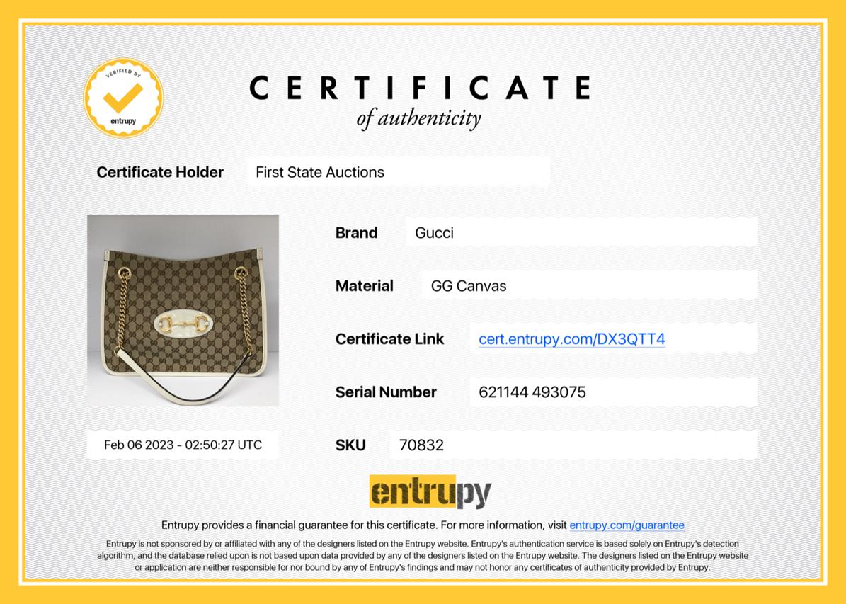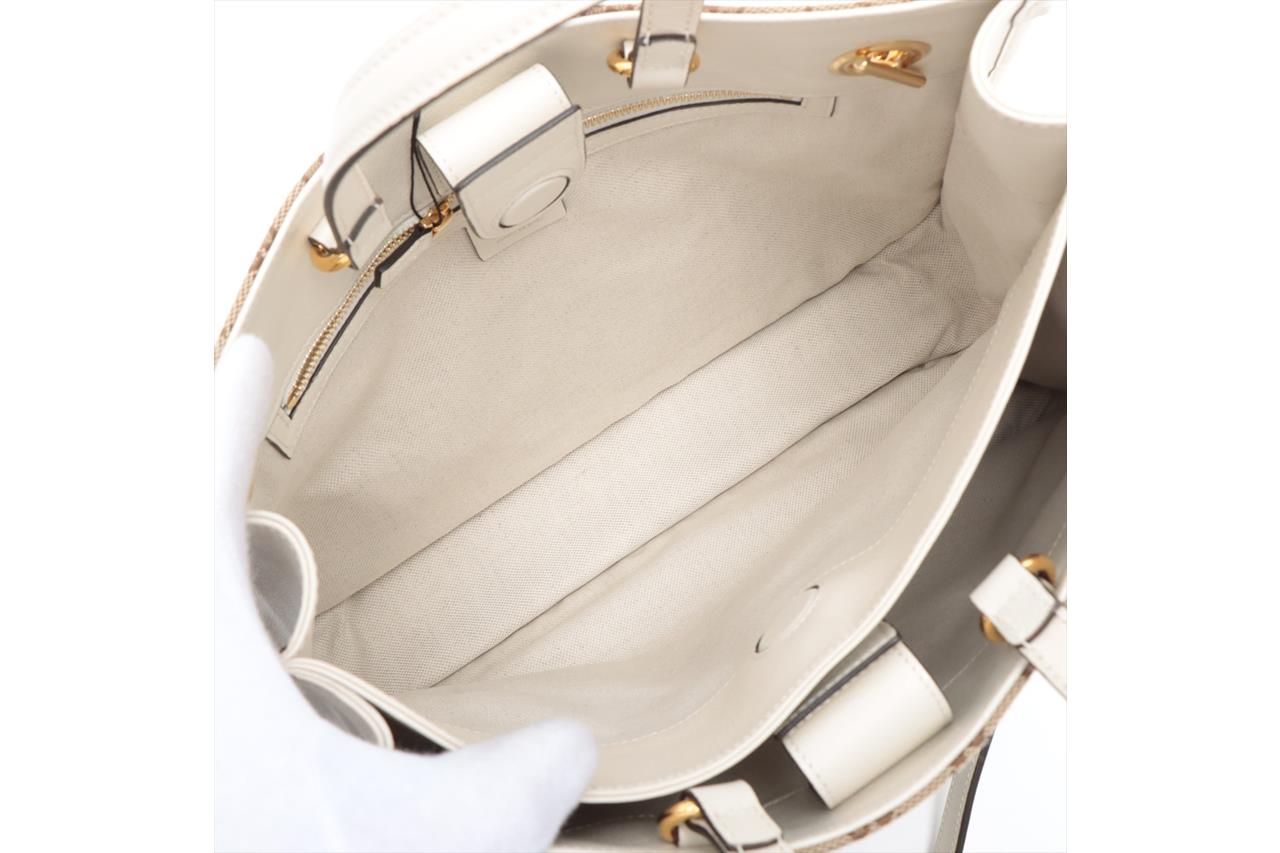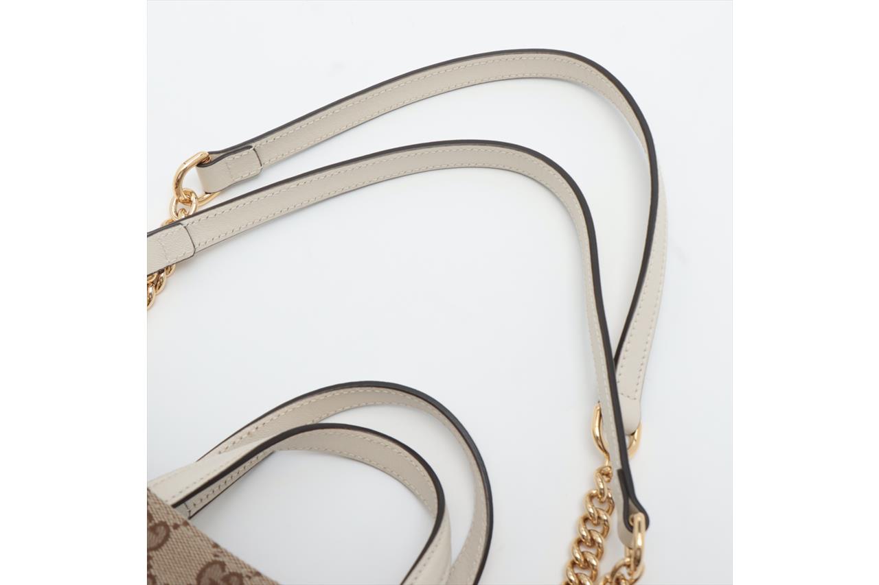 Gucci 1955 HorseBit medium tote bag in GG supreme print canvas and white leather. Featuring gold-toned hardware, horsebit detail at front, magnetic closures on top. White canvas lined interior with 2 compartments and internal slip pockets. Approximate dimensions: 35cm(L) x 27cm(H) x 12cm(D), 10cm handle drop, 28cm leather&chain link shoulder strap. Accompanied by Gucci dust bag, tags. With Entrupy Certificate of Authenticity. (Pre-owned)