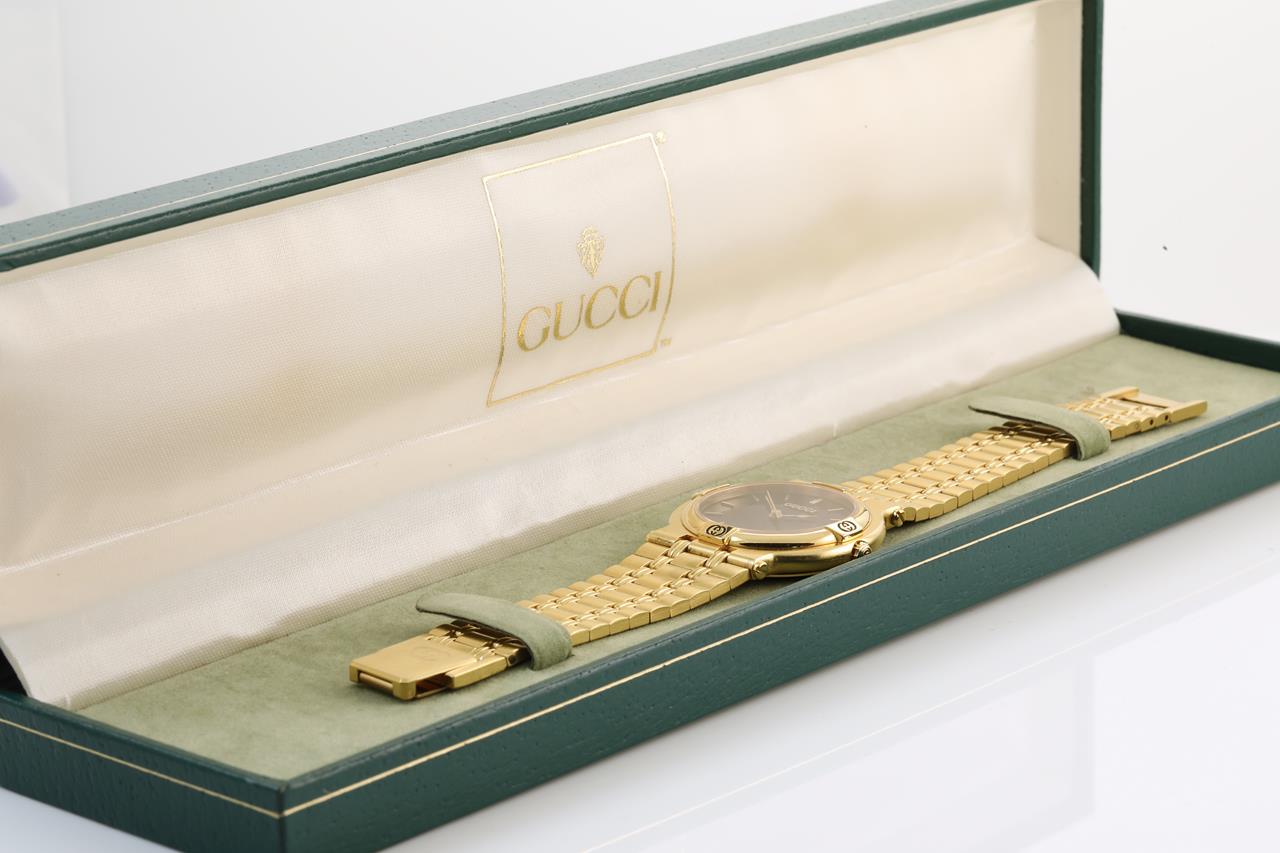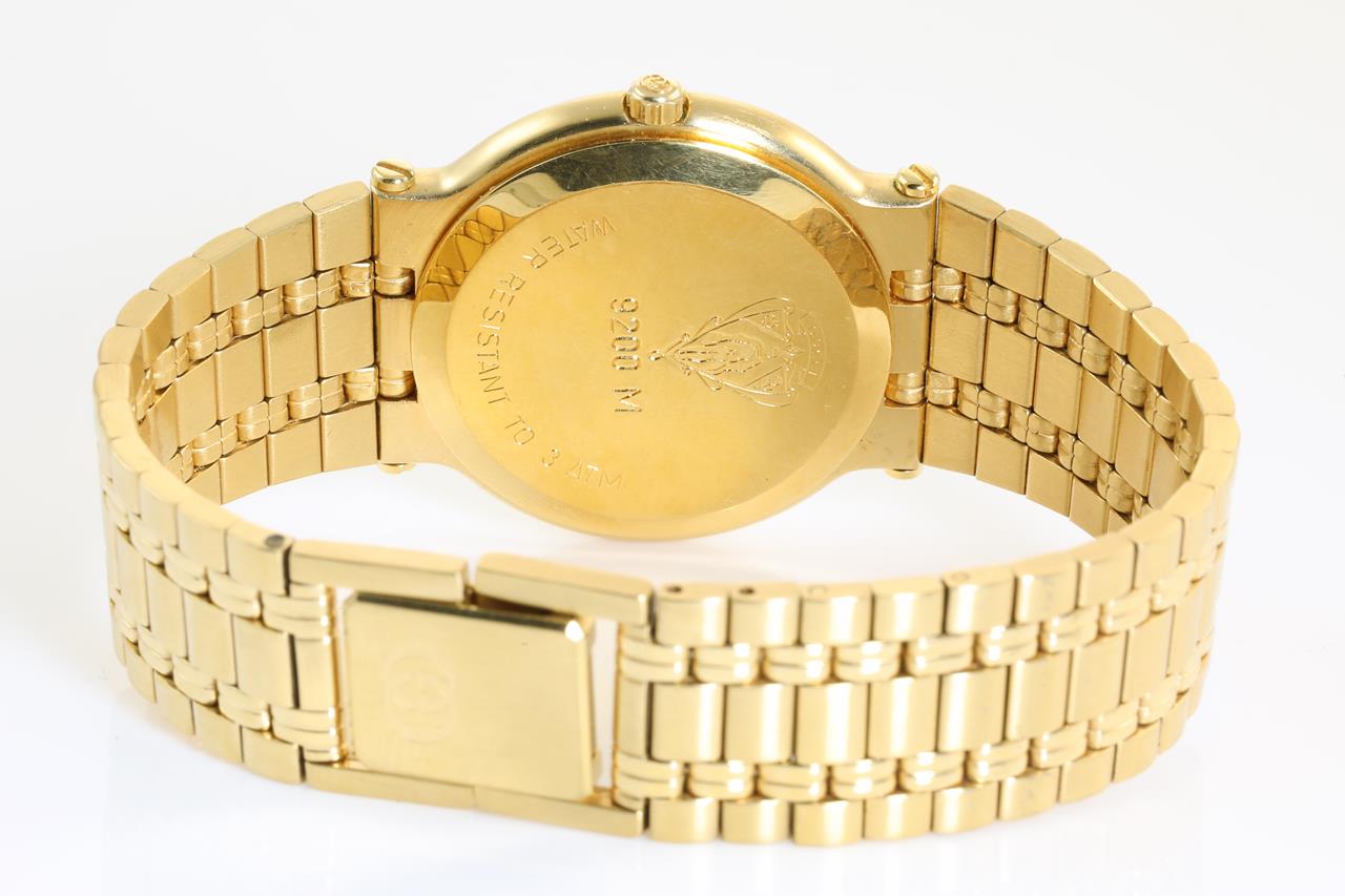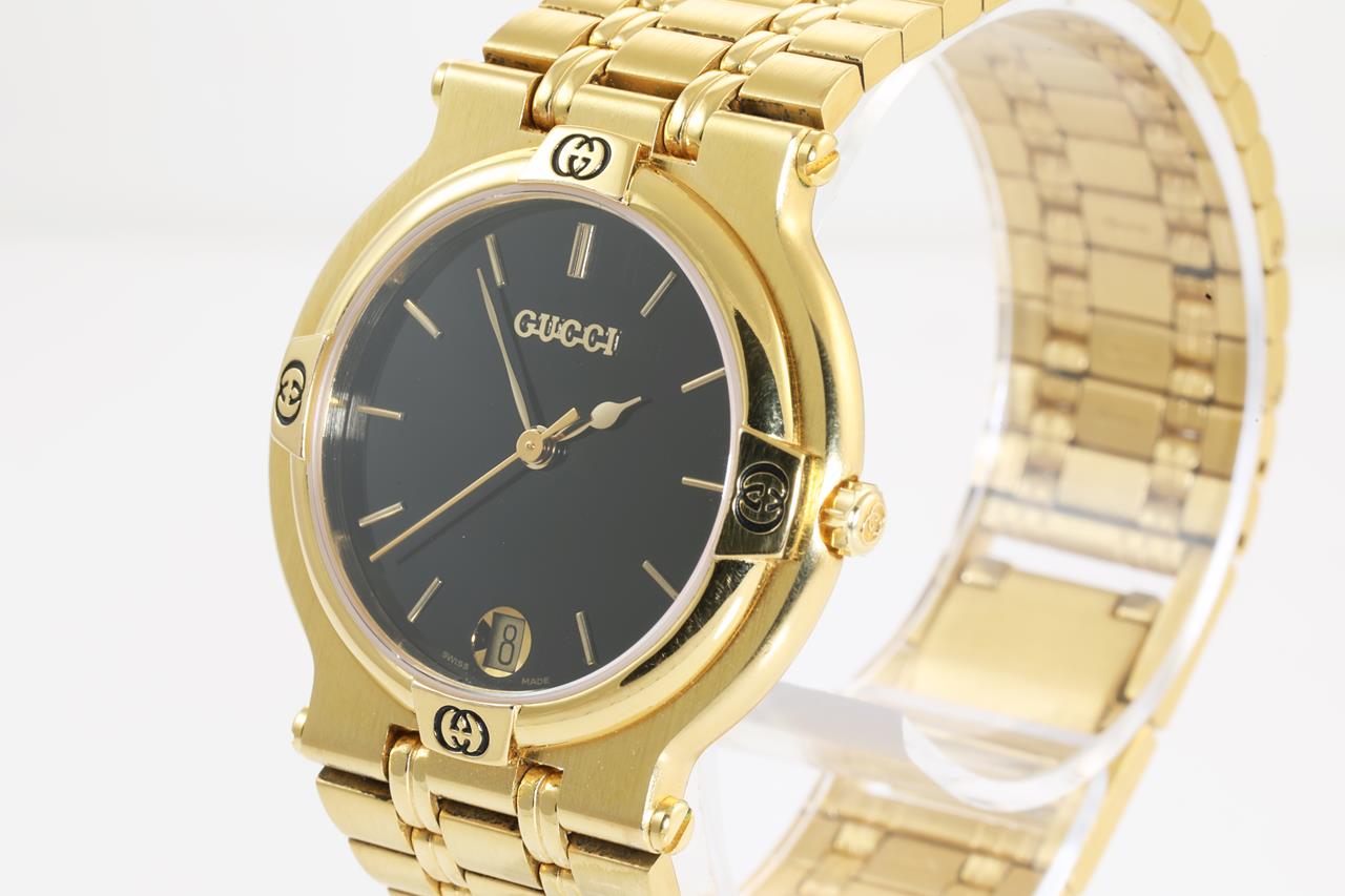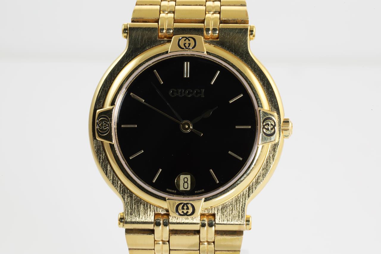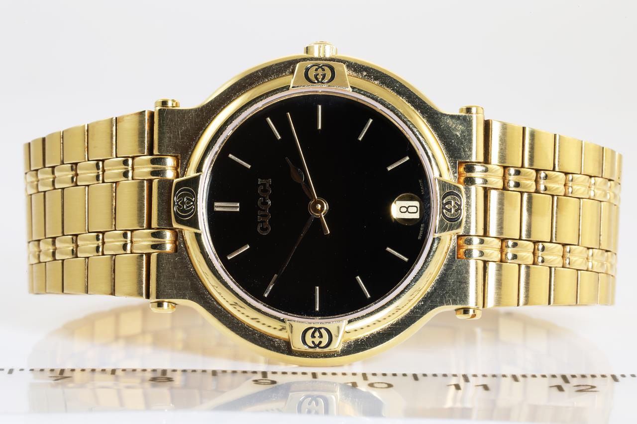 Gucci gold plated stainless steel quartz ladies watch. Black dial, date, case diameter: 32mm, wrist size: 15cm, Swiss made. Ref #9200M. With Gucci gold plated stainless steel bracelet and clasp. With Gucci box. 3 month FSA warranty. (Pre-owned)