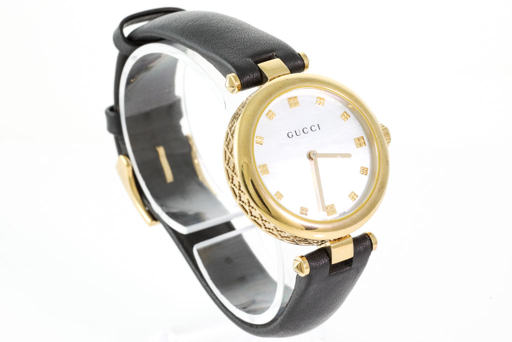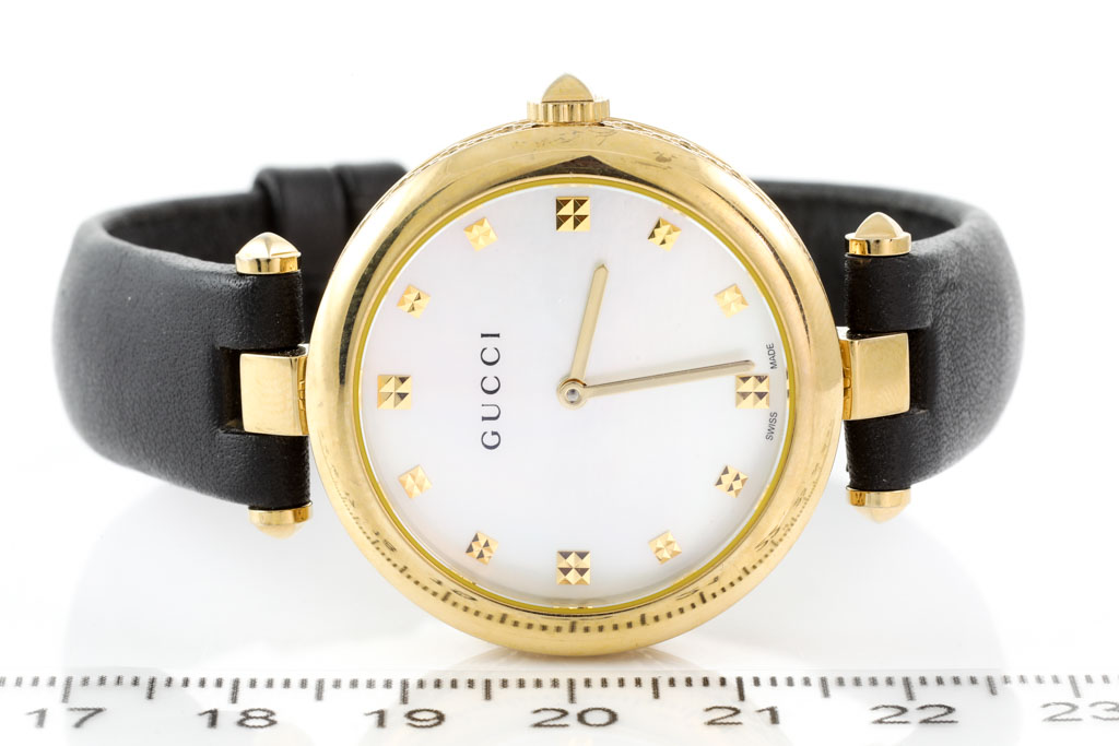 Gucci Diamantissima yellow gold PVD stainless steel quartz ladies watch. Mother of Pearl dial, case diameter: 32mm, strap length: 19cm, Swiss made. Ref# YA141404. With Gucci black leather strap and buckle. 3 month FSA warranty. No box provided. (As new, NOTE: minor scratches on case and wear on strap due to being display stock)
