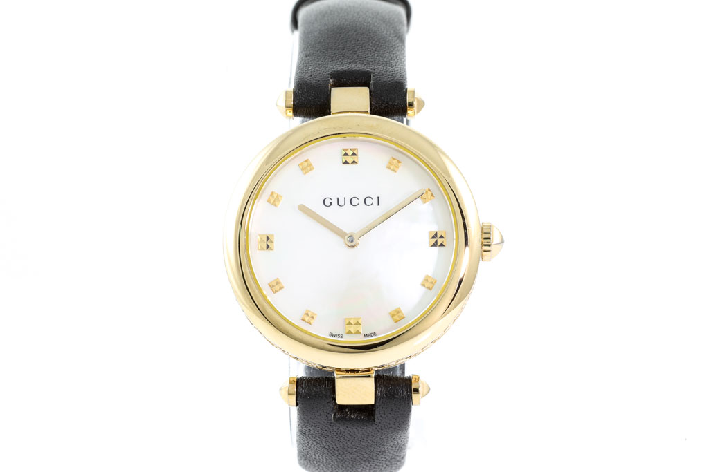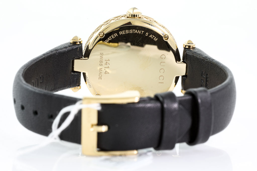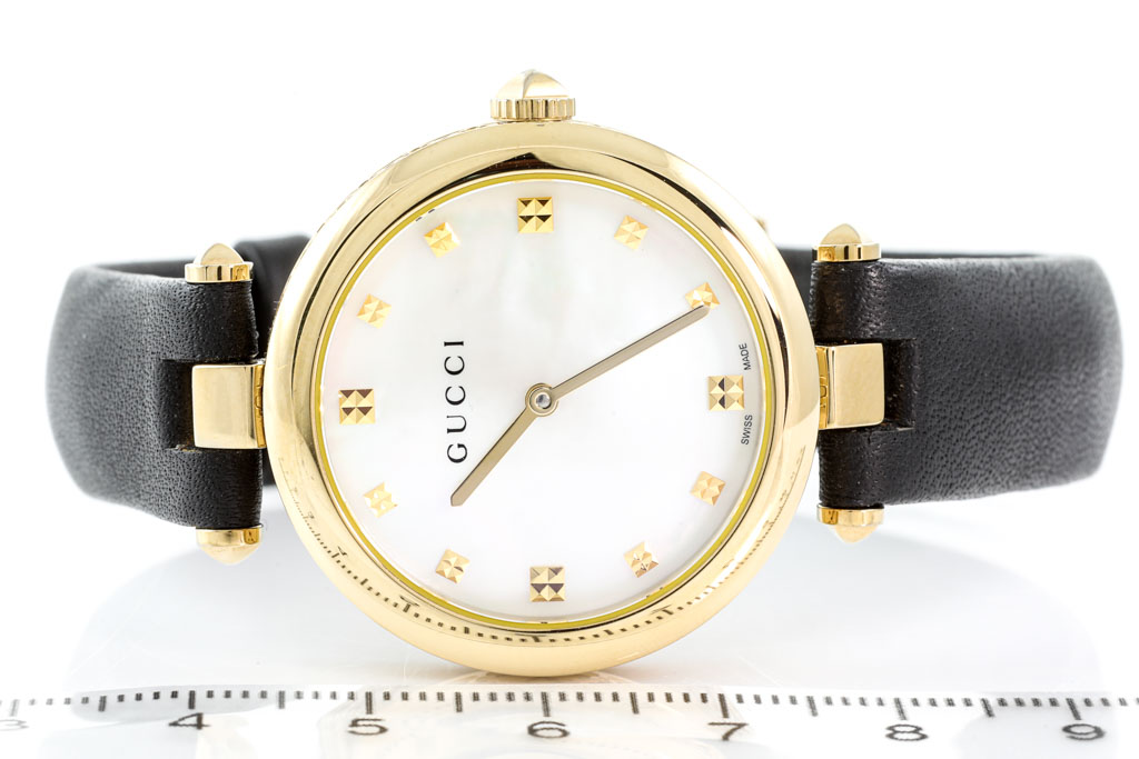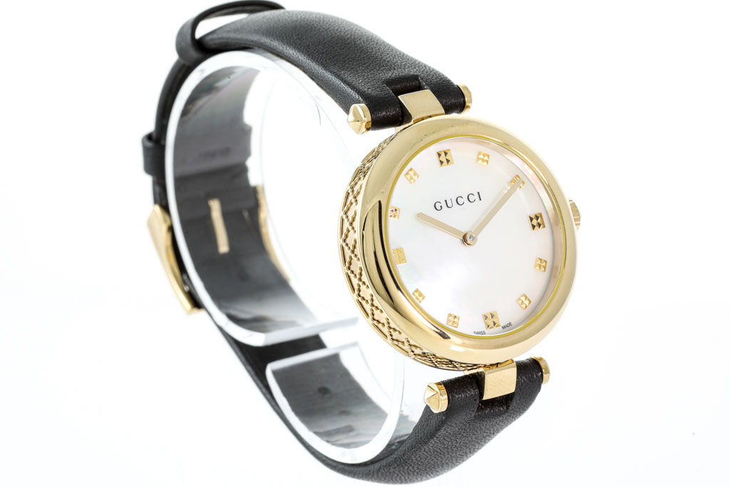 Gucci Diamantissima yellow gold PVD stainless steel quartz ladies watch. Mother of Pearl dial, case diameter: 32mm, strap length: 19cm, Swiss made. Ref# YA141404. With Gucci black leather strap and buckle. 3 month FSA warranty. No box provided. (As new, NOTE: minor scratches on case and wear on strap due to being display stock)