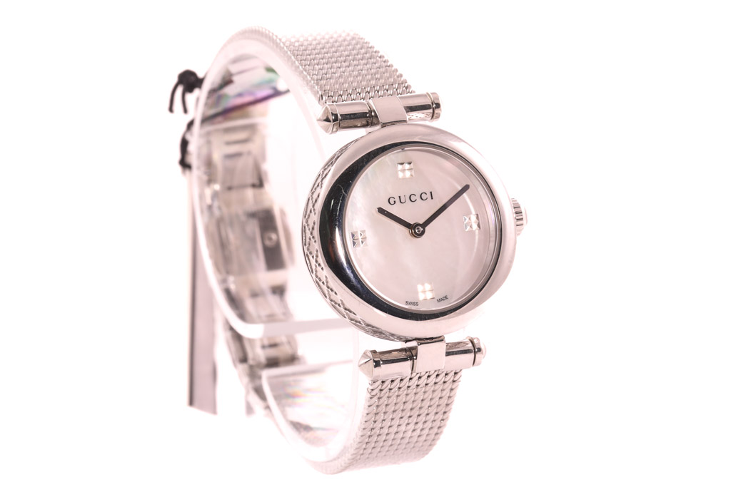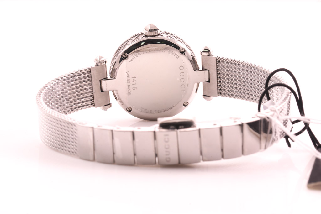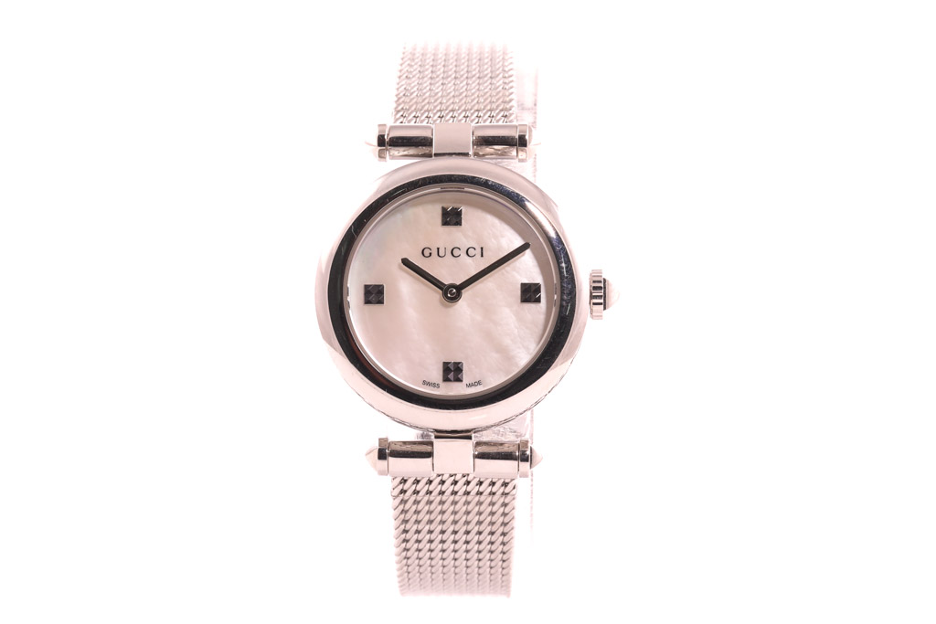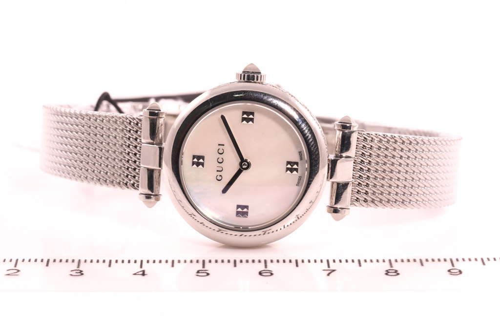 Gucci Diamantissima stainless steel quartz ladies watch. Mother of Pearl dial, case diameter: 27mm, wrist size: 17.5cm, Swiss made. Ref# YA141504. With Gucci stainless steel bracelet and clasp. 3 month FSA warranty. No box provided (As new, Note: minor scratches on case due to being display stock and bracelet in original wrapping)