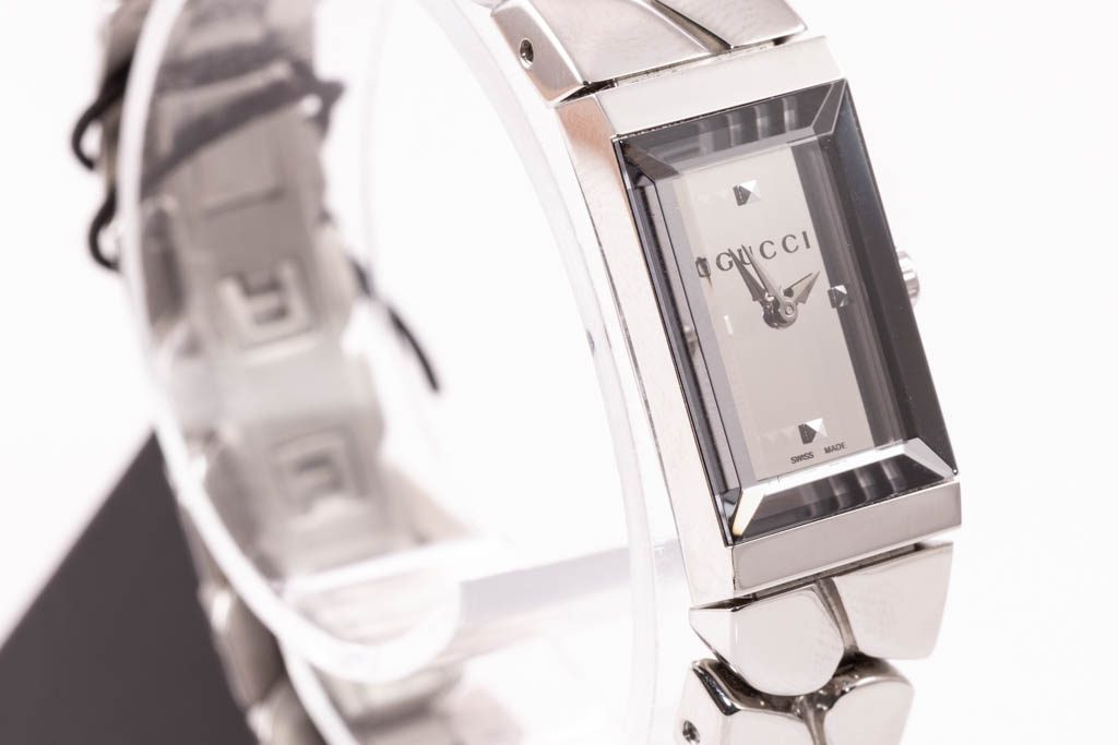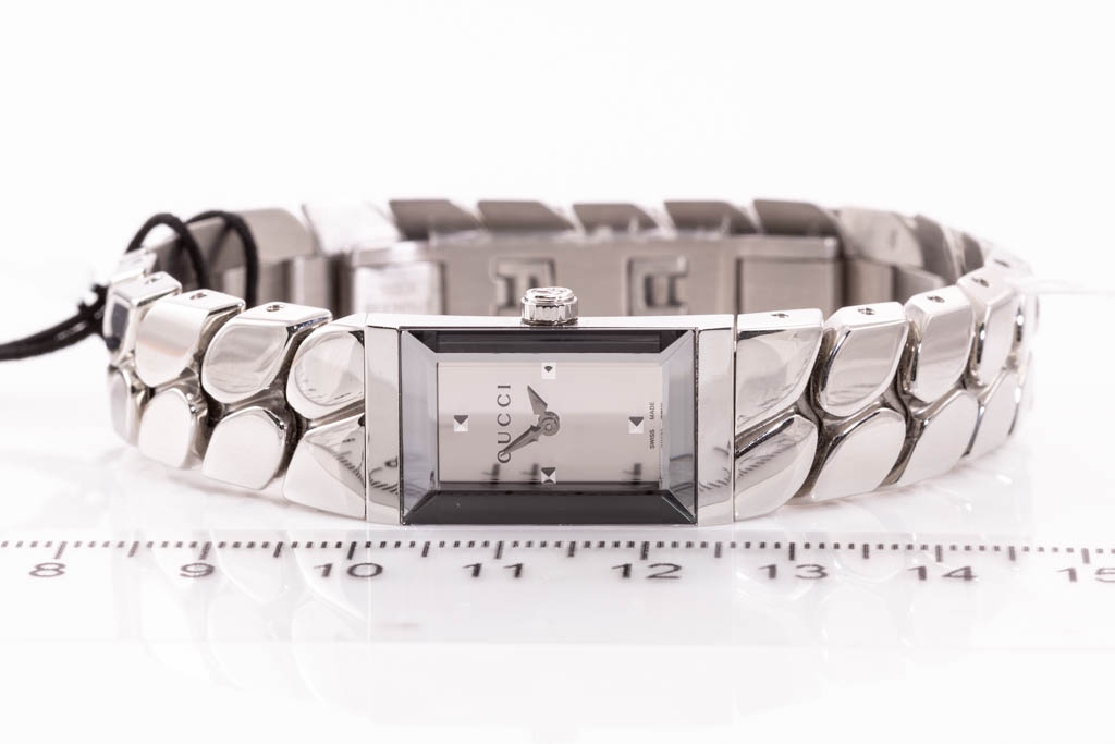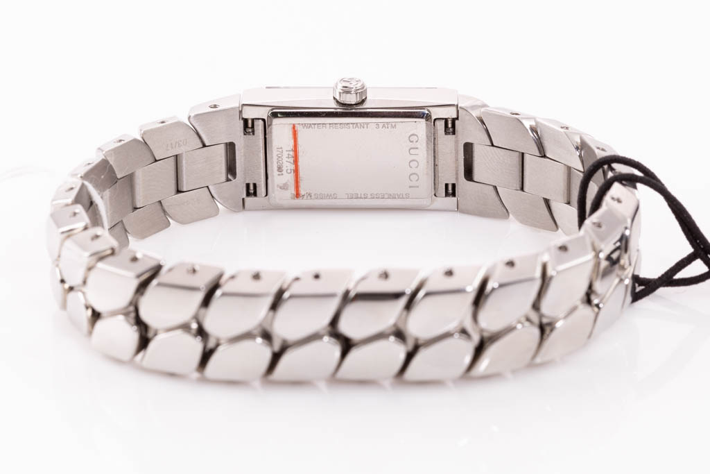 Gucci G-Frame stainless steel quartz ladies watch. Silver dial, case diameter: 25mm x 14mm, wrist size: 16cm, Swiss made. Ref# YA147501. With Gucci stainless steel bracelet and clasp. With Gucci International Warranty Certificate - the certificate is not stamped so Gucci warranty does not apply. No box provided. 3 month FSA warranty. (As new, NOTE: minor scratches on case and bracelet due to being display stock)
