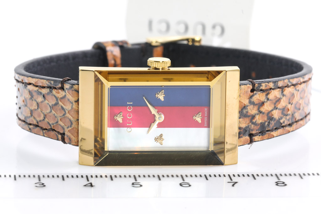 Gucci G-Frame yellow gold PVD quartz ladies watch. Mother of Pearl dial, case diameter: 34mm x 21mm, strap length: 20cm, Swiss made. Ref# YA147402. With Gucci snakeskin pattern leather strap and buckle. 3 month FSA warranty. No box provided. (As New, Note: minor scratches on case and light wear on strap due to being display stock)