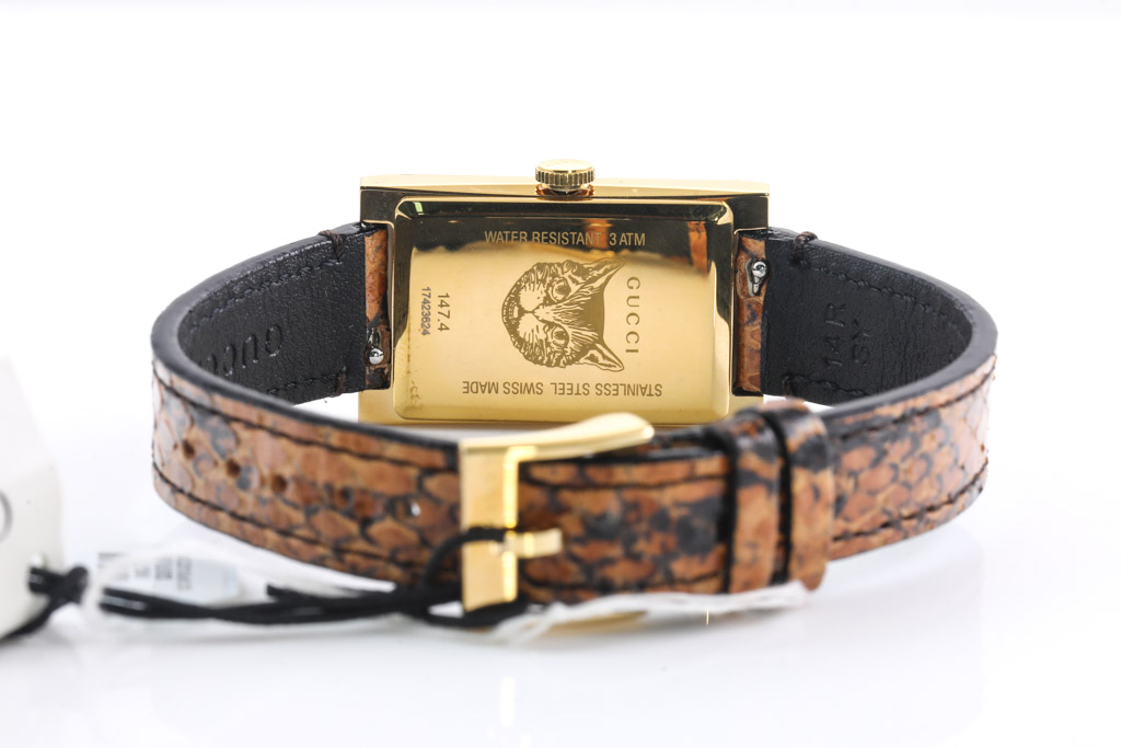 Gucci G-Frame yellow gold PVD quartz ladies watch. Mother of Pearl dial, case diameter: 34mm x 21mm, strap length: 20cm, Swiss made. Ref# YA147402. With Gucci snakeskin pattern leather strap and buckle. 3 month FSA warranty. No box provided. (As New, Note: minor scratches on case and light wear on strap due to being display stock)