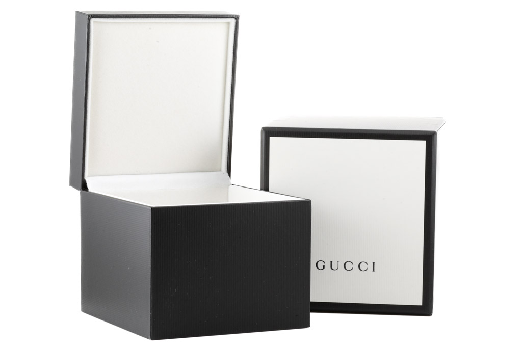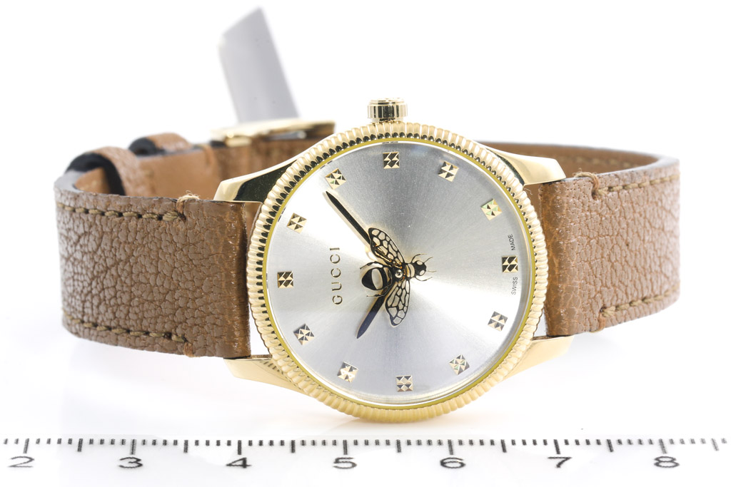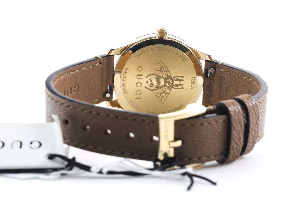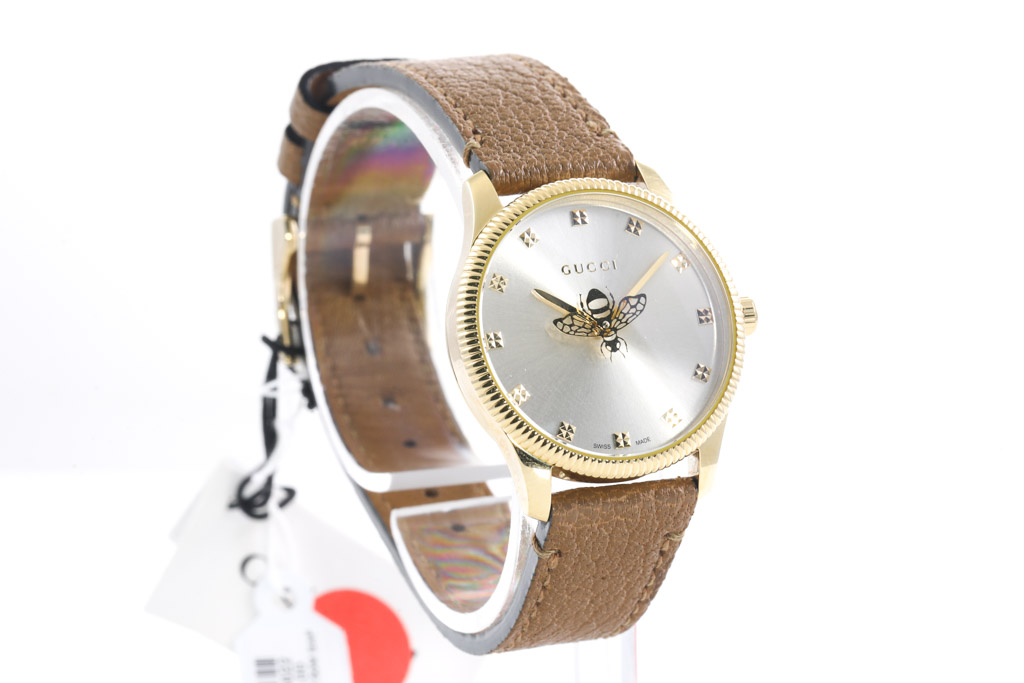 Gucci G-Timeless Gold PVD stainless steel quartz ladies watch. Champagne dial, case diameter: 32mm, strap length: 19.5cm, Swiss made. Ref# YA1265022. With Gucci brown leather strap and buckle. With Gucci International Warranty Certificate - the certificate is not stamped so Gucci Warranty does not apply. With Gucci box. 3 month FSA warranty. (As new, NOTE: minor scratches on case and wear on strap due to being display stock)