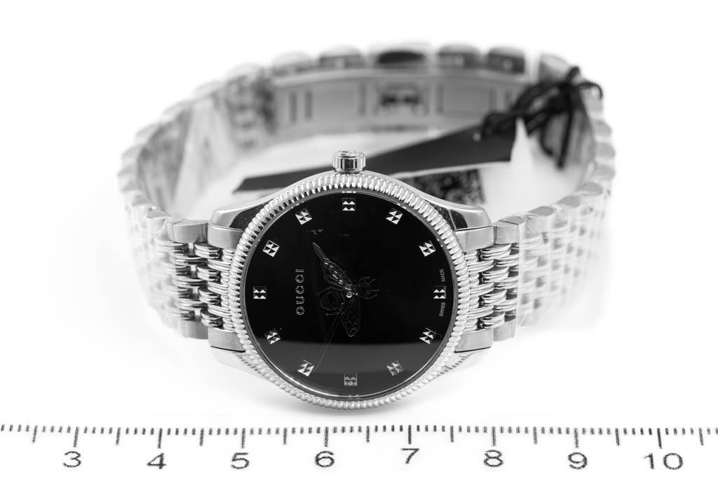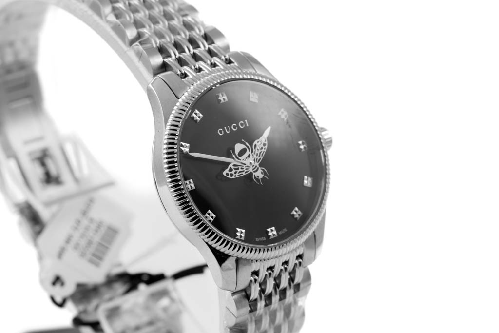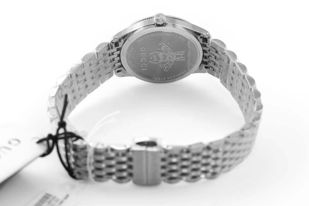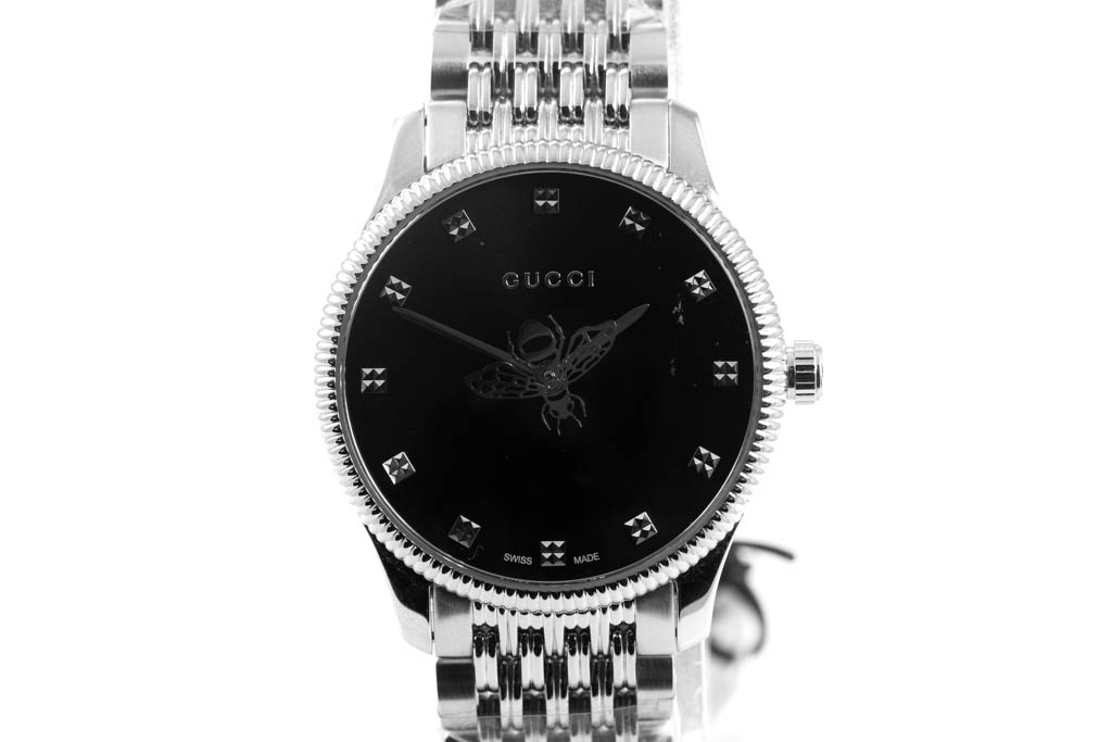 Gucci G-Timeless stainless steel quartz ladies watch. Black dial, case diameter: 29mm, wrist size: 20cm, Swiss made. Ref# YA1265020. With Gucci stainless steel bracelet and clasp. No box provided. 3 month FSA warranty. (As new, NOTE: minor scratches on case due to being display stock, bracelet in original wrapping)